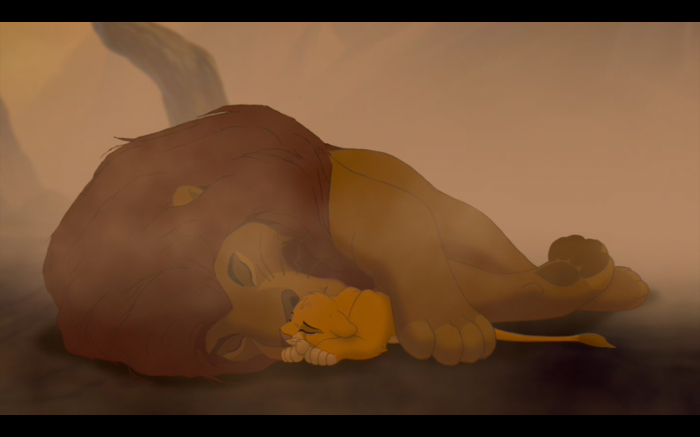 Simba watches his father die. He even goes and nestles up next to his corpse.
