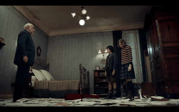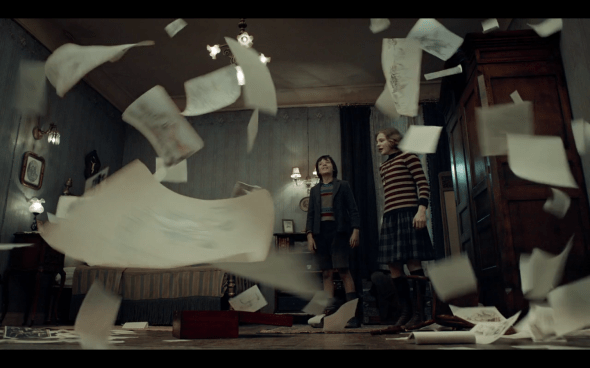 And then Méliès comes home and Hugo and Isabelle hide in the bedroom, and they find the box of all of Méliès’s sketches, which Mama Jeanne kept without him knowing. And there’s the great scene of them having to get it down without making a noise, and then the papers fly everywhere.