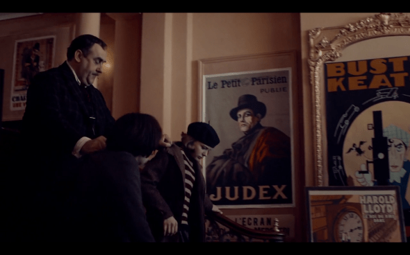 Hugo and Isabelle get kicked out of the theater just as we see the clock part happen. And as they get kicked out, we get more movie posters to look at: