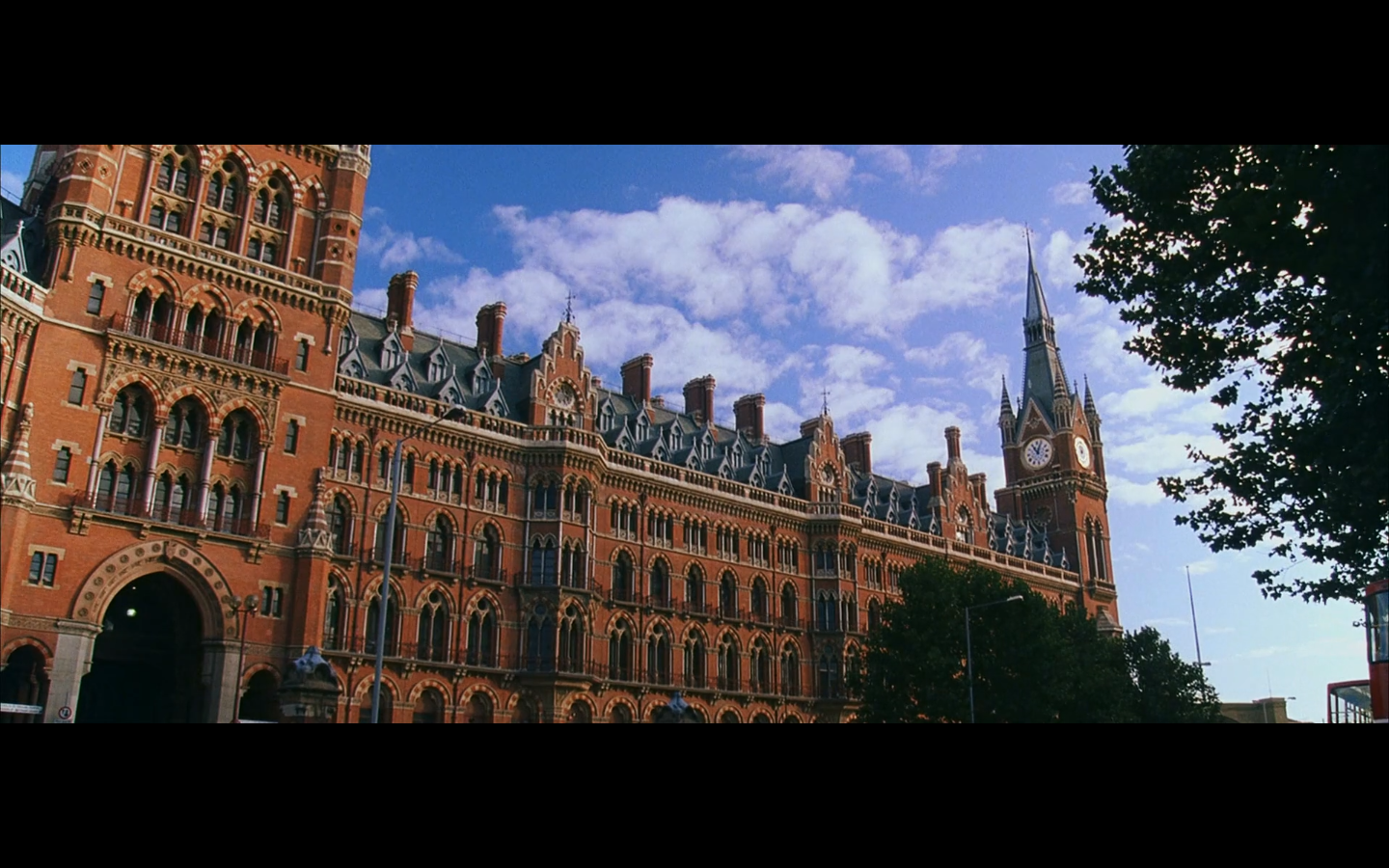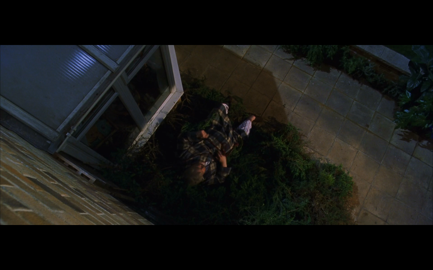 We open in the sky, and after an unnecessarily complicated crane shot end up at –