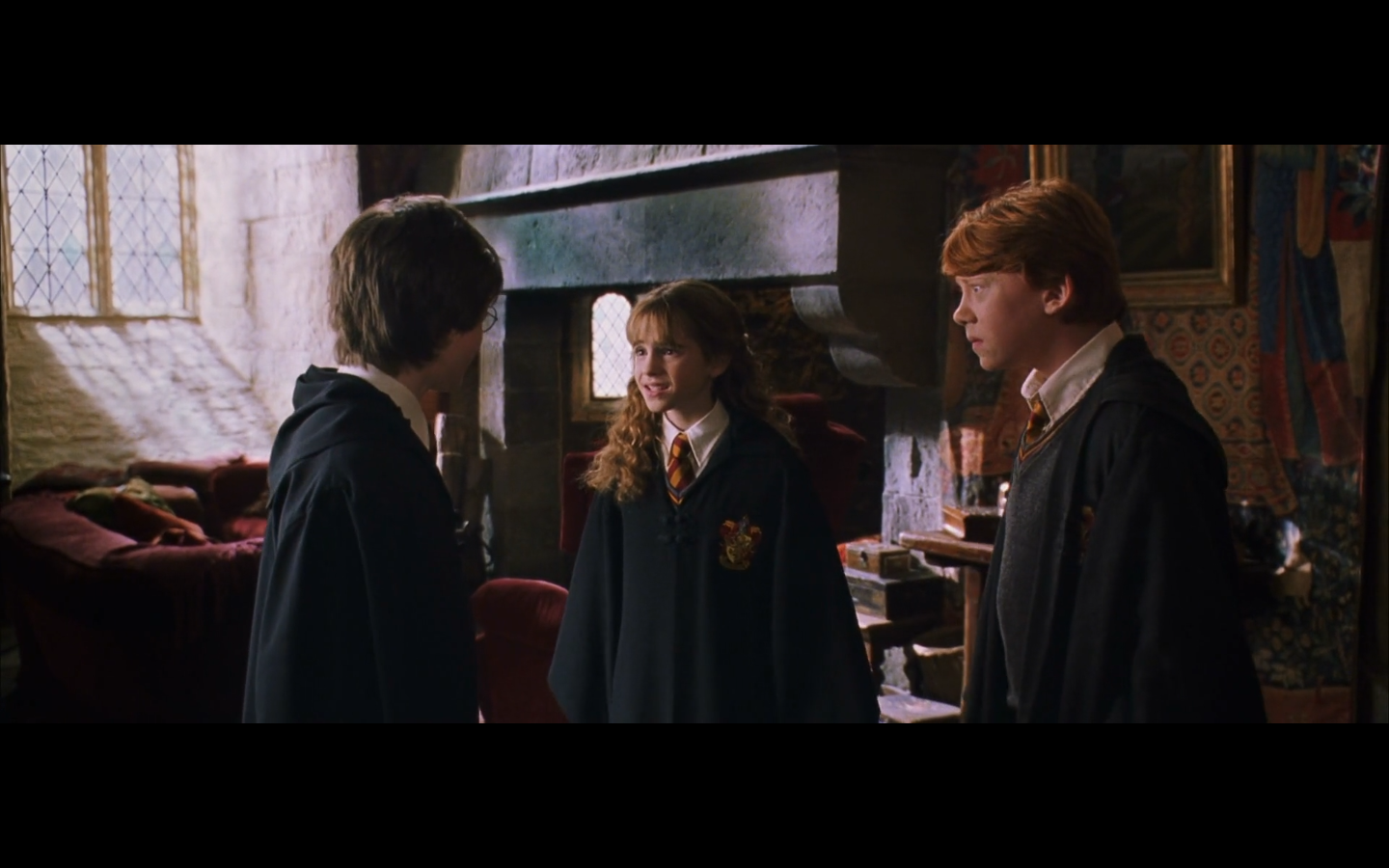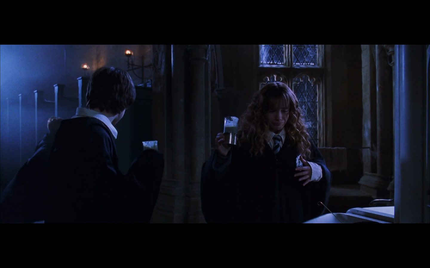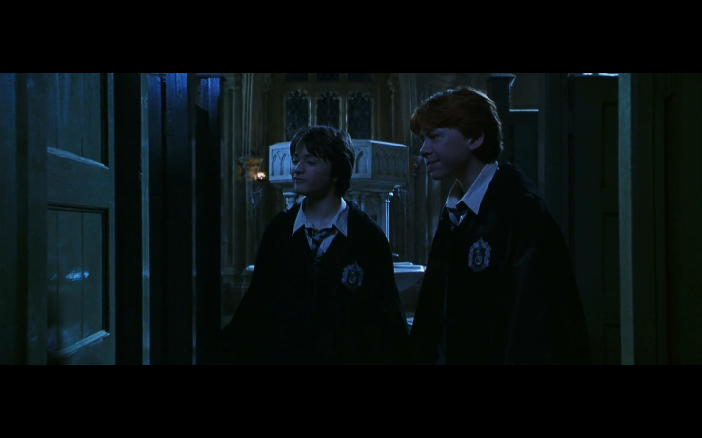 Most people who stock up on food from the dining hall are usually doing it because they’re not planning on going to eat the next day, or the next two days and are planning on locking themselves in their room and doing work all weekend. But one — these two are clearly not that type (Malfoy will back this up in a minute), and two — it’s fucking cupcakes. Unless this is meant to be the equivalent of actual food, since this is actually all we ever see them eat in most of these movies. I don’t get why you’d need that many cupcakes to tide you over until the morning when you’ve probably just gorged yourself on them for the past hour.