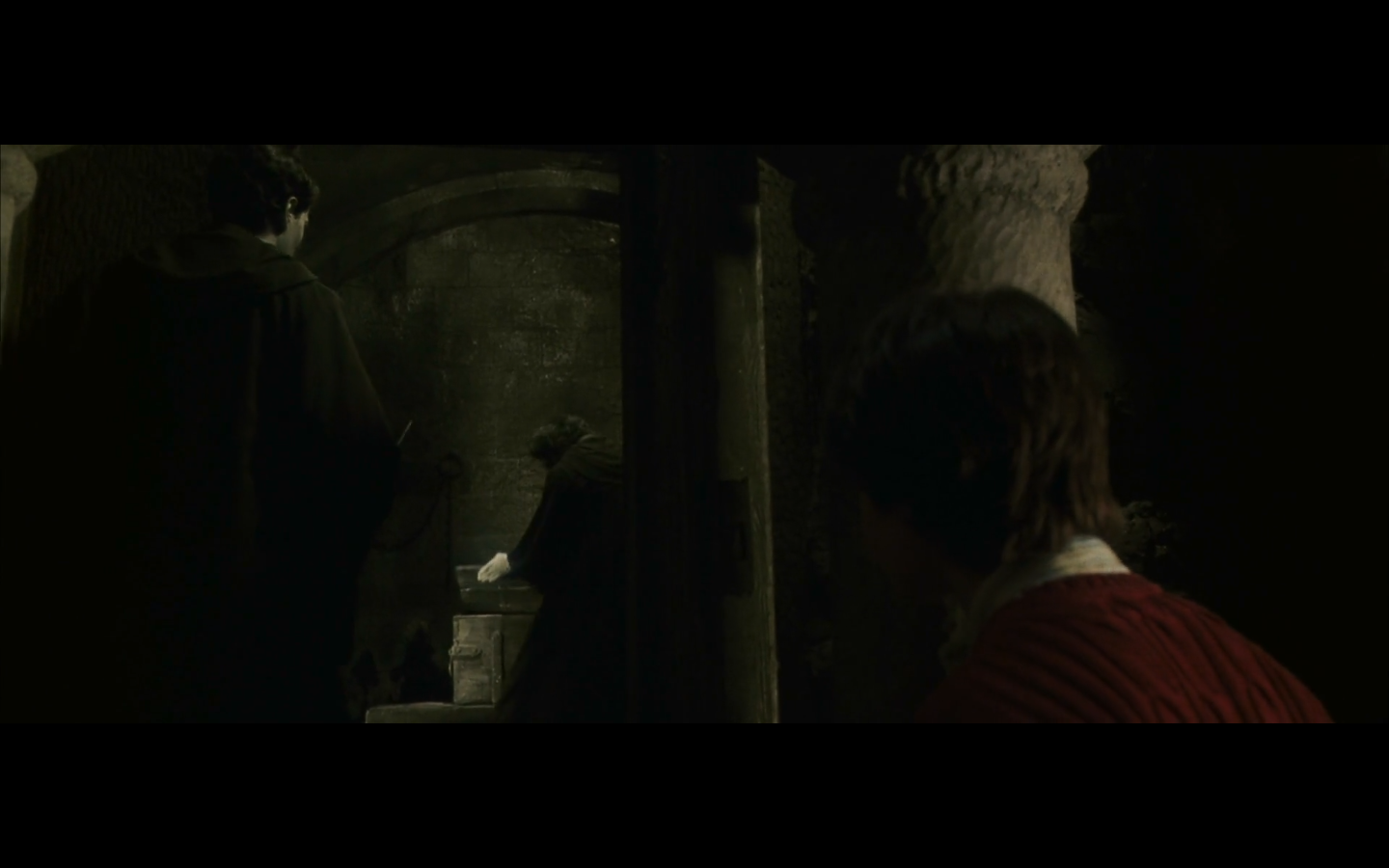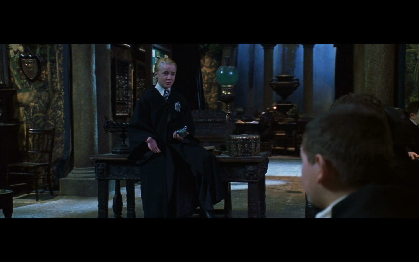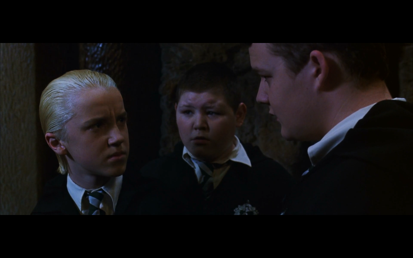 They go down to dungeons, only to get caught by Percy. But then Malfoy shows up. He asks Harry/Goyle why he’s wearing glasses (not once realizing they’re Harry’s). Harry/Goyle says for “reading.”