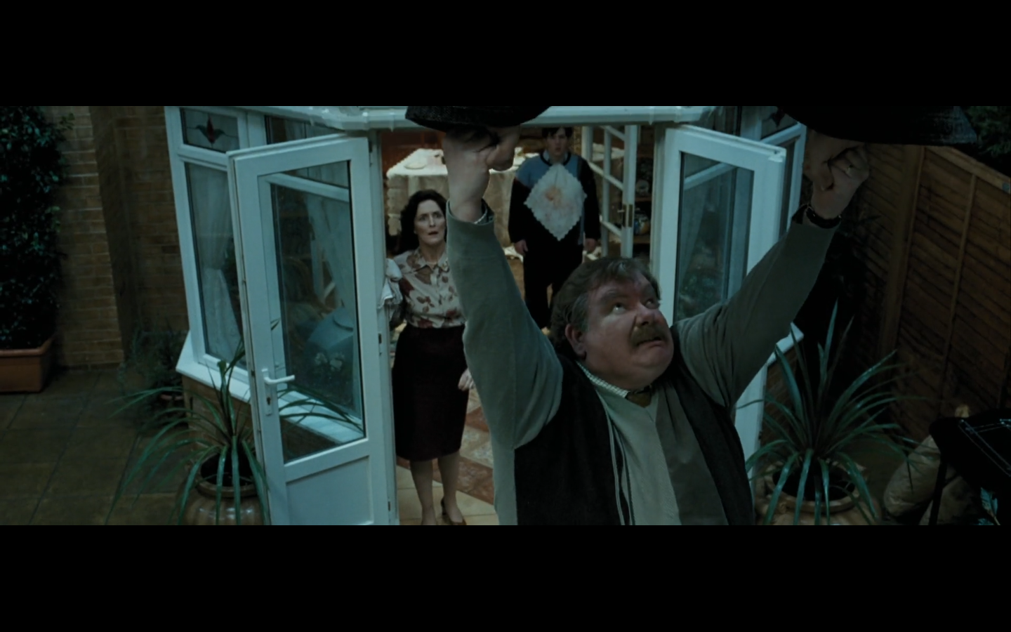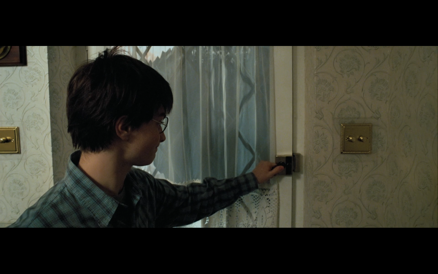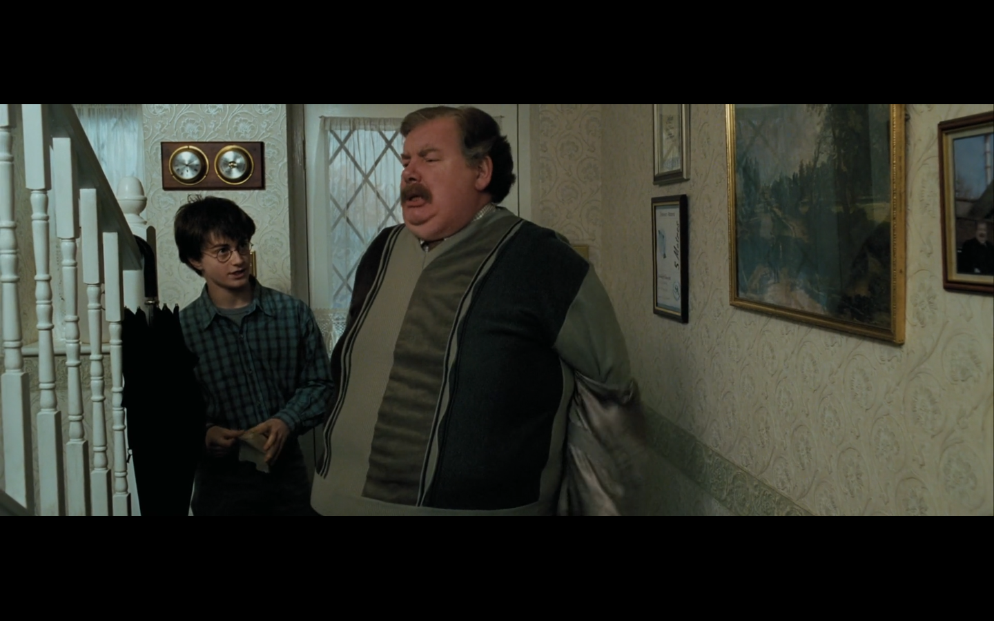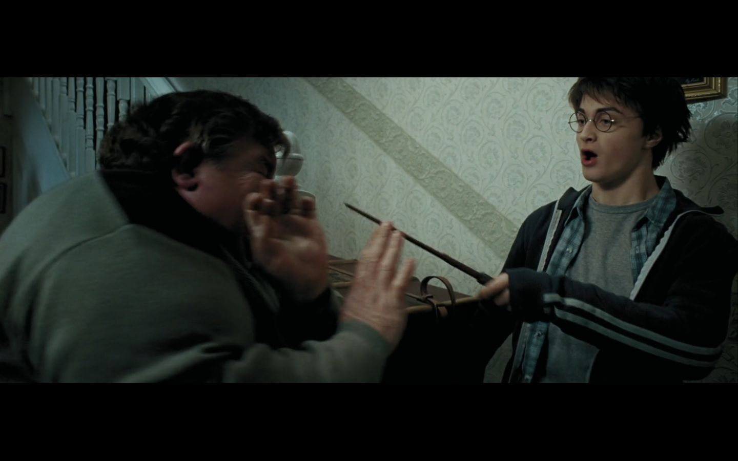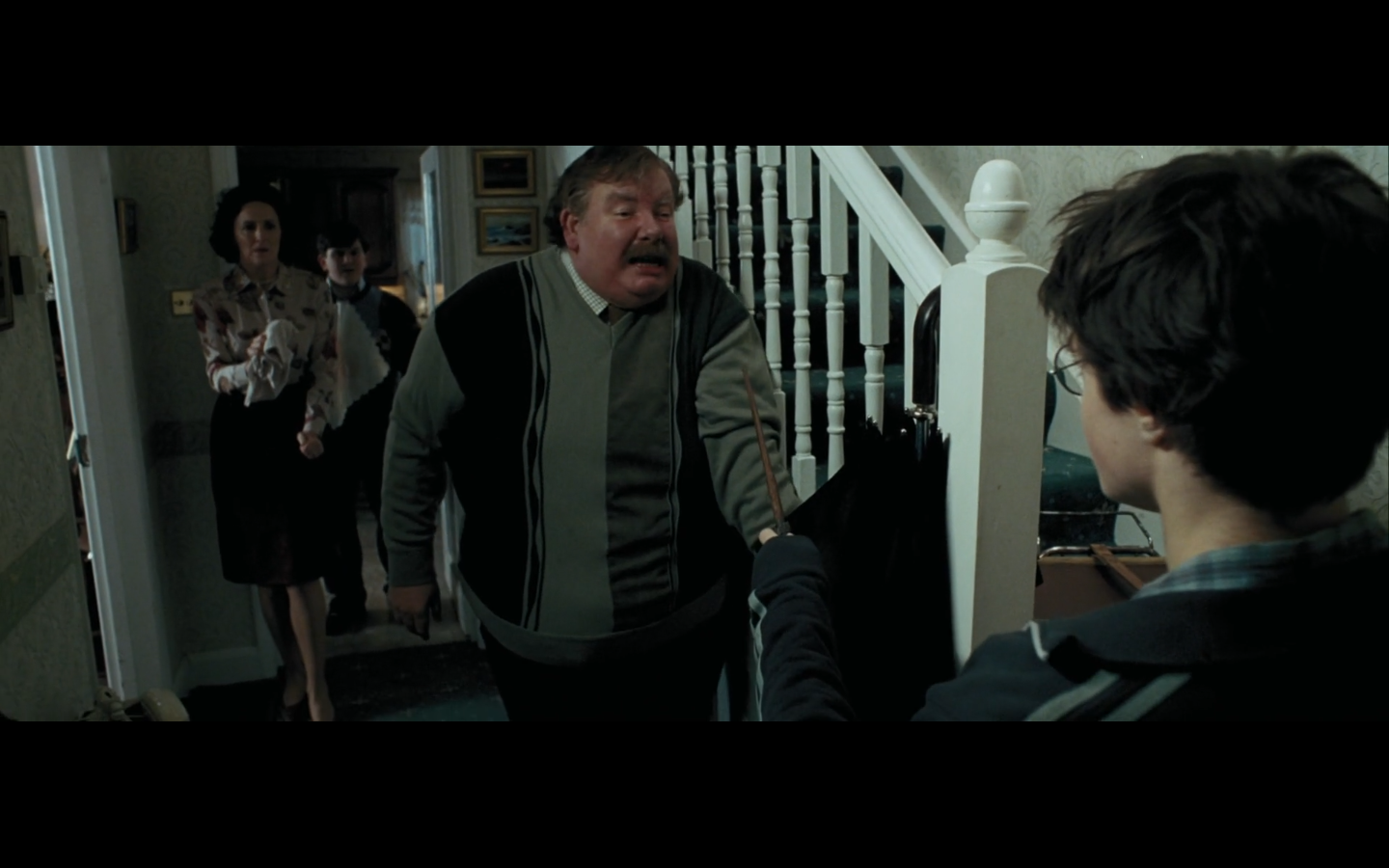 My other question here is — what exactly did Vernon hear? Harry seems to be whispering his spells, so unless the idea is he’s practicing them (but even so, how thin are these walls that they can hear him whispering like that), I don’t really get why Vernon would be coming in like that.