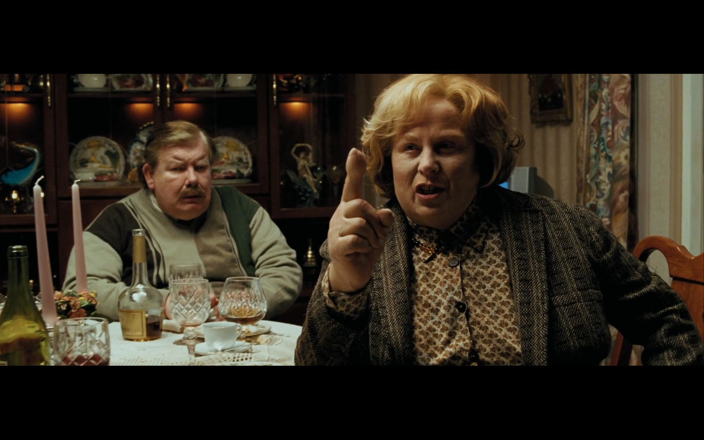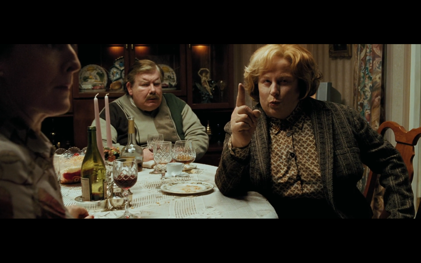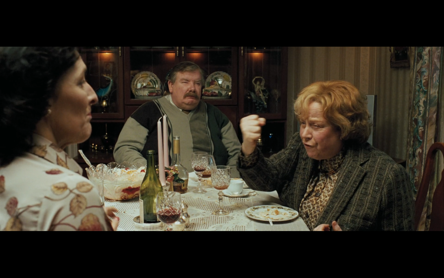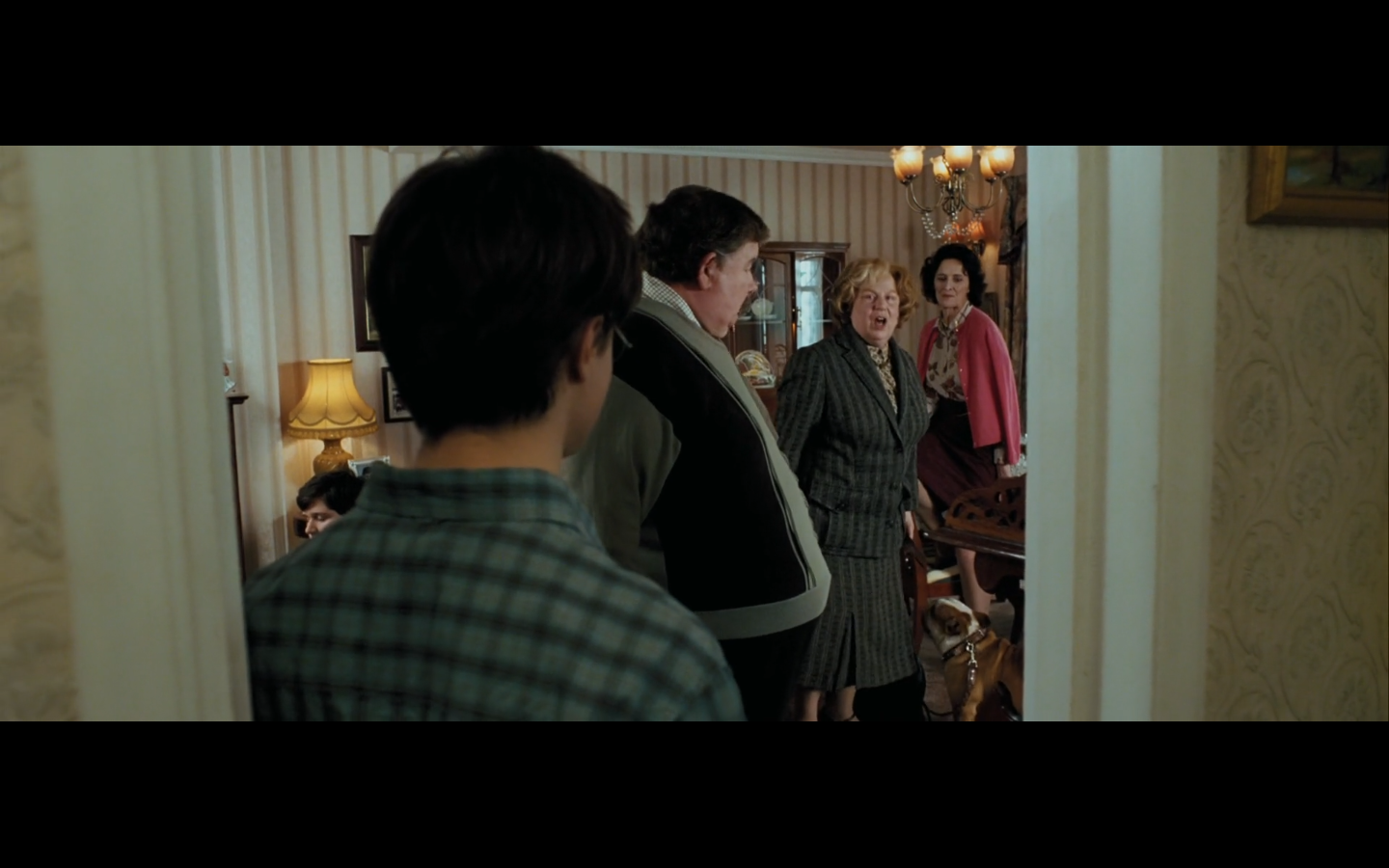 Vernon’s sister, Marge arriving. She’s played by Pam Ferris, who also played Trunchbull in Matilda.