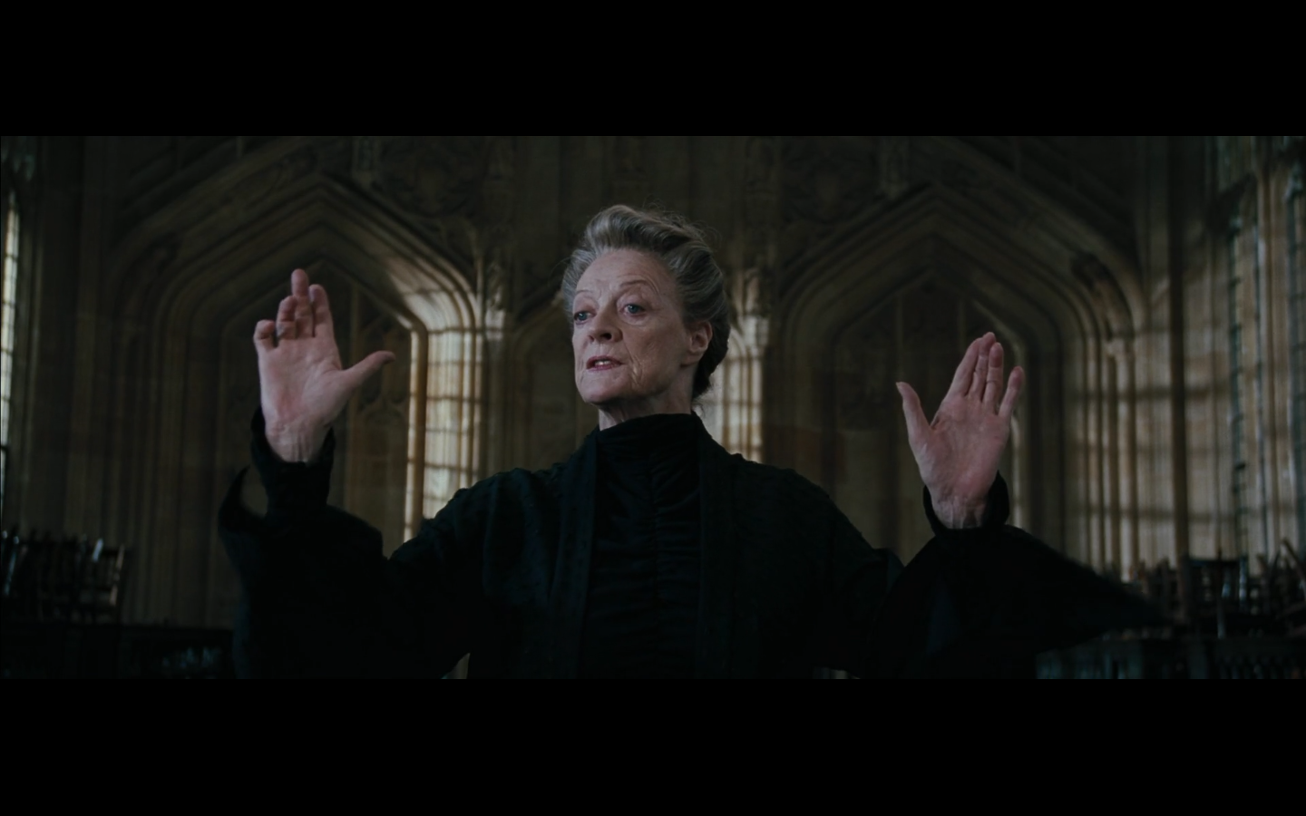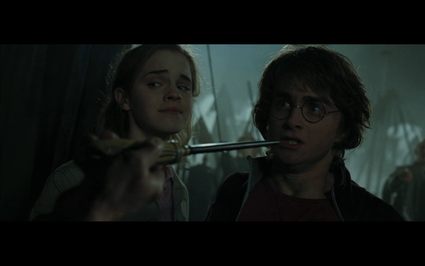 And I put both in here because I do feel like they’re basically the same and are both incredibly powerful. I stuck with the first one because I felt it was easier to pick out what scene it was from. To me, the more powerful one is the second one. The reason for that is — the first image is Moody (technically Crouch, but we all should understand that) going up to Hermione after she tells him to stop torturing the spider in front of Neville and making her tell him the final Unforgivable curse. And the second shot is the one immediately after it, when she refuses to do it. Which I love because he knows she knows what it is and he’s making her say it just to fuck with her, because he knows that she knows he’s going to do it. And she just goes, “No… I’m not gonna do it,” which is just terrific character work all around. It’s such a powerful moment in what’s one of the best scenes in this entire franchise.