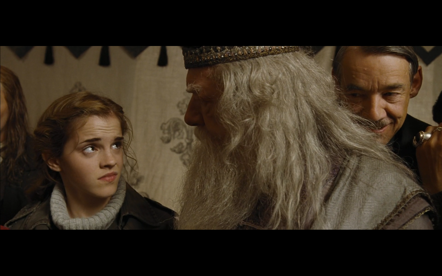 This moment is great on top of the look she’s giving. She’s in the tent wishing Harry good luck, and Dumbledore shows up and just starts talking and realizes, “Wait… Hermione? What the fuck are you doing here?” And she’s just like, “Yeah…” and slowly backs away as the scene continues. It’s terrific.