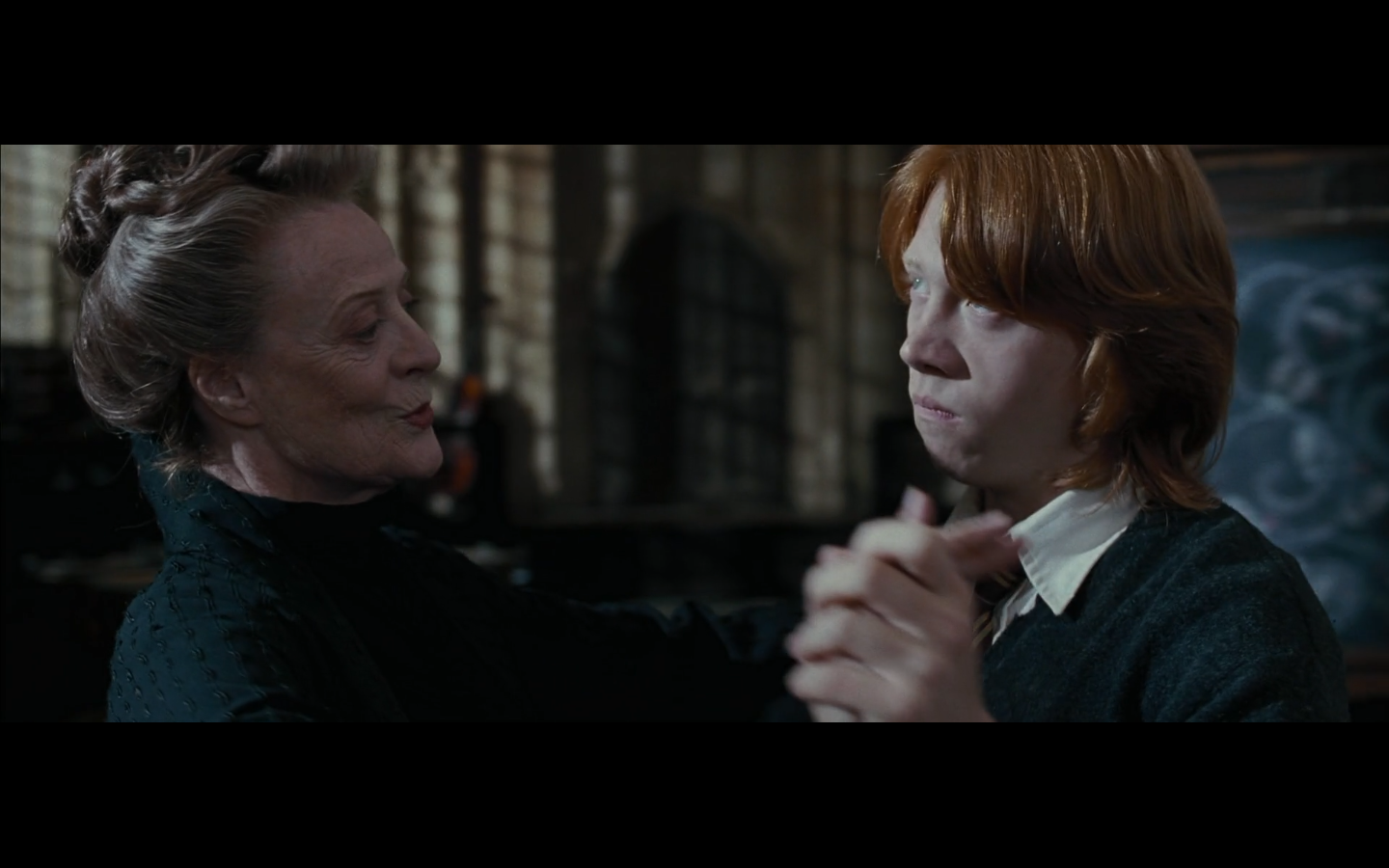 Colin chose the first image, which is really great. Prepare for trouble and make it a double. And I chose the second one, because that moment is so badass. Ron asking George who he’s going with to the ball after George was getting on his case about not being able to find anybody, and George at the spur of the moment, just to show that he could, throws a paper at Angelina Johnson and silently asks her to go with him, and she says yes. Just like that. And then he turns back to Ron like, “Nice try, asshole.” It’s so great. George is a boss in these movies.