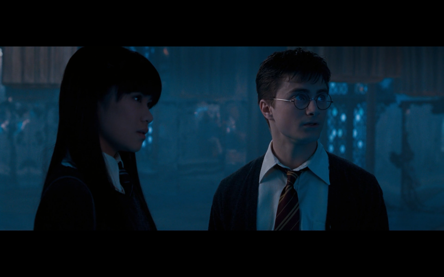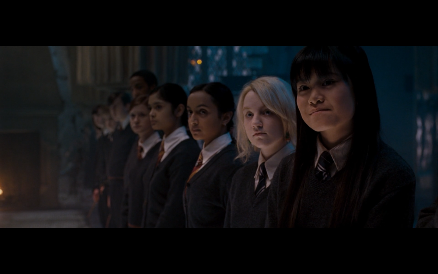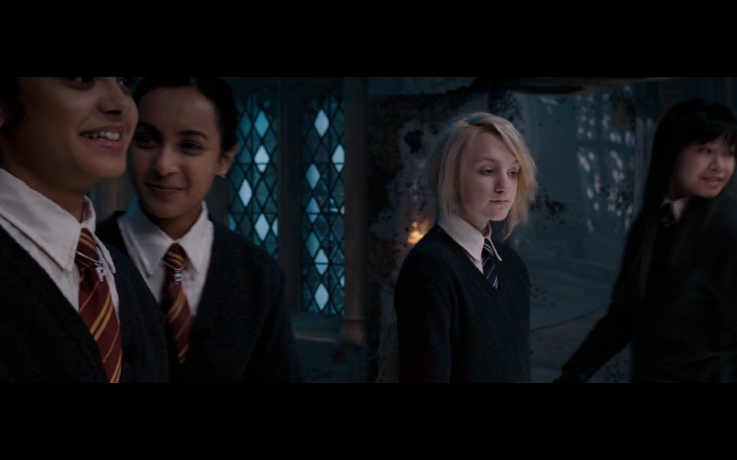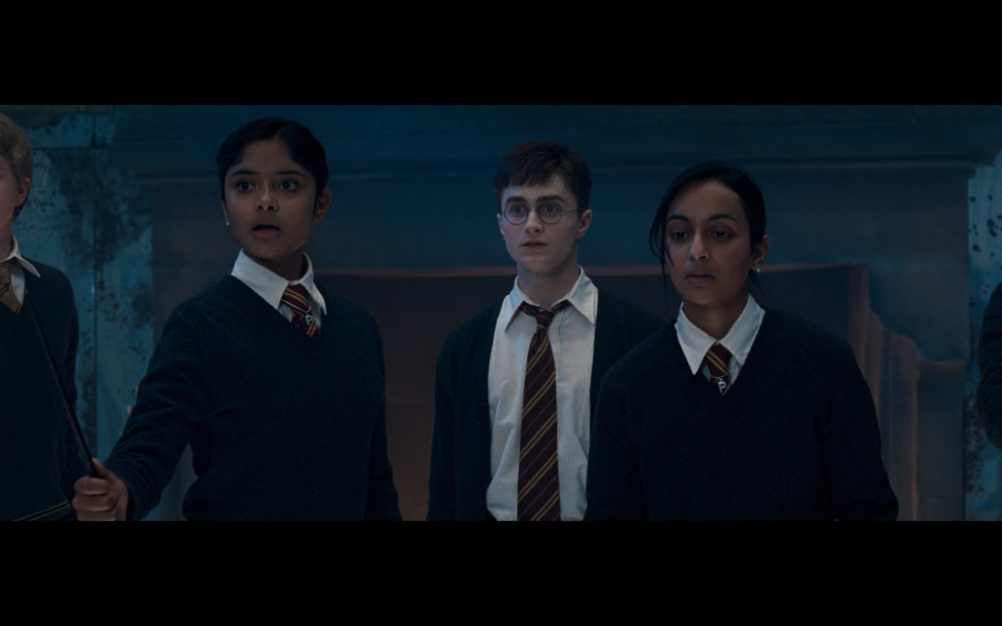 Noticed an error here. See the twins? They’re both wearing Gryffindor ties, but Padma’s a Ravenclaw. Padma (on the right) should have a tie like Cho’s. This is a consistent error in the films. They clearly didn’t think about it during filming, even though Padma has a Ravenclaw tie on for the promo photos. Oops.