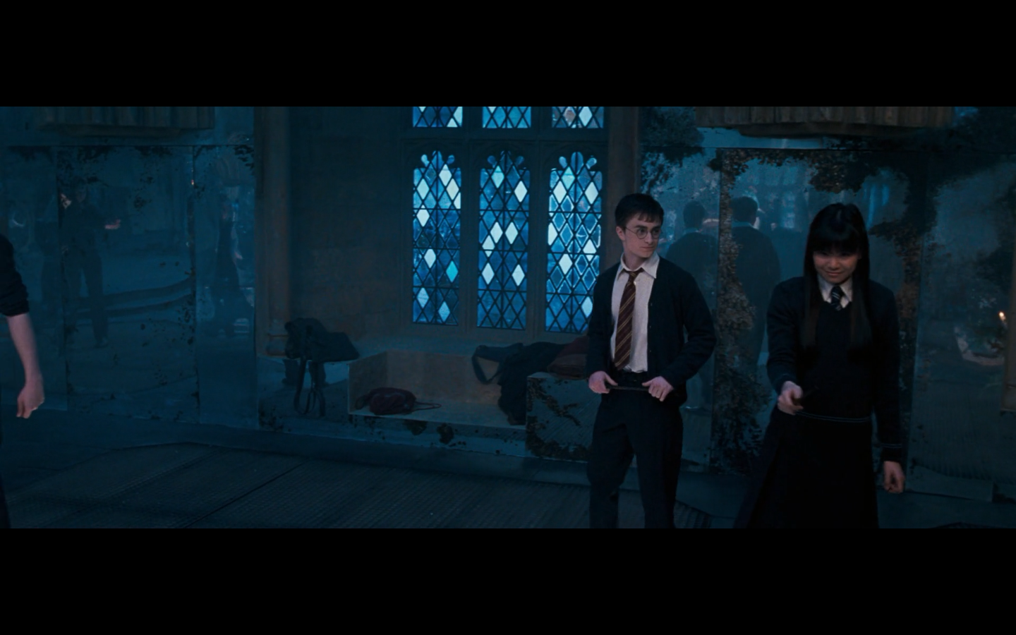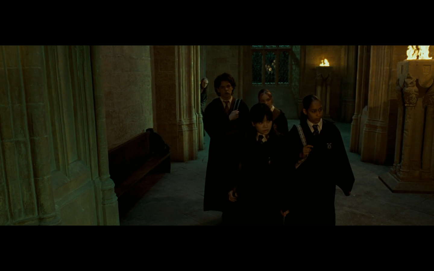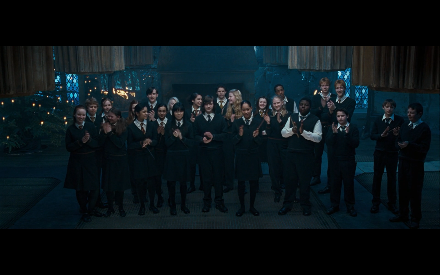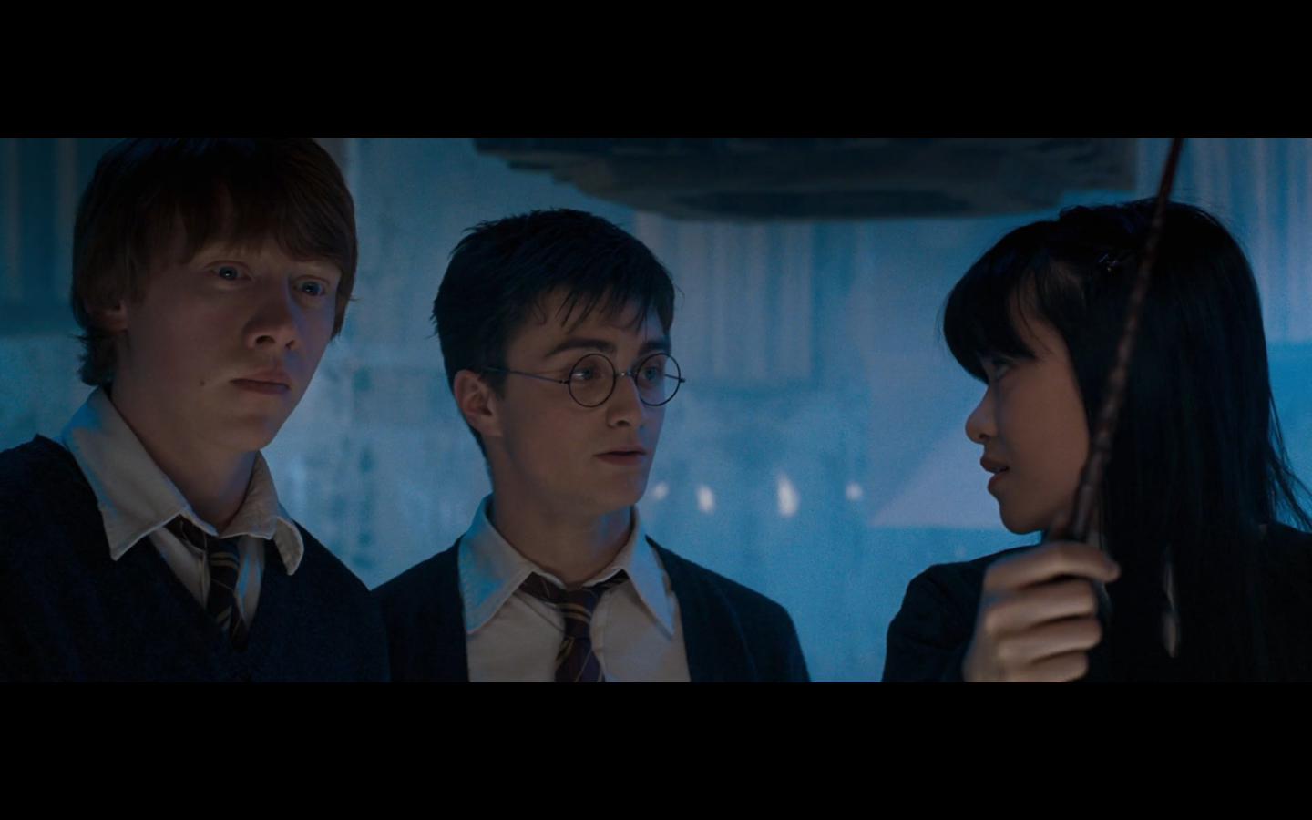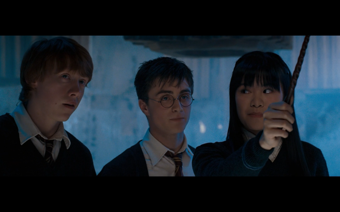 Noticed an error here. See the twins? They’re both wearing Gryffindor ties, but Padma’s a Ravenclaw. Padma (on the right) should have a tie like Cho’s. This is a consistent error in the films. They clearly didn’t think about it during filming, even though Padma has a Ravenclaw tie on for the promo photos. Oops.