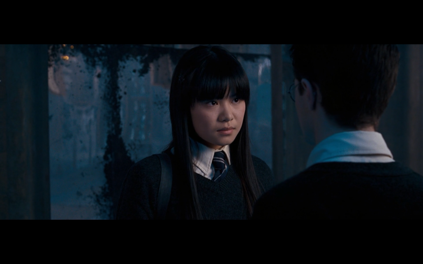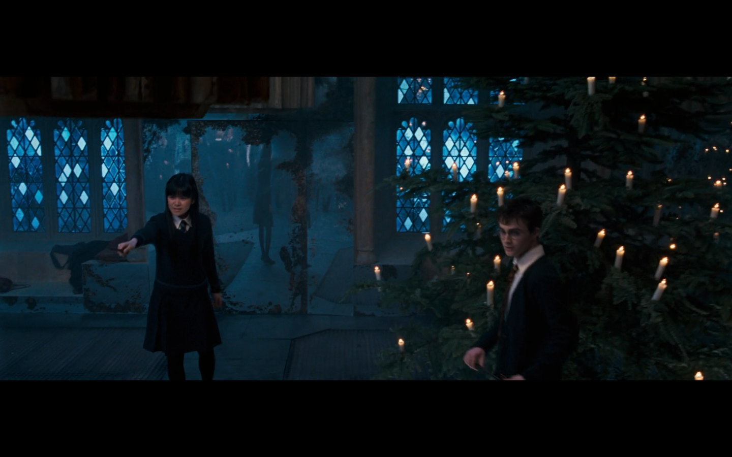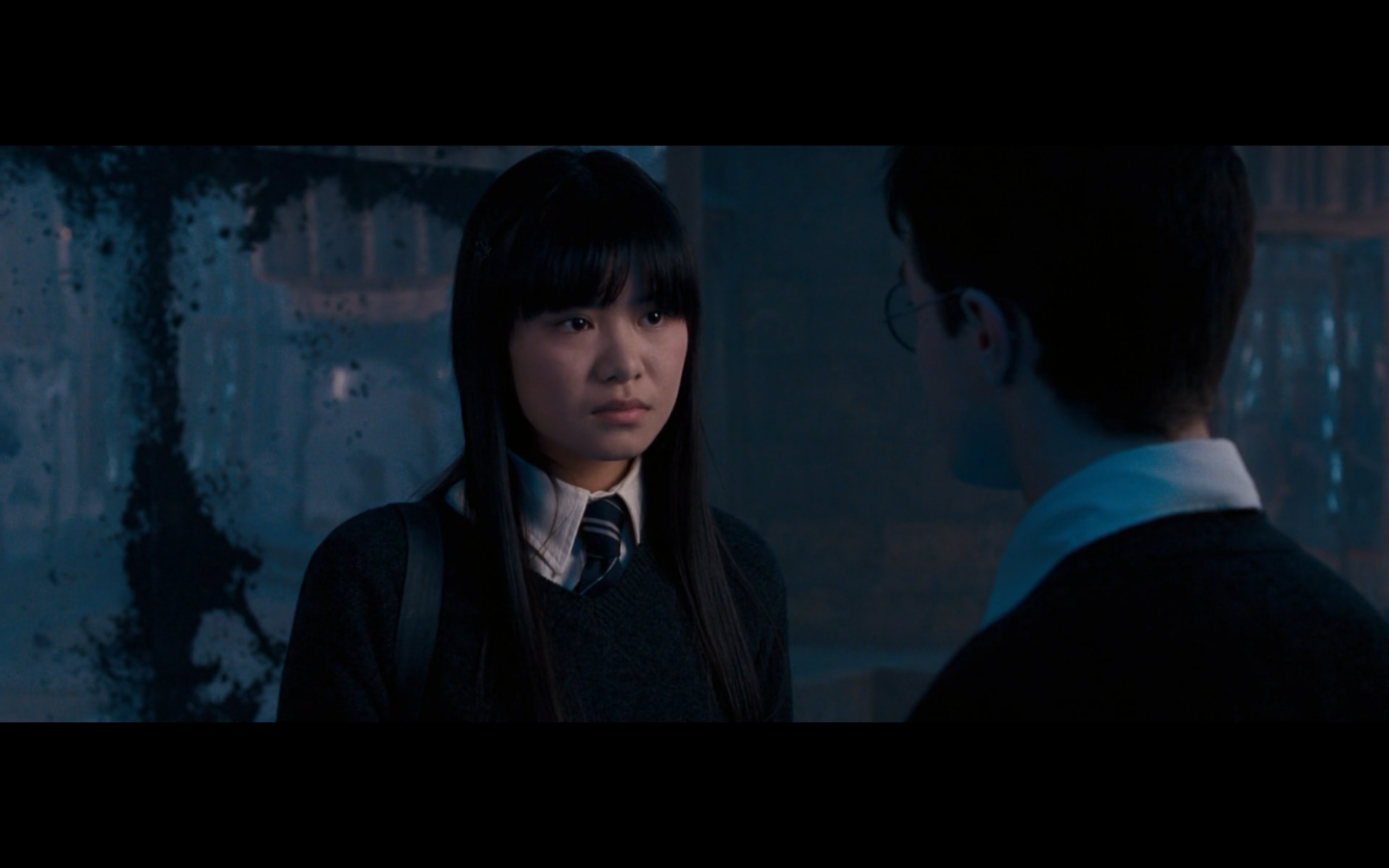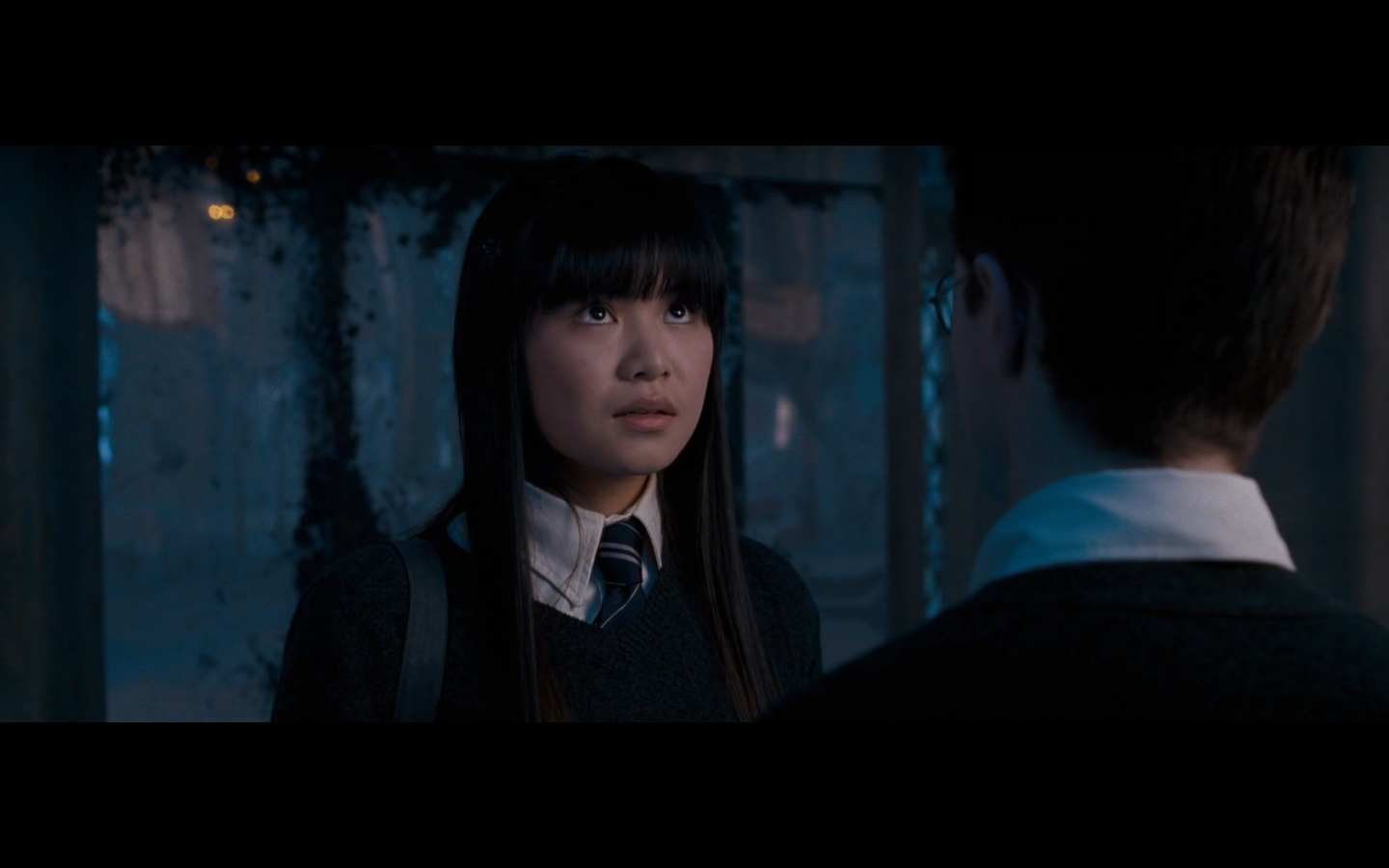 Noticed an error here. See the twins? They’re both wearing Gryffindor ties, but Padma’s a Ravenclaw. Padma (on the right) should have a tie like Cho’s. This is a consistent error in the films. They clearly didn’t think about it during filming, even though Padma has a Ravenclaw tie on for the promo photos. Oops.
