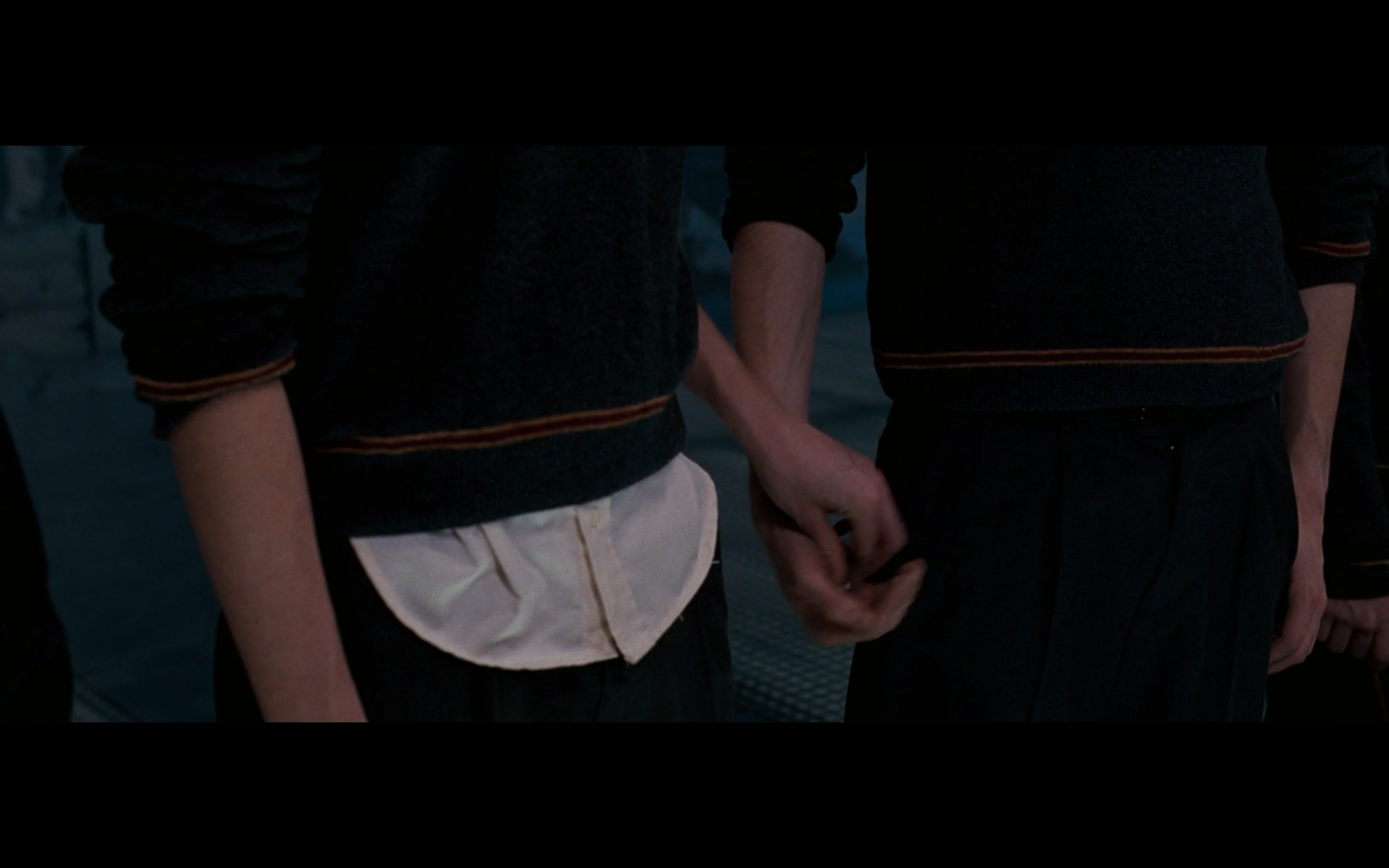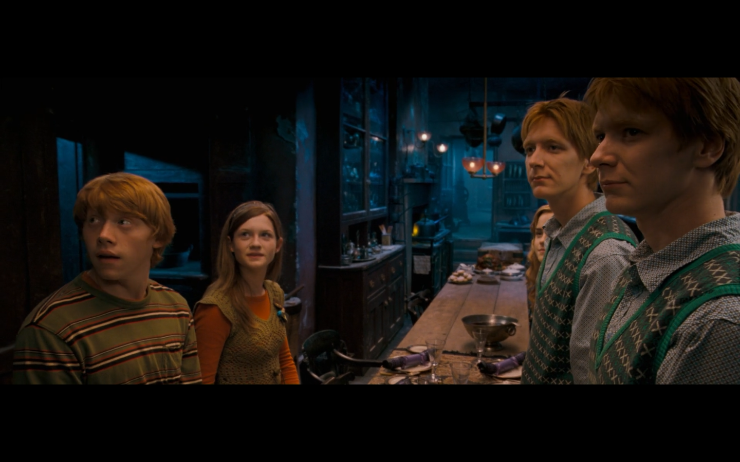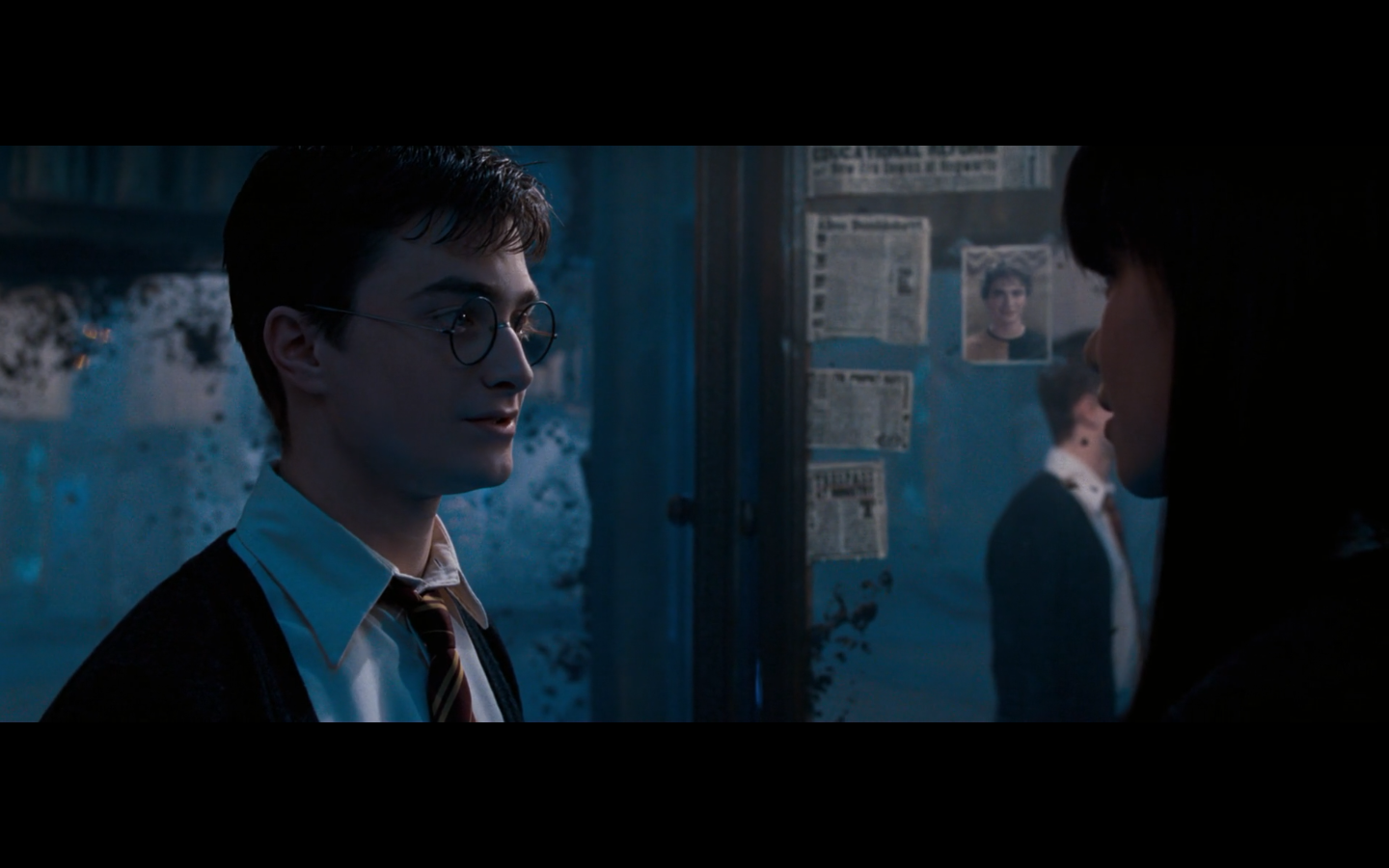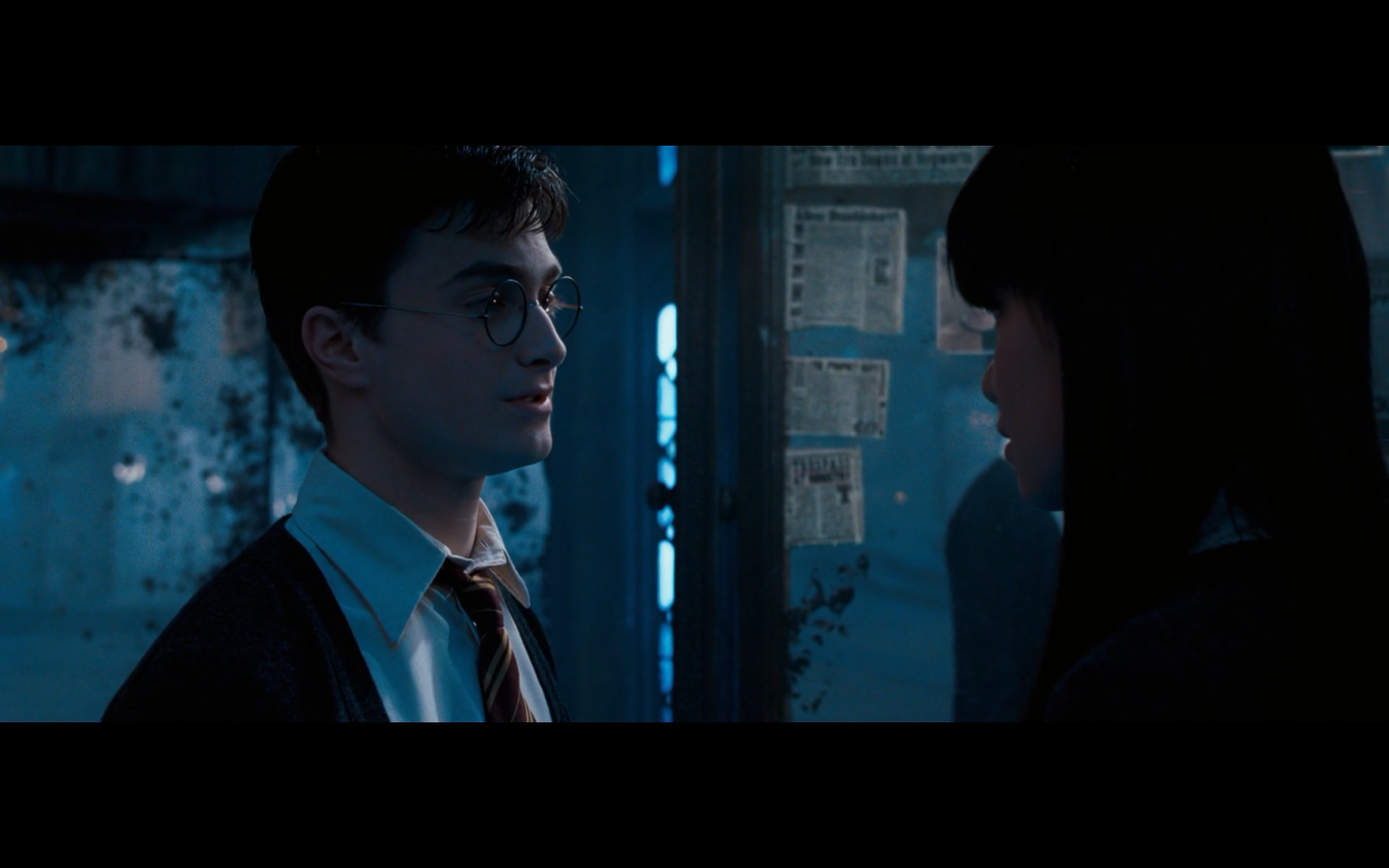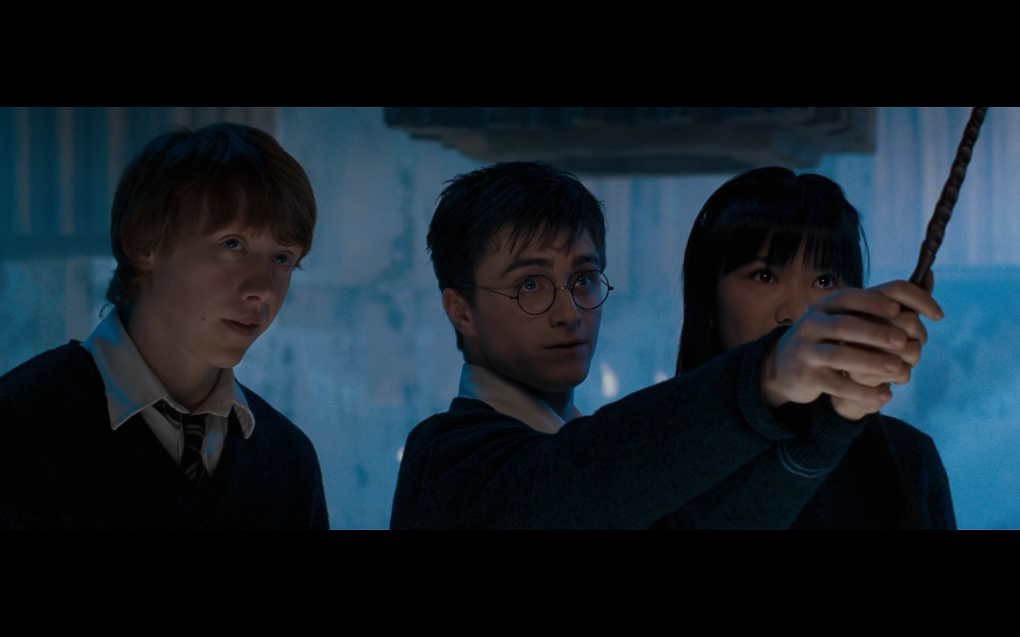 Noticed an error here. See the twins? They’re both wearing Gryffindor ties, but Padma’s a Ravenclaw. Padma (on the right) should have a tie like Cho’s. This is a consistent error in the films. They clearly didn’t think about it during filming, even though Padma has a Ravenclaw tie on for the promo photos. Oops.