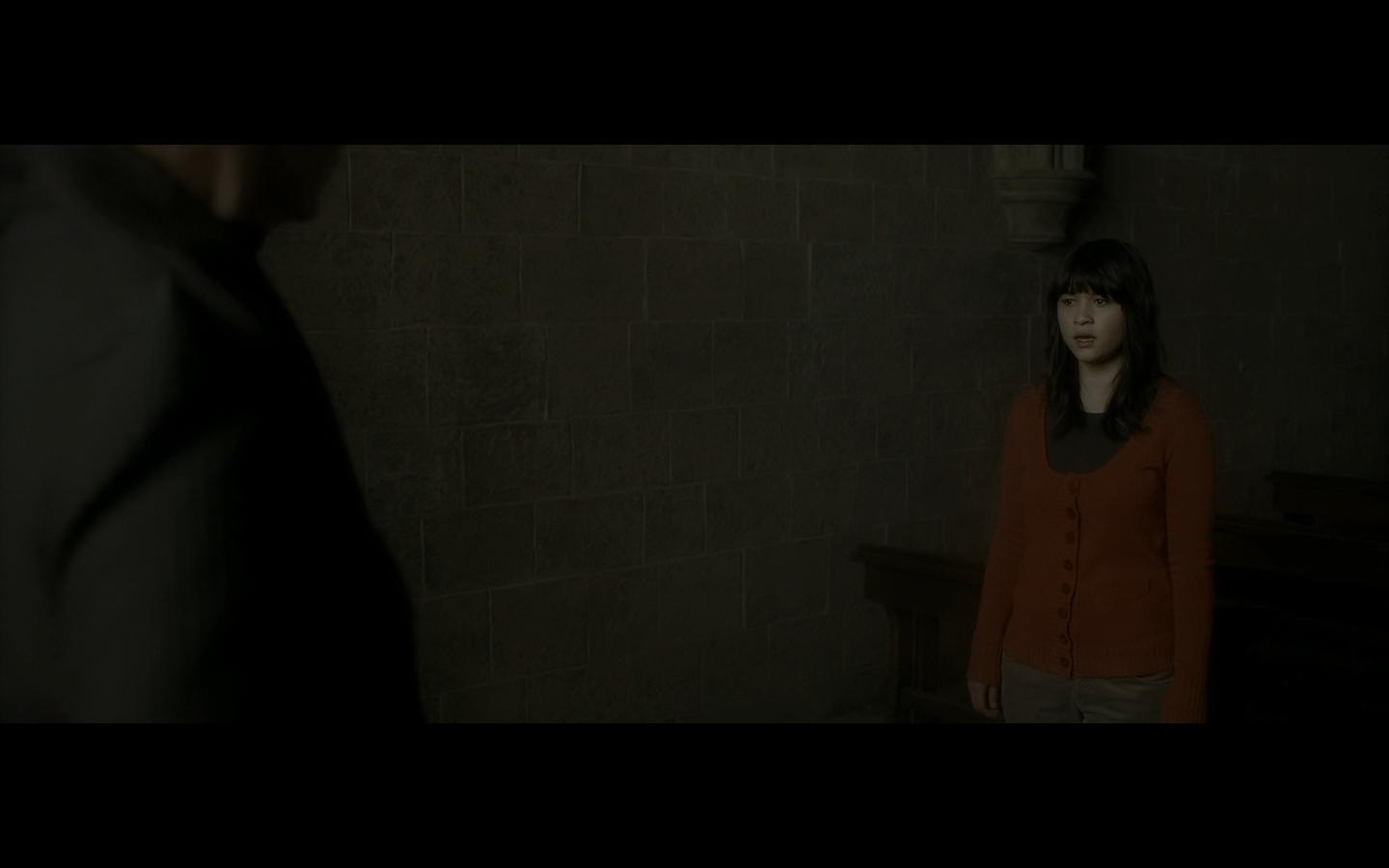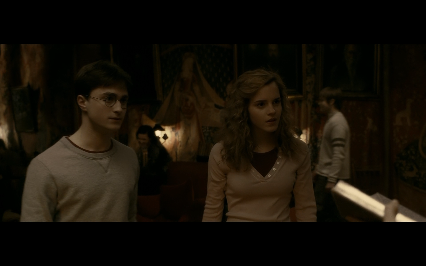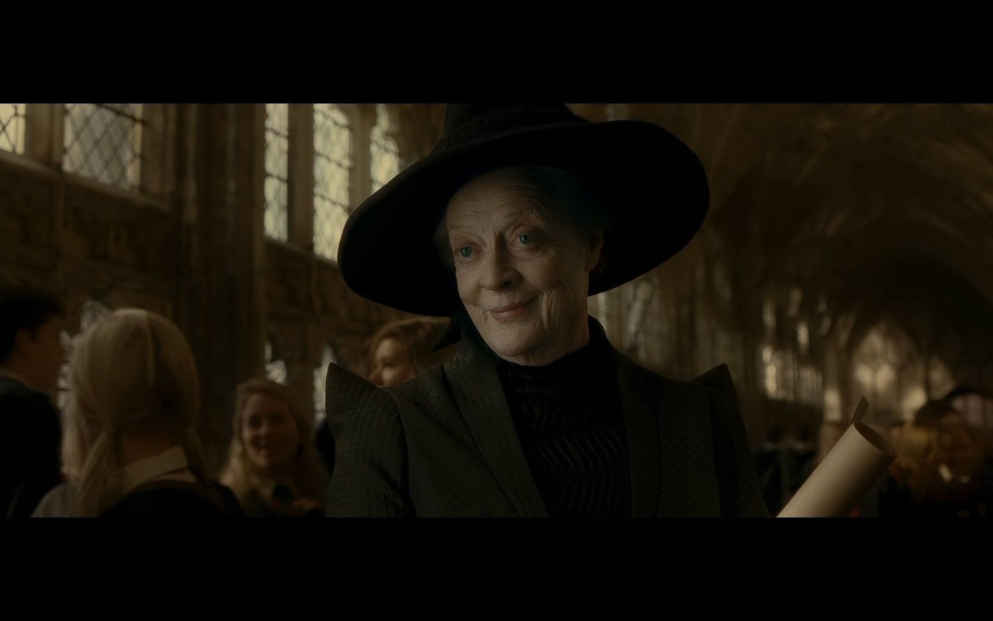 Also, it’s kind of weird how Maggie knows exactly what they got on their potions O.W.L.s. Do the heads of the houses know exactly what their students get on their exams? You have to figure Hogwarts has a base figure of 400-500 students, right? Looking at those Great Hall wide shots, you have to figure at least 100 kids in each house, and that’s being lenient and skewing lower. It seems about a hundred kids a year (after deaths and drop outs and expulsions and things like that) — that’s what that original group from the first movie looked like — sorted over four houses. So you figure 25-30 kids per year. And each fifth year takes, what, five or six O.W.L.s? You mean to tell me, that out of a base figure of at least 125 different test scores (and that’s assuming she’s only keeping track of the previous fifth years and isn’t keeping track of the older kids’ scores for college applications and stuff — which, more on that in a second), she’s able to pull two random ones? Is she a numbers savant? Can she count toothpicks? Did she used to work for a bookie? How does she know both Harry’s and Ron’s potions O.W.L. score (not to mention knowing the exact potions class he can take is being taught right now)? Maybe you were right about Dumbledore having a hand in this. That’s kind of a lot of random information to just have at the ready.