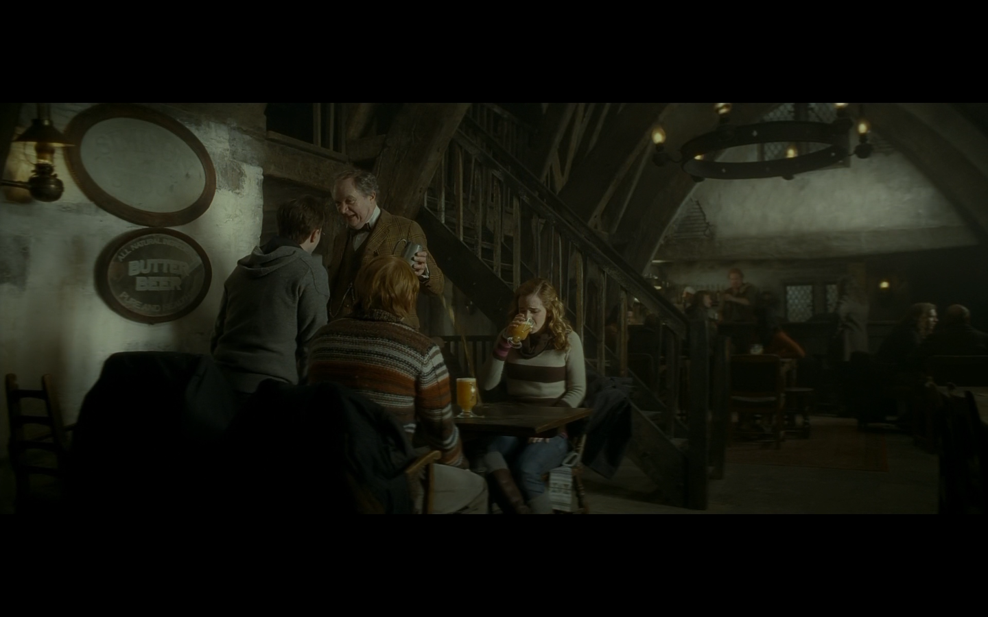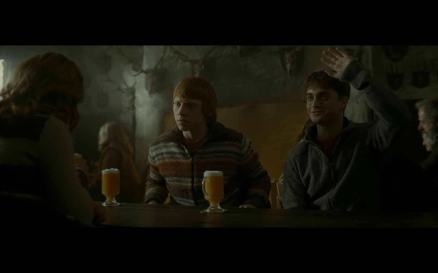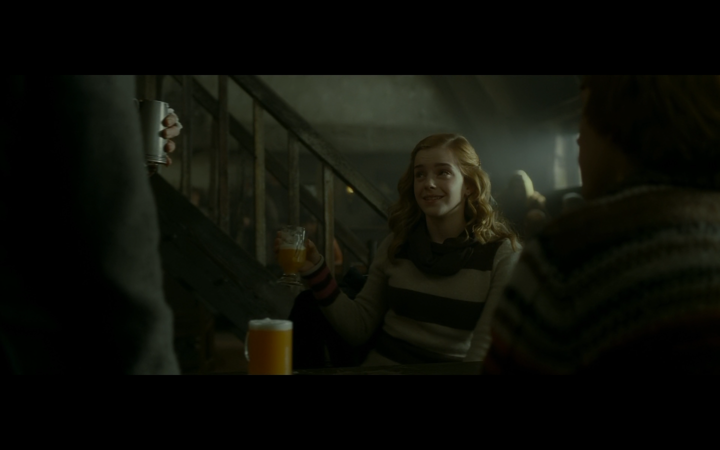 Hermione’s the only one drinking. Remember in the first movie when Ron says, “She needs to get her priorities in order?”