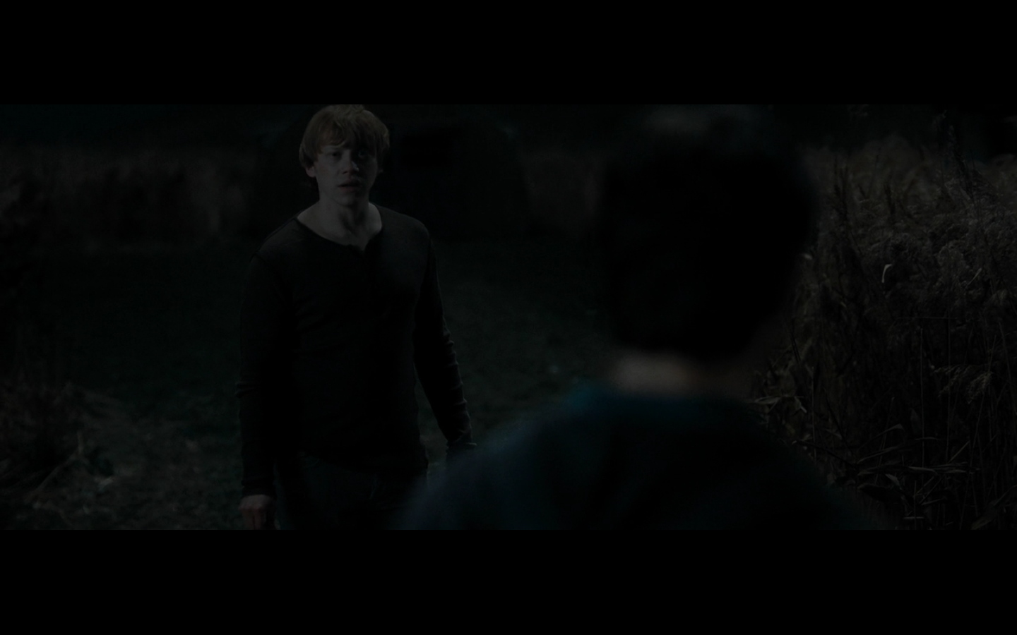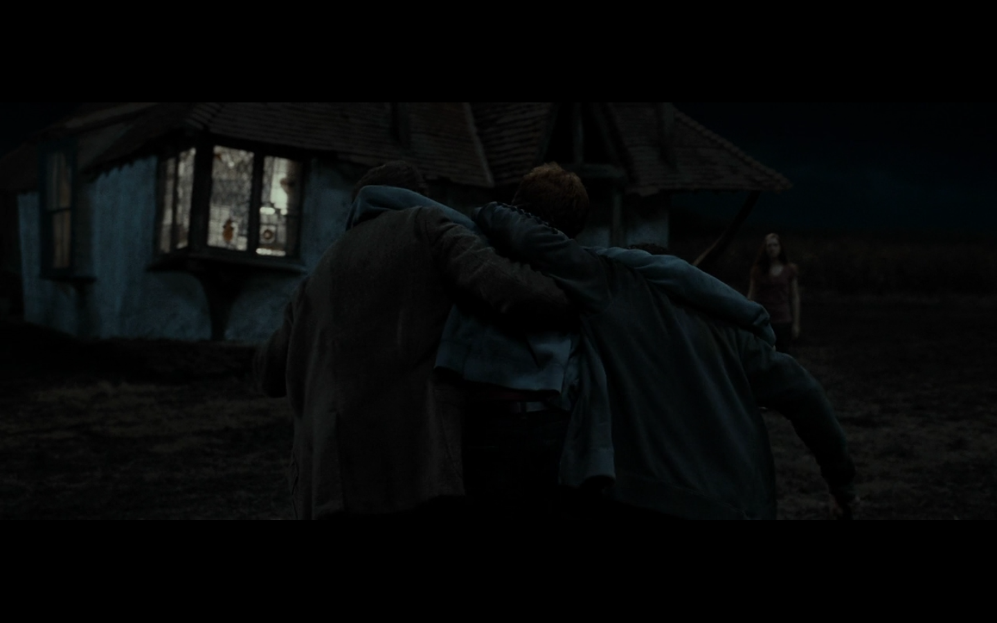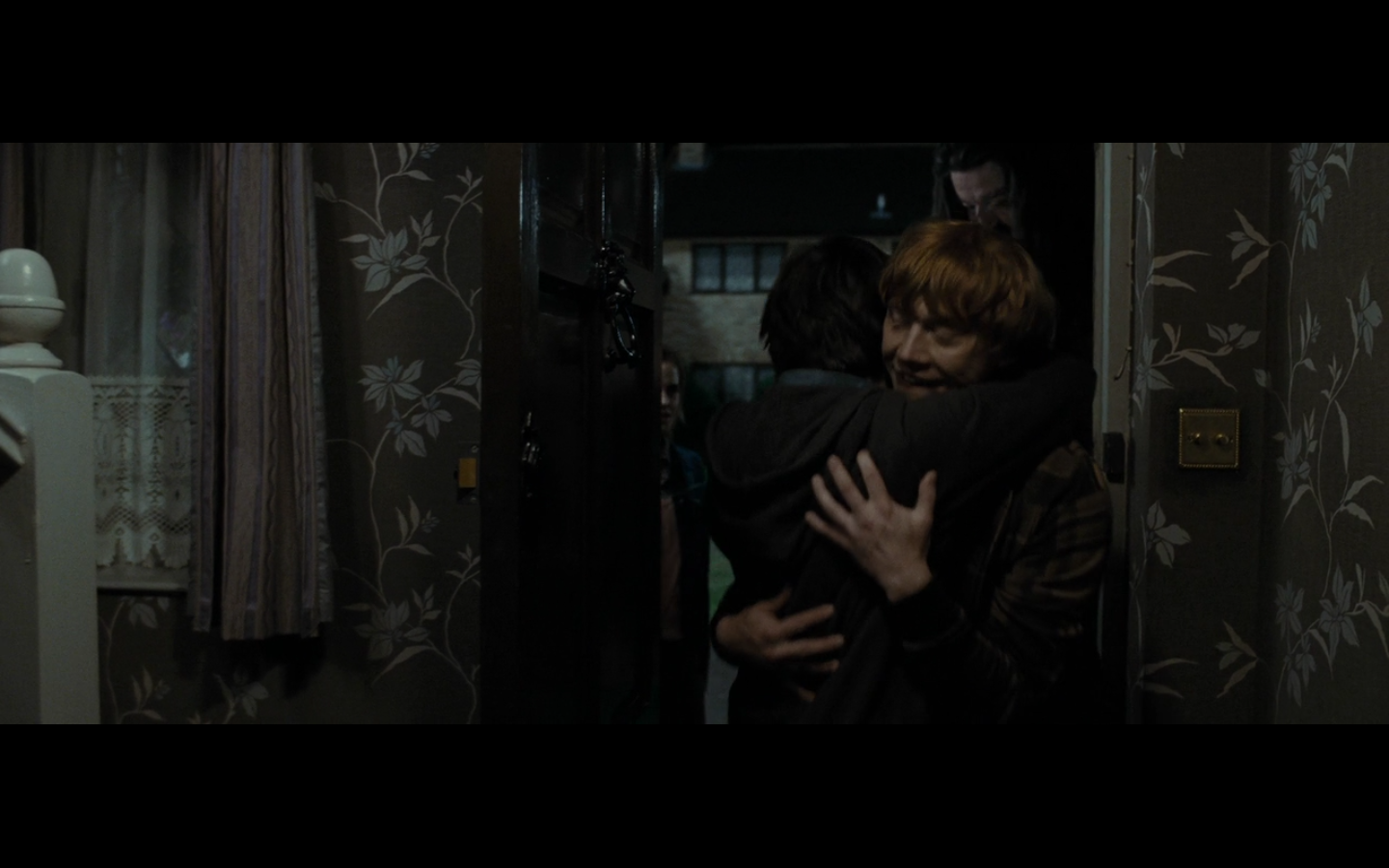 This shot is a perfect summary of their relationship. Hermione runs up to hug [what appears to be] Harry, and when she pulls back, she finds herself holding Ron fucking Weasley. Oh well.