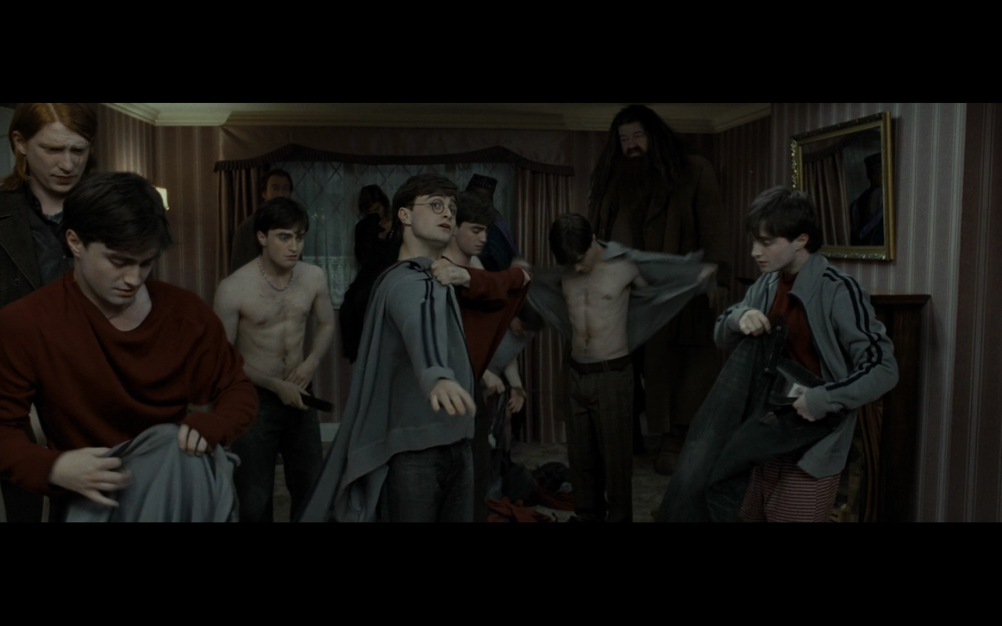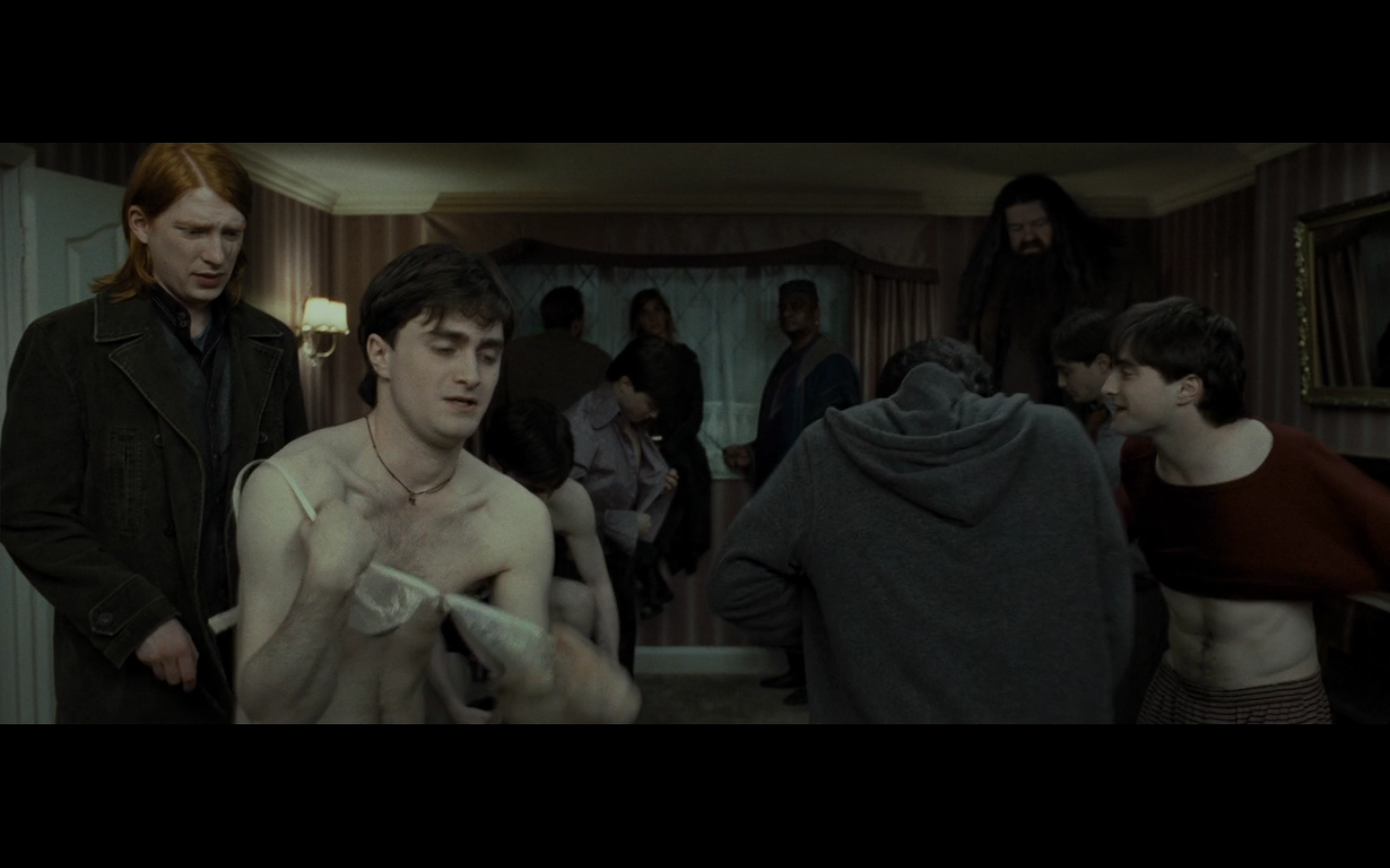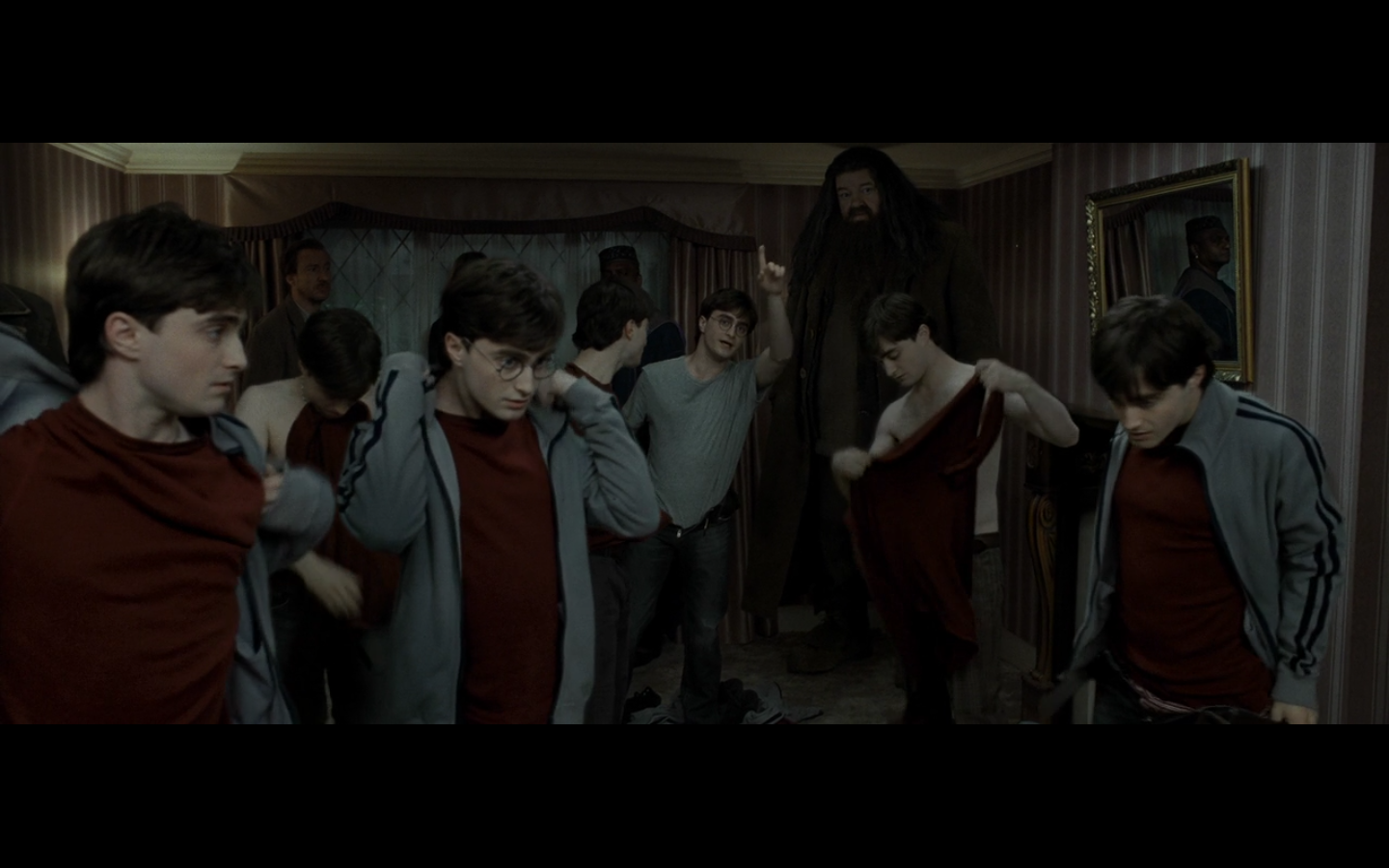In the book, Harry uses an Expelliarmus, and all the Death Eaters are like, “That’s him! That’s the real one! That’s his trademark spell! Only the real Harry would use such a weak ass spell in a fight!” and that’s when they knew. And then later, Lupin almost fucking kills him, like, “Motherfuckin’ Expelliarmus?!! Are you fucking kidding me?!!!” and he yells at him for being such a bitch and not fighting like a man.