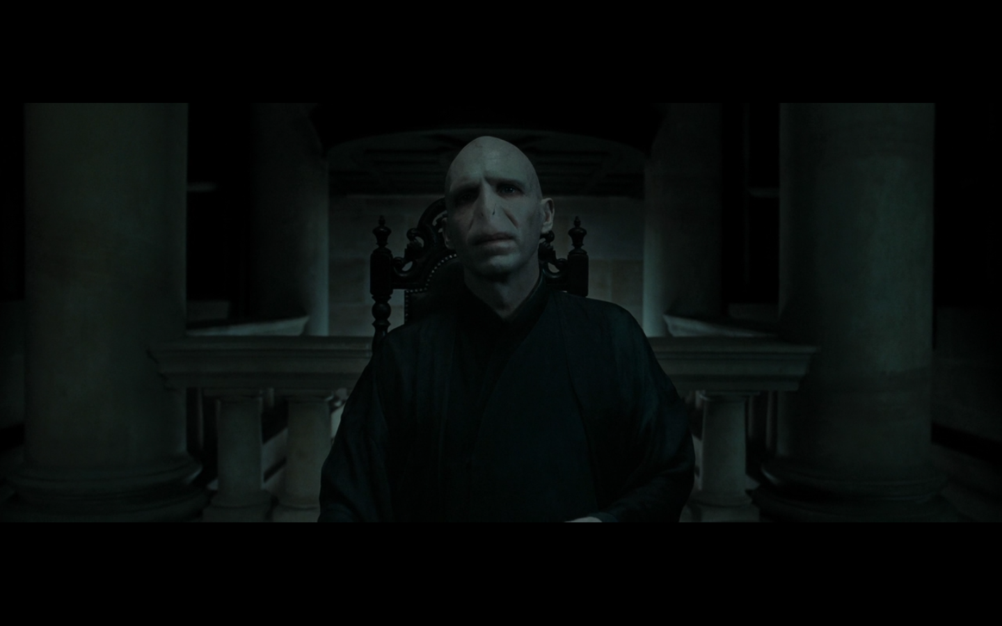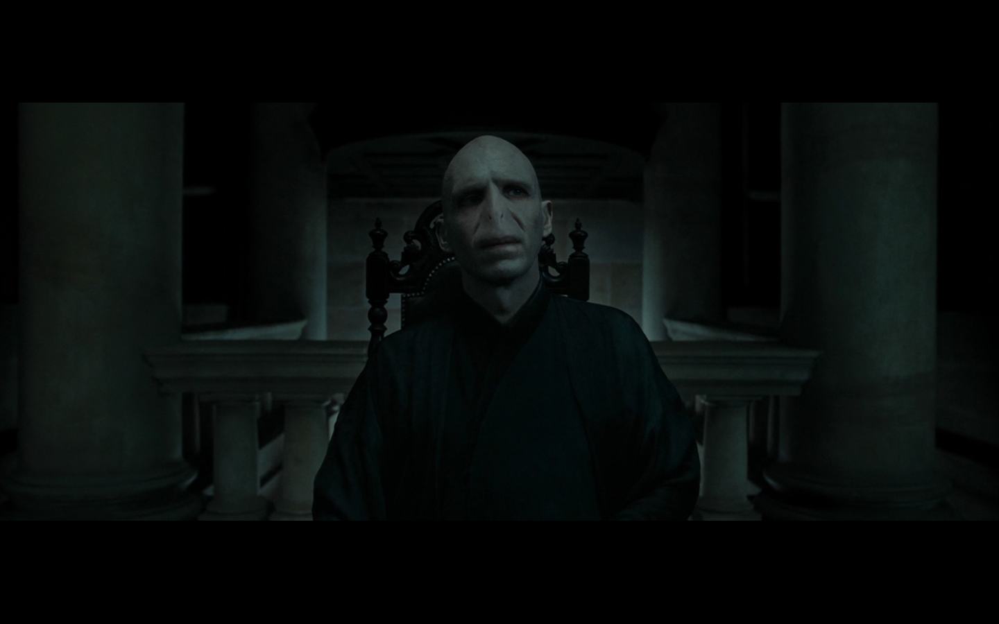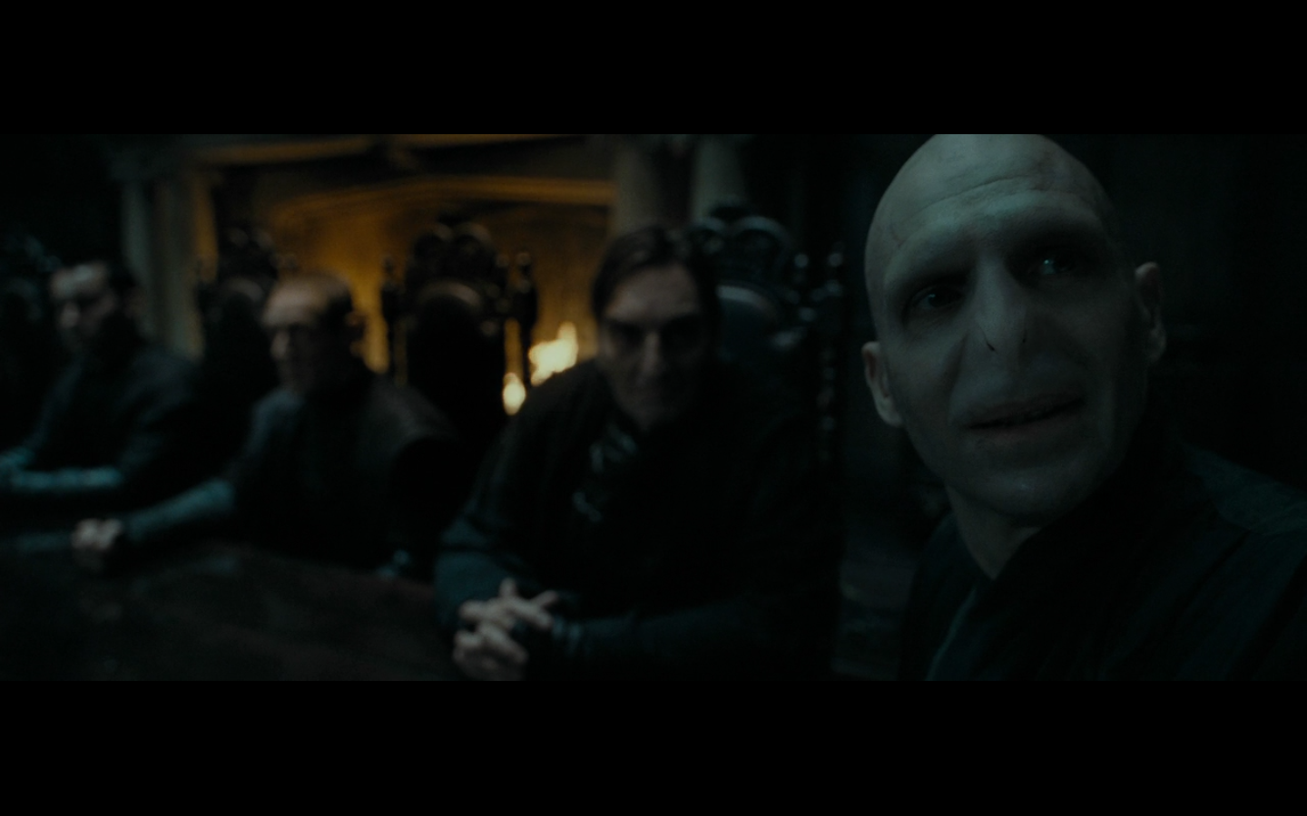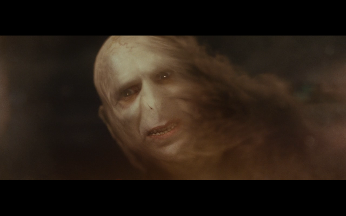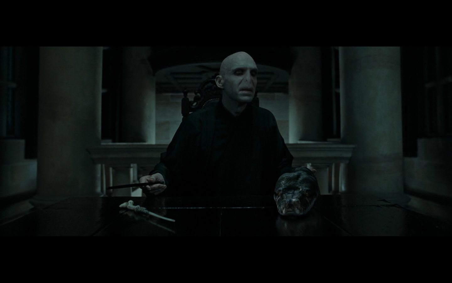 I love the idea of him sitting in a chair. Or doing anything inside in a civilized manner. It’s interesting to think about how far we’ve come with this guy. At first, he was “dead” and existed only as part of Quirrell’s head. Then he was just sort of gone into that weird fetus body thing until Goblet of Fire. Since then, we don’t really know where he’s been or what he’s been doing. We don’t know how he sustains himself, what he eats, where he sleeps, if he fucks anyone. And most of the time we’ve seen him, he’s been outdoors — in forests, graveyards, flying around, killing people — so it’s funny to me to see him sitting in a dining room.