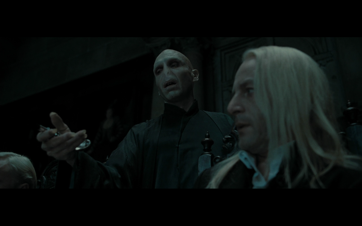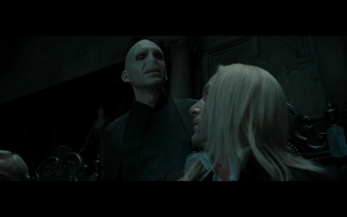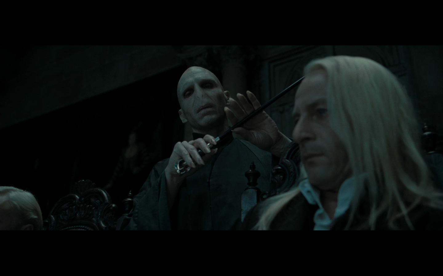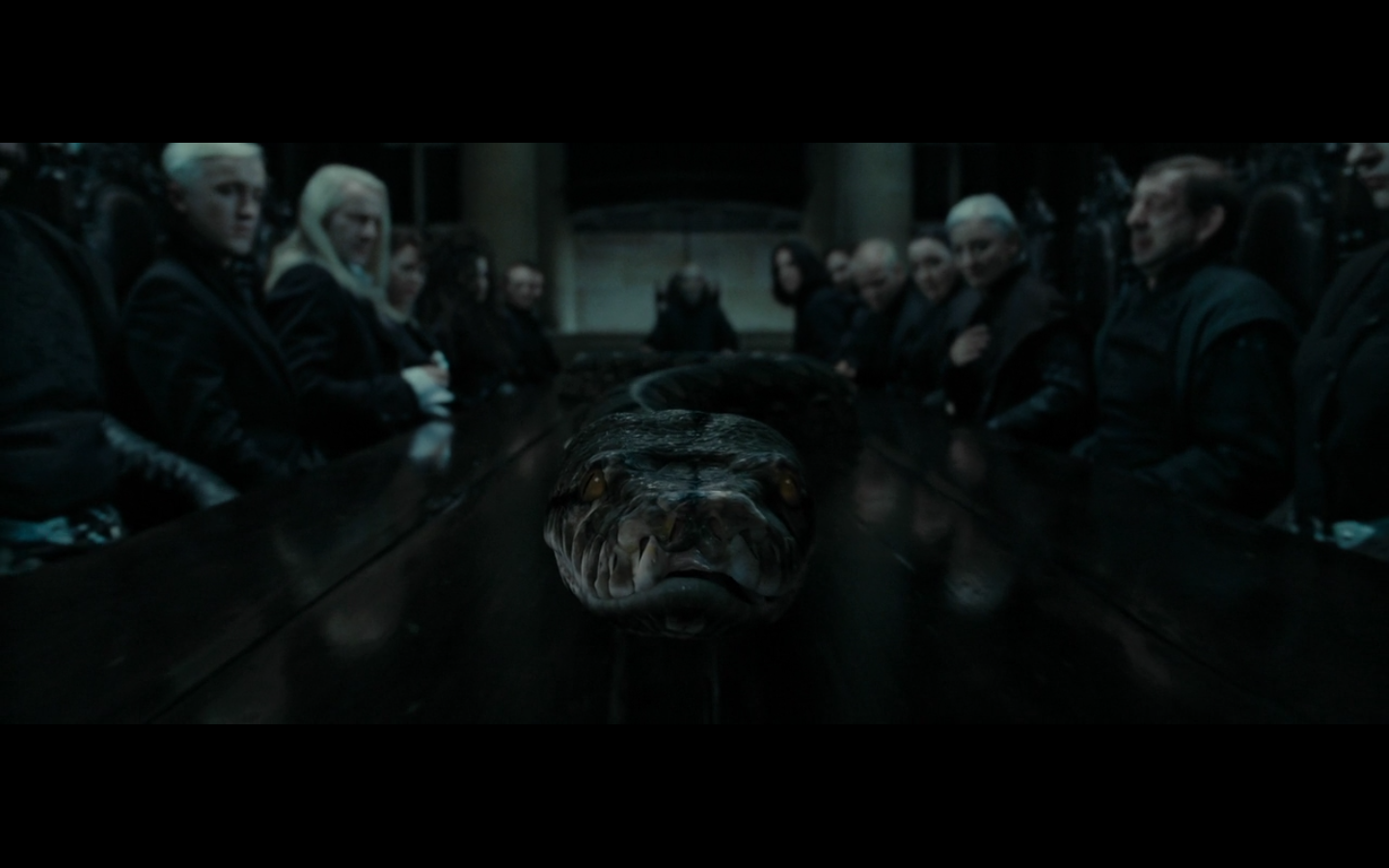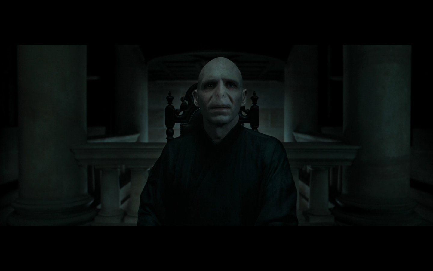 I love the idea of him sitting in a chair. Or doing anything inside in a civilized manner. It’s interesting to think about how far we’ve come with this guy. At first, he was “dead” and existed only as part of Quirrell’s head. Then he was just sort of gone into that weird fetus body thing until Goblet of Fire. Since then, we don’t really know where he’s been or what he’s been doing. We don’t know how he sustains himself, what he eats, where he sleeps, if he fucks anyone. And most of the time we’ve seen him, he’s been outdoors — in forests, graveyards, flying around, killing people — so it’s funny to me to see him sitting in a dining room.