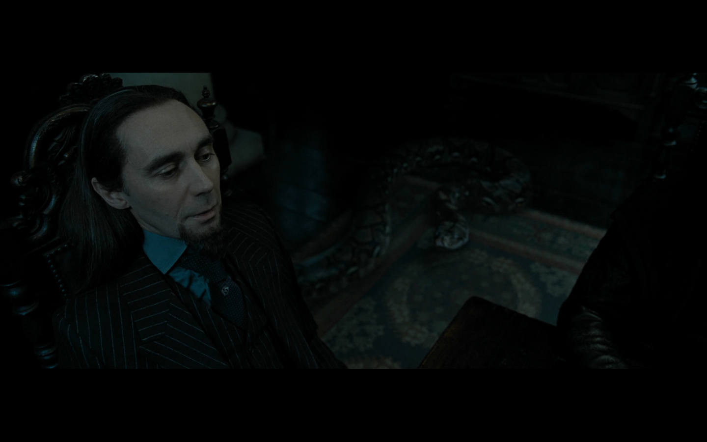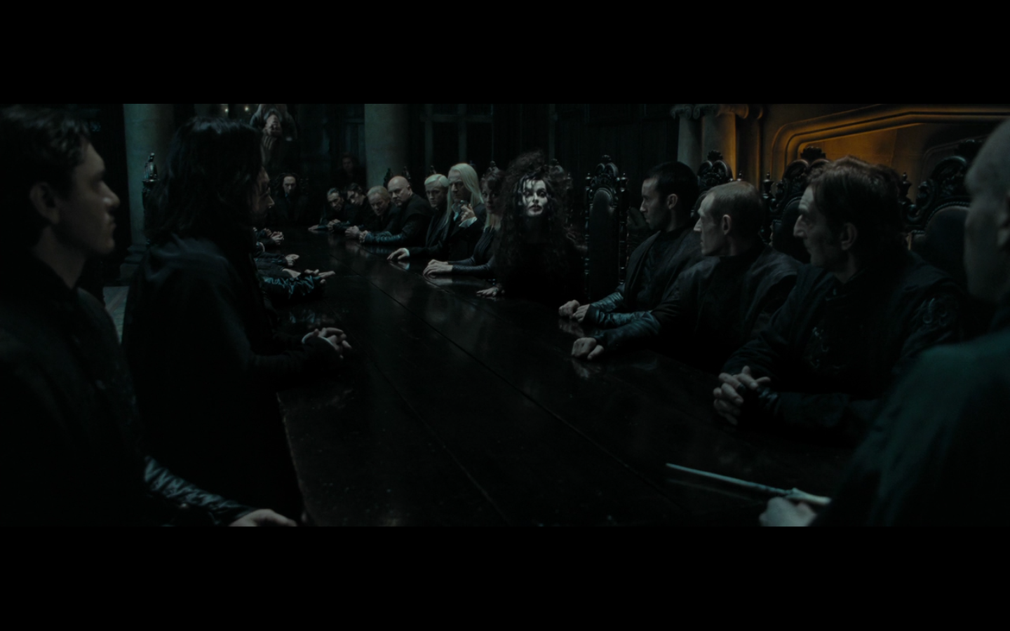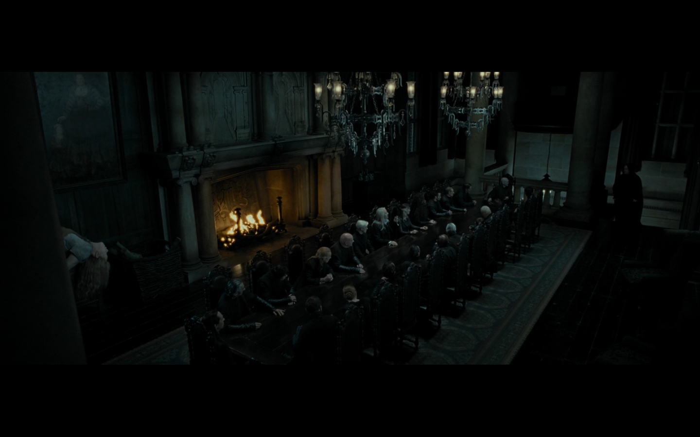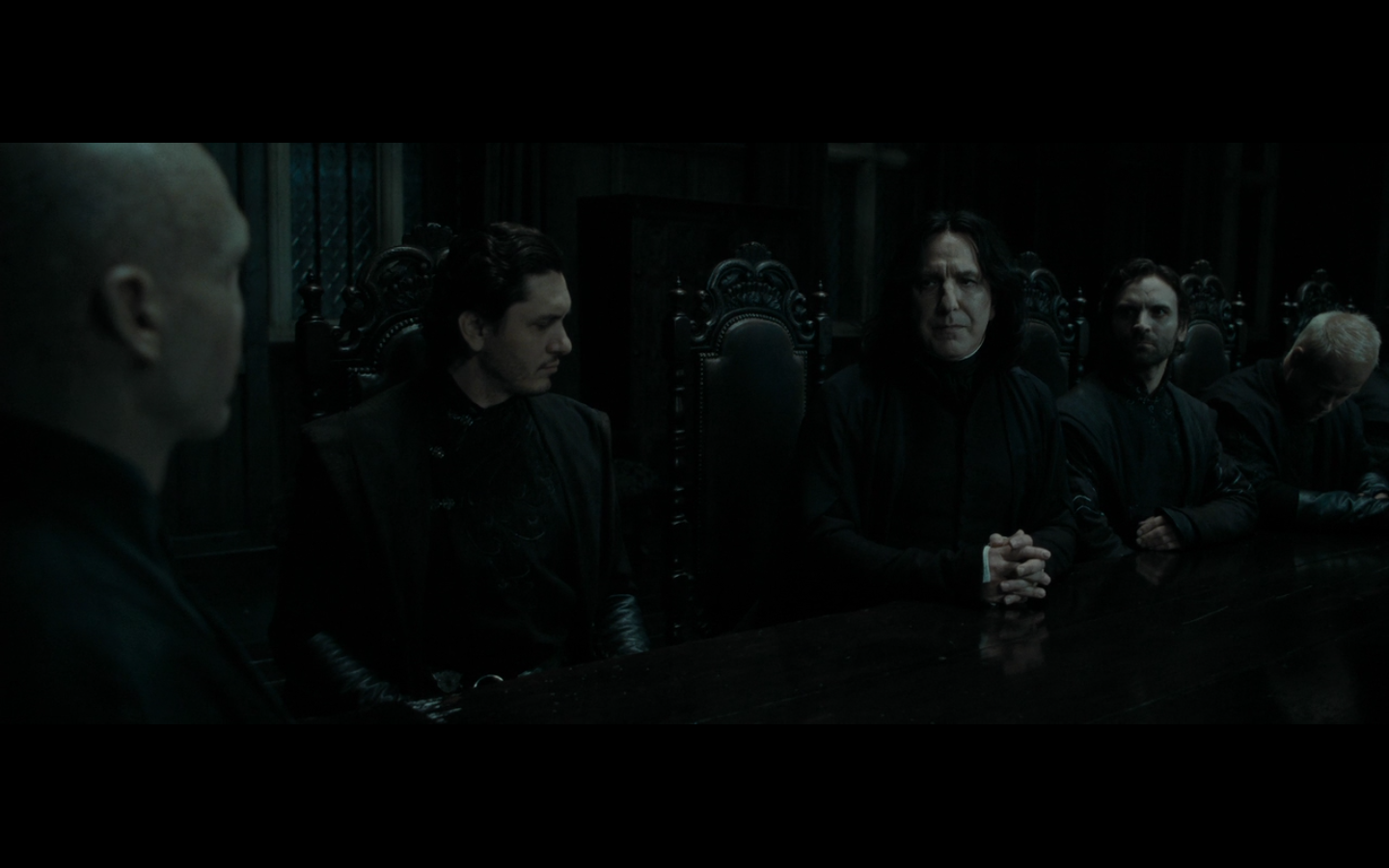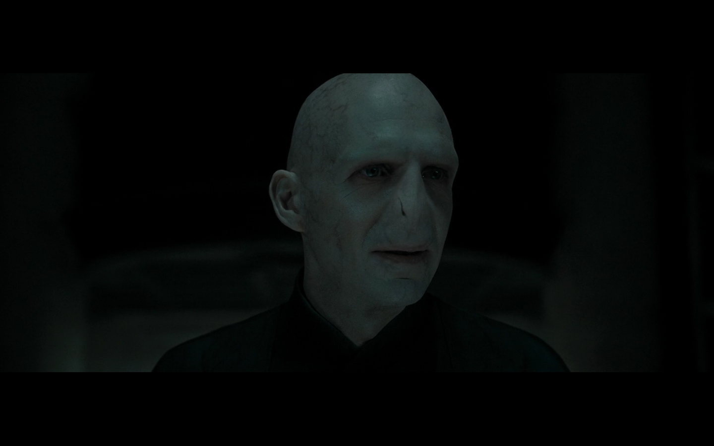 I love the idea of him sitting in a chair. Or doing anything inside in a civilized manner. It’s interesting to think about how far we’ve come with this guy. At first, he was “dead” and existed only as part of Quirrell’s head. Then he was just sort of gone into that weird fetus body thing until Goblet of Fire. Since then, we don’t really know where he’s been or what he’s been doing. We don’t know how he sustains himself, what he eats, where he sleeps, if he fucks anyone. And most of the time we’ve seen him, he’s been outdoors — in forests, graveyards, flying around, killing people — so it’s funny to me to see him sitting in a dining room.