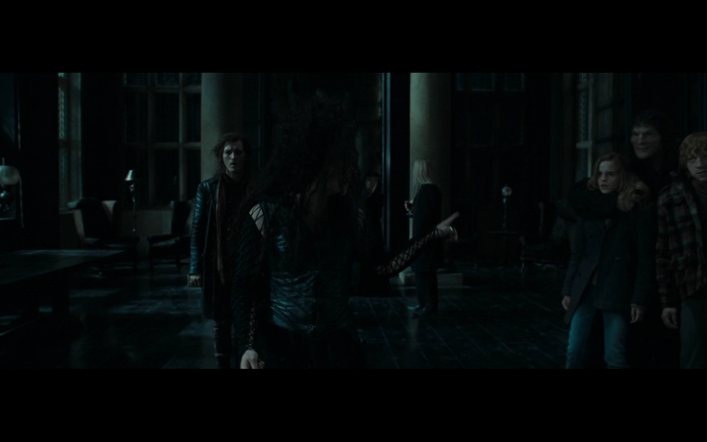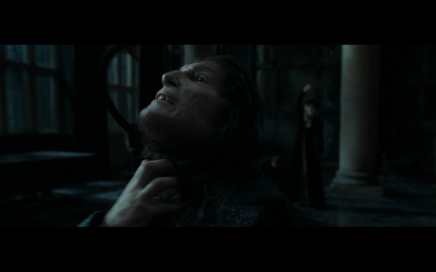 I know Voldemort won’t let him be a Death Eater because he’s a werewolf, but he was there when they killed Dumbledore, and now she’s telling him to get the fuck out of her house. I can see attacking the other people and leaving him alone, since he’s sort of the leader of the group and they’re just the dirty help he’s hired. You expect that shit from the help, but the main guy you figure won’t care and won’t do anything. It’s just weird that she’s attacking him like this all of a sudden.