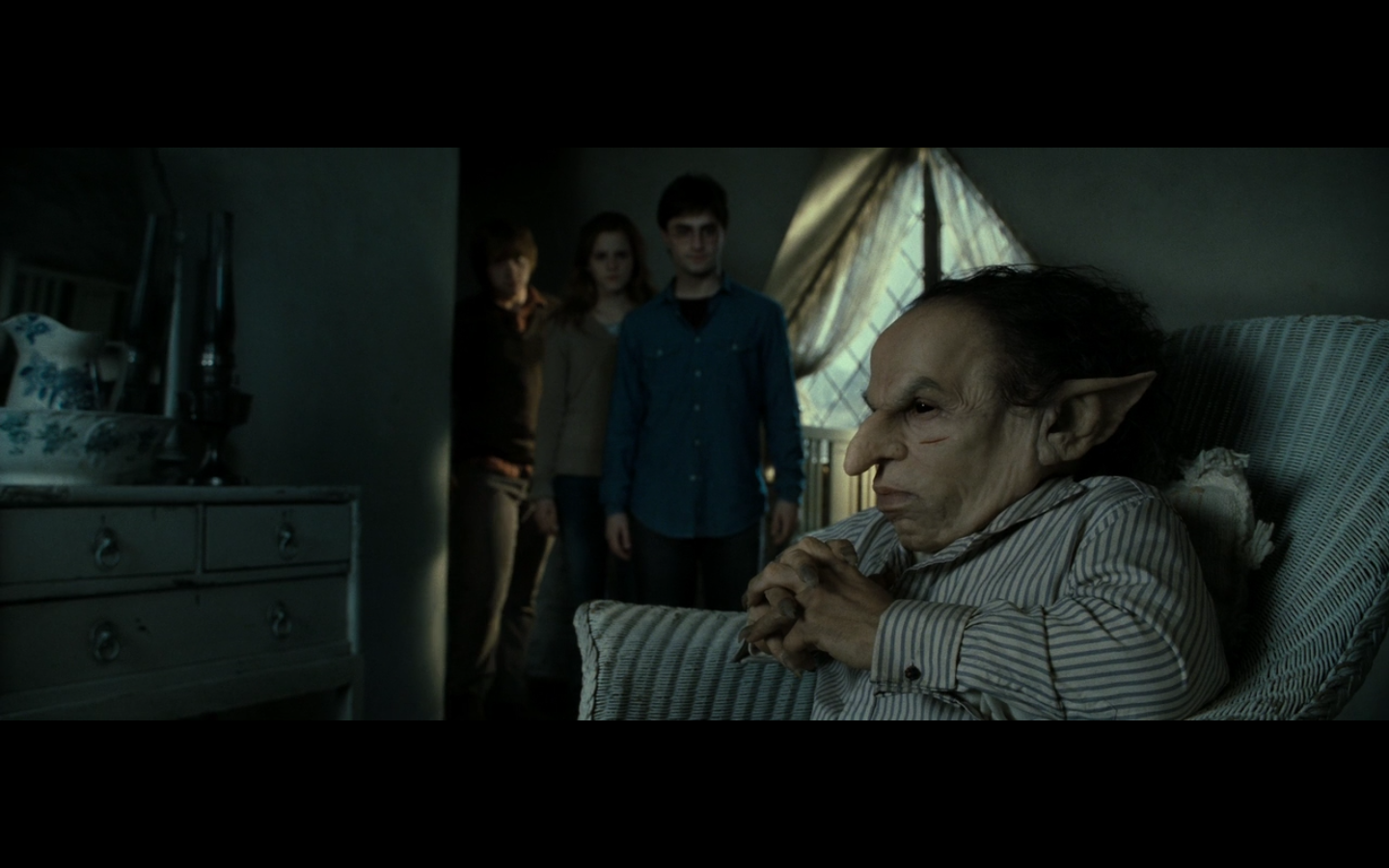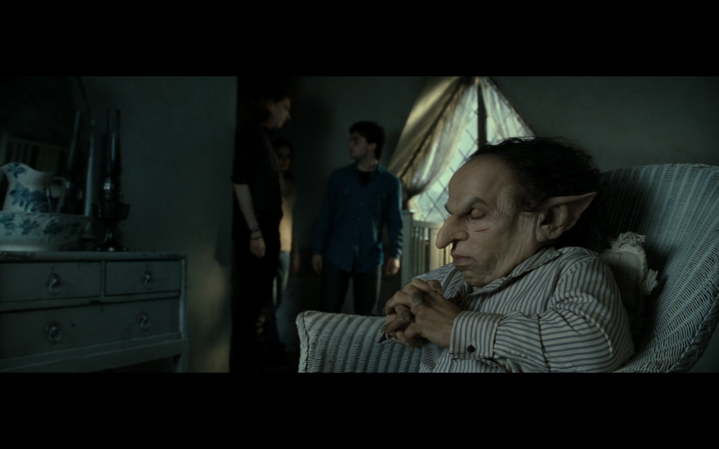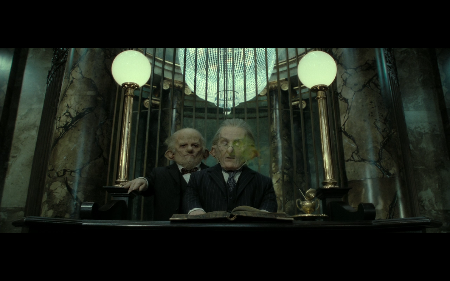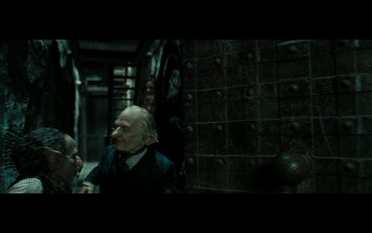These shots are always my favorite – what exactly is Bill’s purpose in this? Harry’s like, “I need to talk to the goblin,” so Bill escorts him upstairs and shows him into the room and then leaves? Why wouldn’t he just be like, “All right. First door on the left, you know where it is”? No, he had to bring him to the goblin’s room and then awkwardly leave. What the fuck is that? Why couldn’t he stay? Why does he need to be bringing them? And they do it in EVERY movie! No one ever calls them out on it.