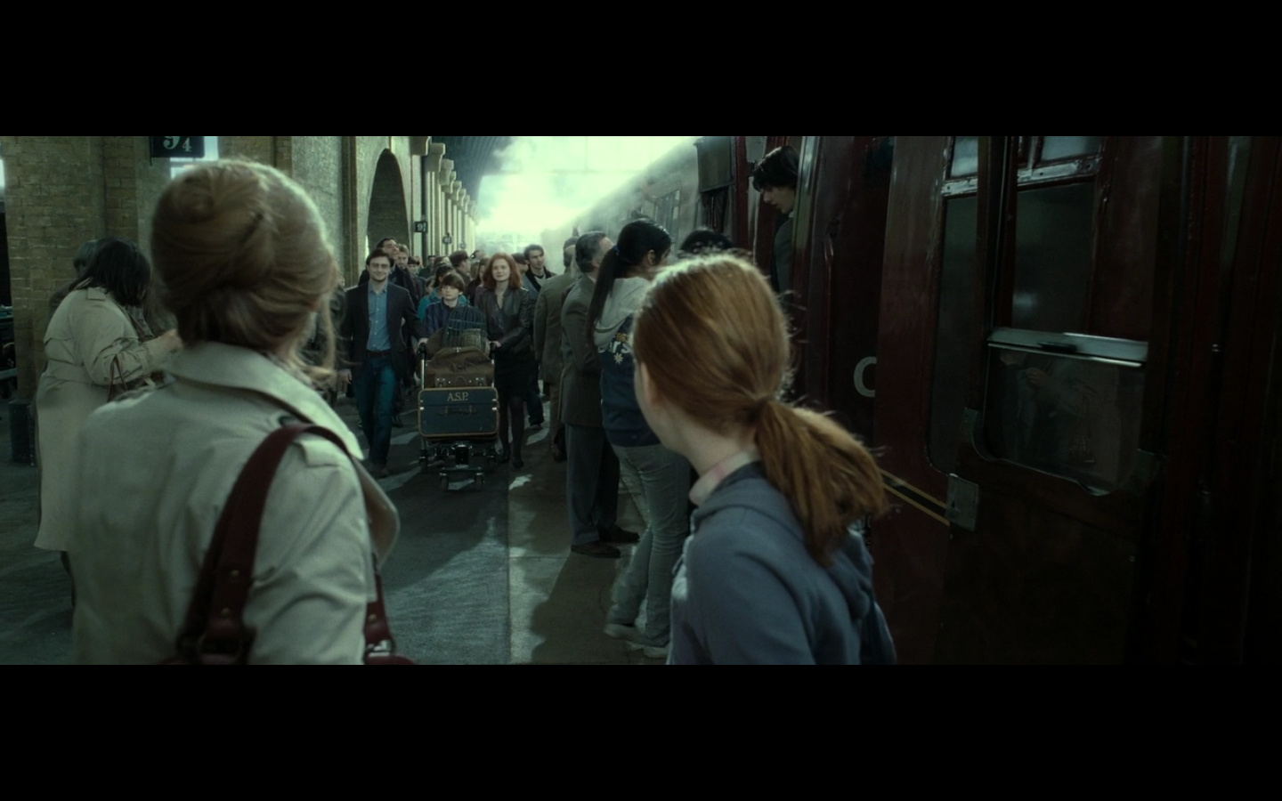 The way they cut this is weird. They show Ron and Hermione’s daughter, and then they show Harry and Ginny’s son drop back and tie his shoe. It’s like the kid has a crush on his cousin. What the fuck is that about? They explain why he’s angsty, but the visual suggests a creepy, incestuous thing. Maybe it’s like Harry’s son having thoughts about Hermione’s daughter cause they’re the pair that should have happened all along. Too bad the kids both have Weasley blood. It should be no surprise that Weasley blood, like a disease, is the glue holding this corner of the wizarding population together.