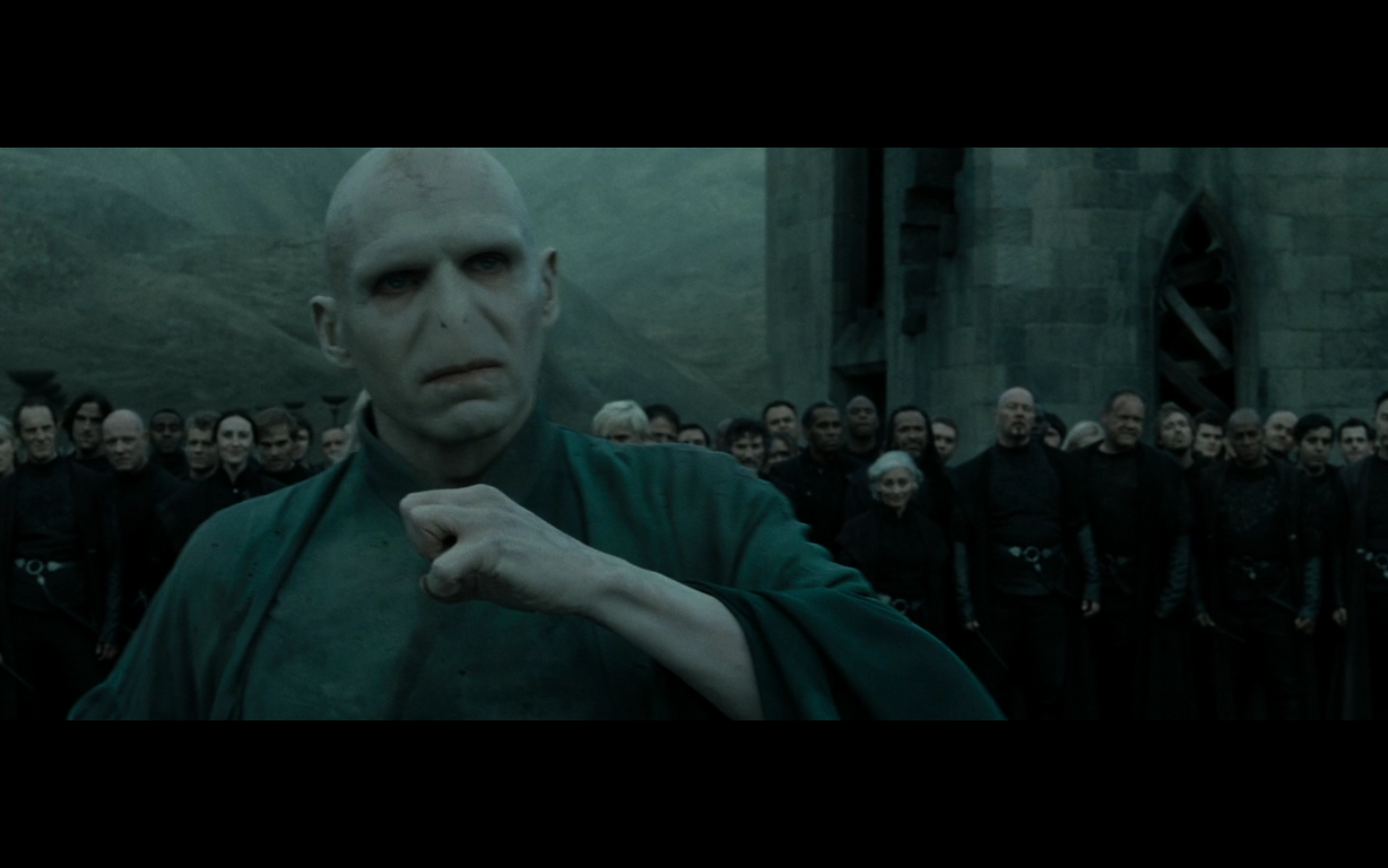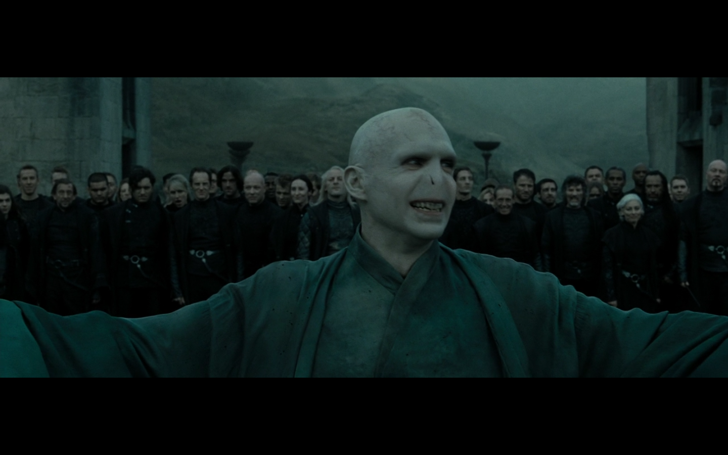 Exactly what I was thinking. That’s what I love about Voldemort — he’s a showman. Particularly during this scene, he conducts himself as a showman. I’m sure his ultimate goal is world domination or the eradication of muggles, or whatever, but seeing him act in this way at the end of this film you’re left with the impression that what he really always craved was an audience. The man loves a crowd.