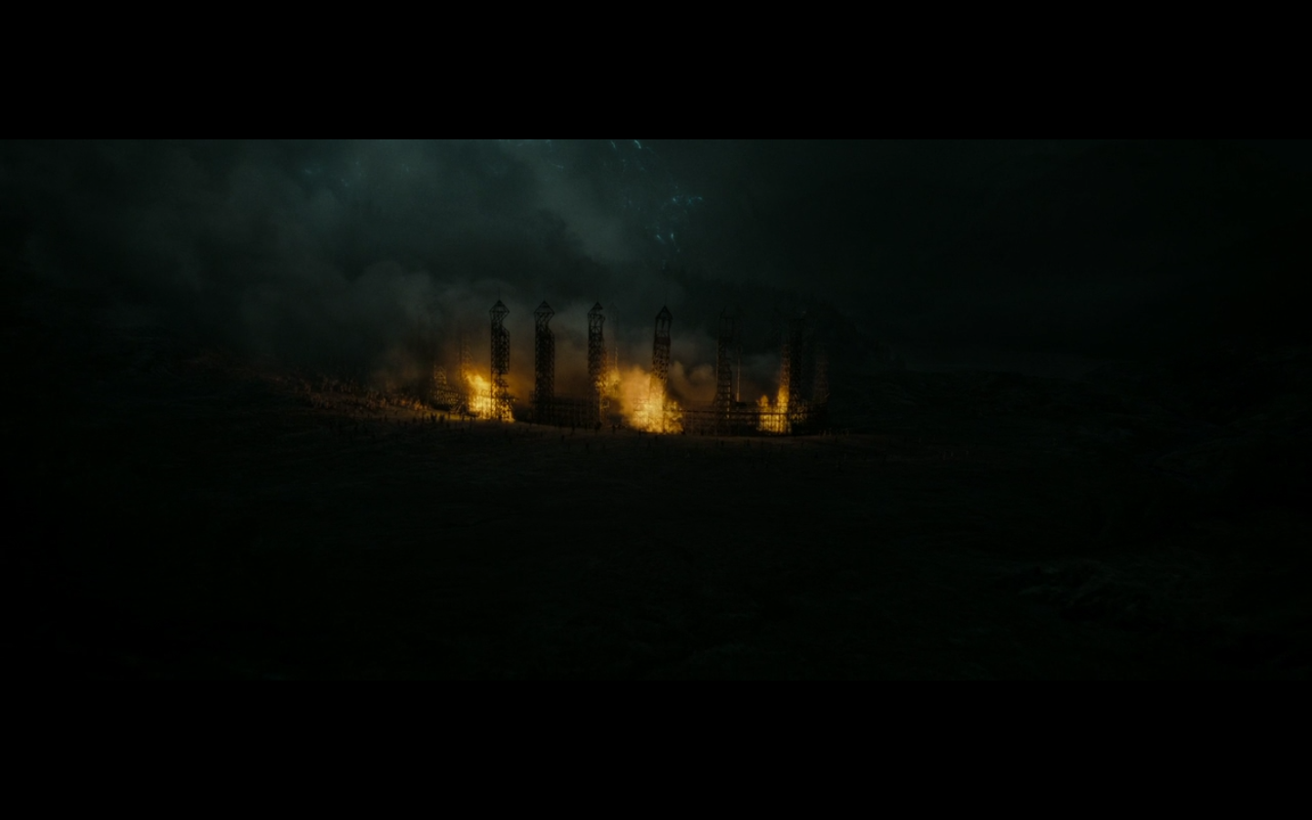 I love that first image because first of all — what the fuck is with that tree? It’s clearly a bizarre tree that only exists in the Harry Potter universe, and if it is in fact real, cut that shit down today. But more so, I like it because it acts as a silhouette shot. We’ve had a few of those before; the one that stands out in my mind is the one from The Goblet of Fire where they’re climbing the hill to the portkey. We both liked that one. I sort of like this one better because it’s a wide shot with sort of washed out color. Like Saving Private Ryan color correction, which I love in a flashback.