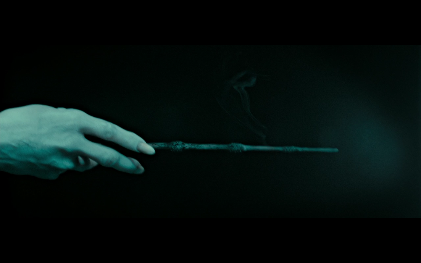 And then the second shot — you don’t pay much attention to it, but there are only three people in this franchise who hold their wands like this — Voldemort, Dumbledore, and Harry. Because they’re the only three who ever manage to have continuous streams coming out of their wands at once. And Harry never really is able to control his. He has to hold on tight, and a lot of it is his wand being matched with Voldemort’s. And Dumbledore does also get it, but never as badass as Voldemort does right here. This motherfucker’s firing off with one hand! And he always does. Overhead, with one hand. That’s fucking badass. Think about that. Think about how EVERYONE else in this franchise uses their wand, and then look at that shot.