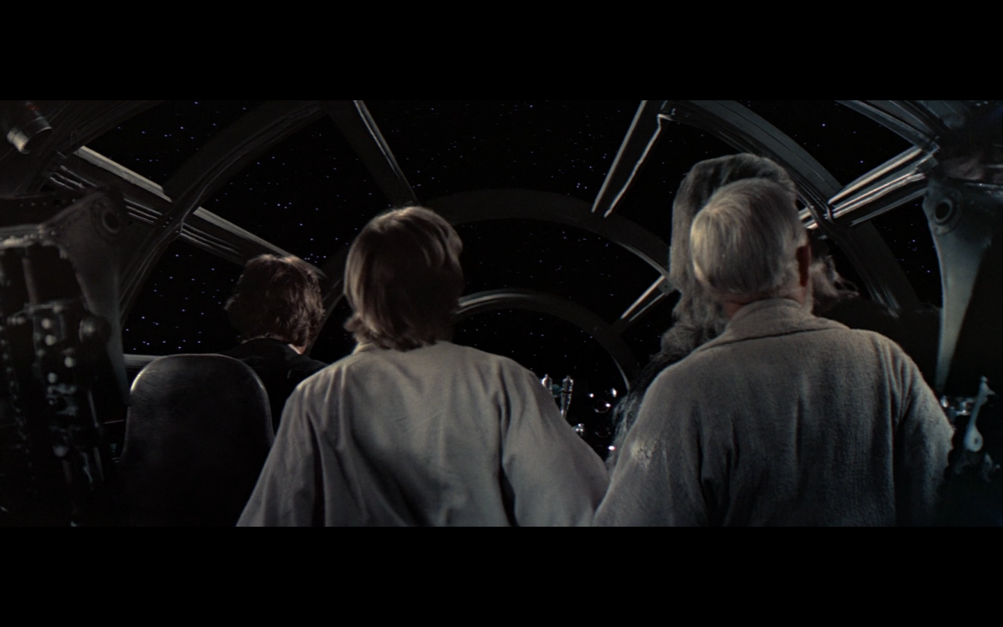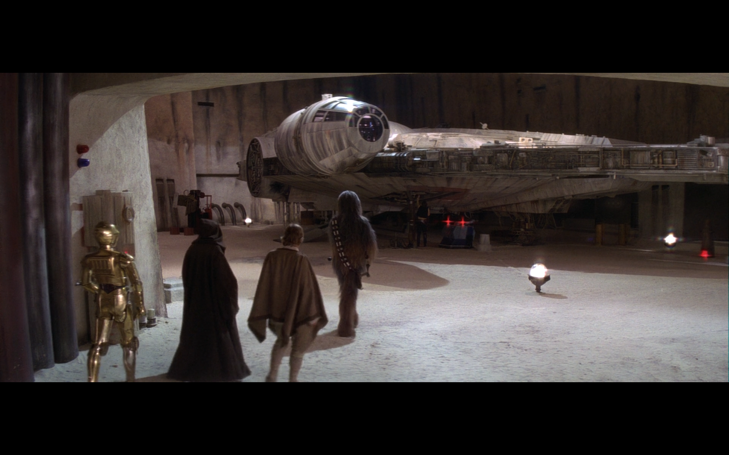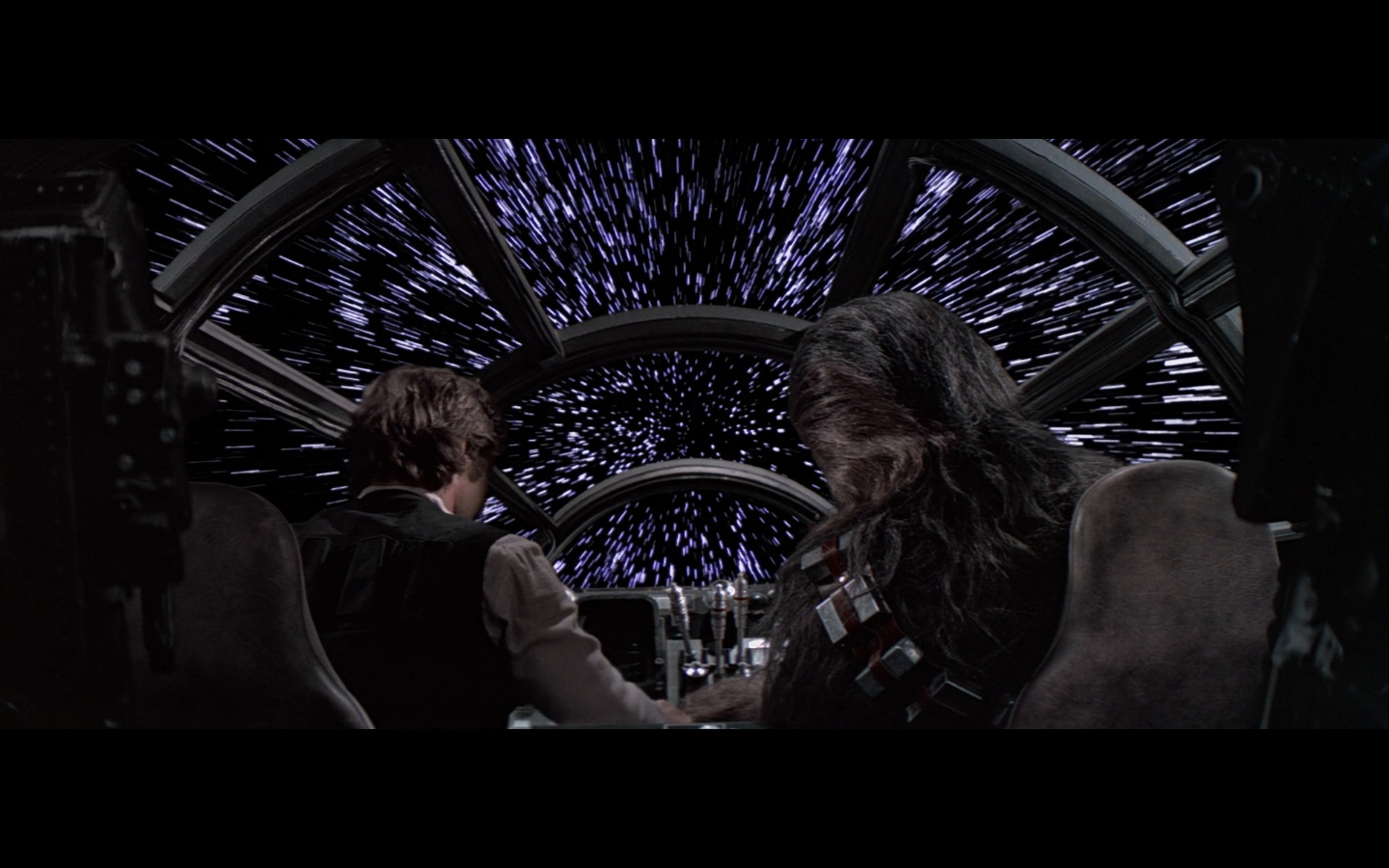 I always love the jump to hyperspace. It’s one of those things that’ll always stick with me about these movies. The stars stretching out, the Falcon disappearing off and the camera then spinning, as though space-time was being twisted. I love all that shit.
