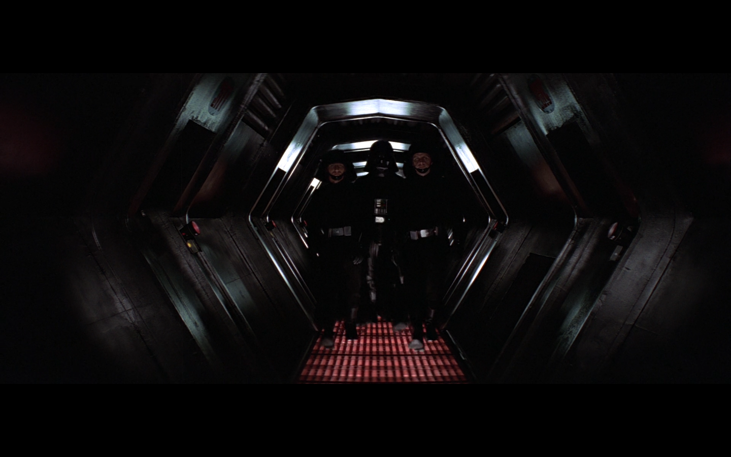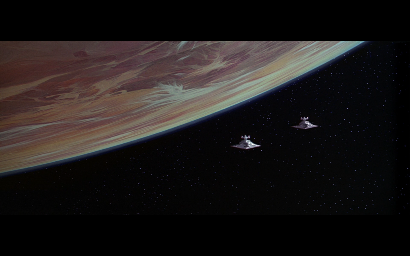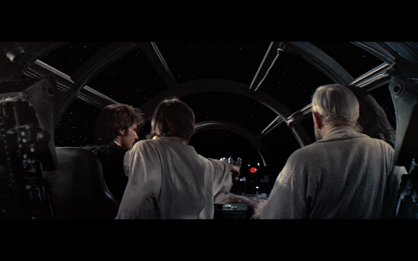 I always love the jump to hyperspace. It’s one of those things that’ll always stick with me about these movies. The stars stretching out, the Falcon disappearing off and the camera then spinning, as though space-time was being twisted. I love all that shit.
