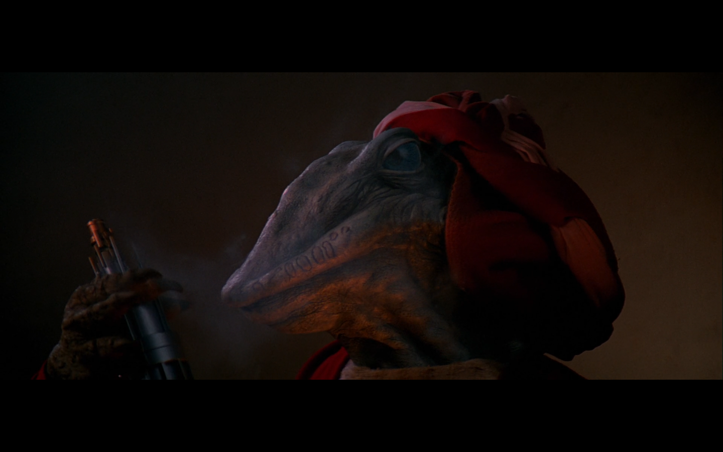 Ever notice how his language sounds like some weird version of space Russian? Apparently most Rodians speak basic, but this is such a stereotypically alien-looking creature that I guess Lucas wanted a weird language. And of course they can all understand each other even though they’re speaking different languages. Like Pokémon.