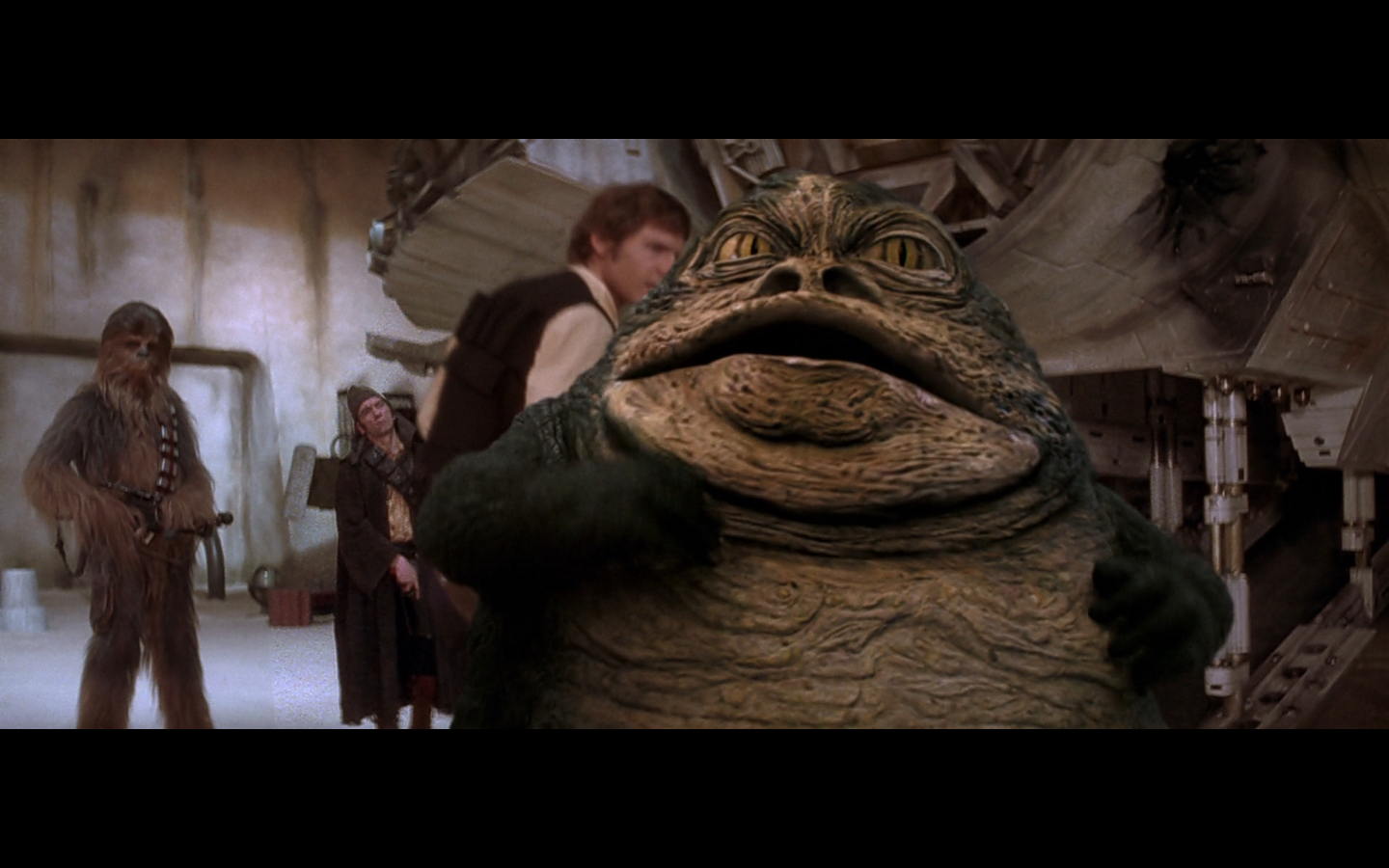 I love this moment. Han’s like, “Look man, you want to talk to me, you come find me yourself.” And Jabba’s like, “Hey, man, I can’t play favorites. It’s just business.”