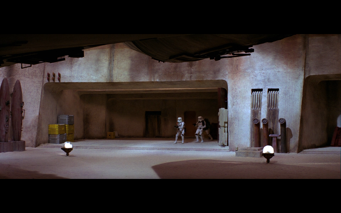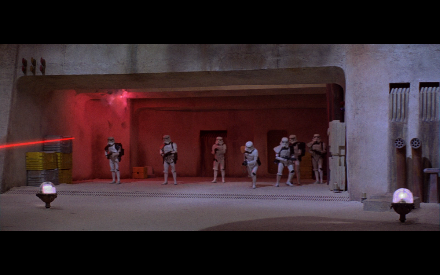This is a good shot, with the Falcon framing from above as the stormtroopers run in and start shooting. It’s a good angle.