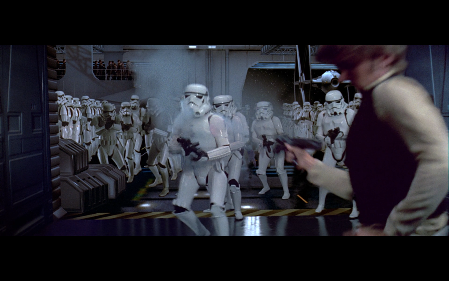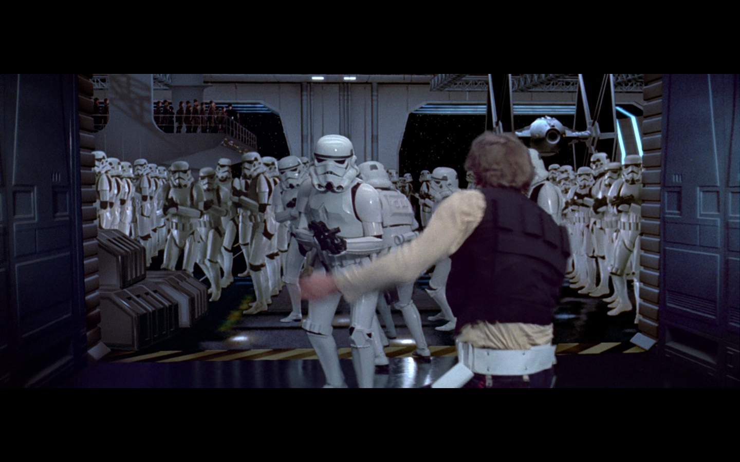 This is a great moment with Han being totally pigheaded and simultaneously badass. Chase the bastards. They already outnumber him, but he looks like a crazy person, so you run. And now there’s like a shit zillion of them, so you turn around and scream louder while being chased.