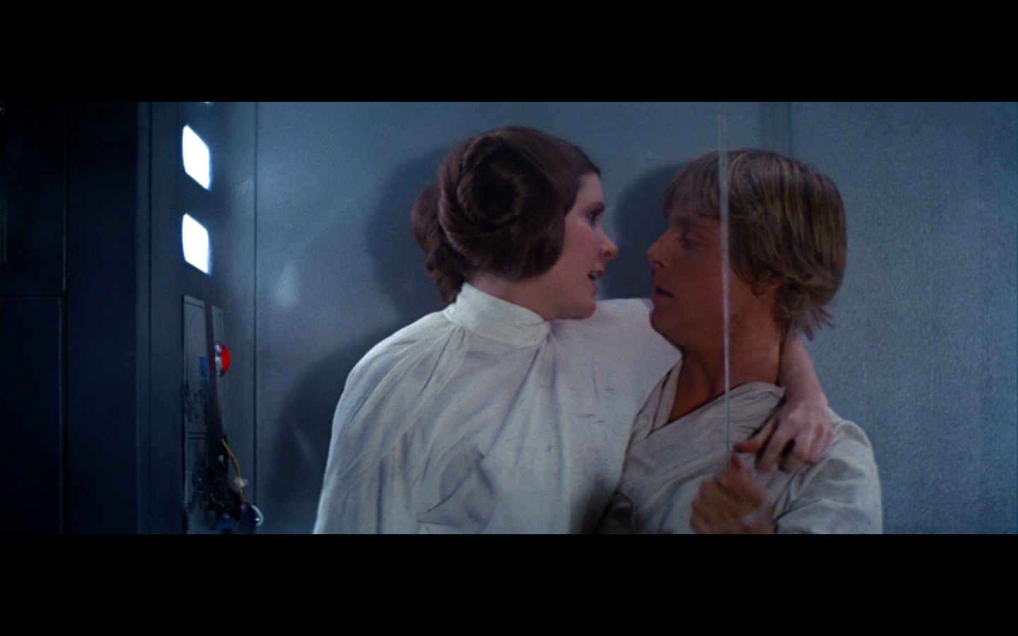 My real problem is that Lucas will repeat the same thing over and over until it’s time to change it. For example — Han and Leia in the hallway. “I gotta go.” “You can’t.” “Because you love me.” “I don’t love you.” Han and Leia later — “You know you love me.” “You scruffy-looking nerf herder!” Han and Leia in the cockpit. “Let me go.” “Don’t get excited.” “Being held by you is more than enough to get me excited.” Then — “Why are you touching me? You’re a scoundrel.” “You like me because I’m a scoundrel.” It’s too much repetition and variation without any kind of nuance whatsoever. Maybe it’s the writer in me, but I see that and go, “Jesus, you could have had so much other nuance in those scenes except, “You love me,” “No,” “You love me,” “Fuck you,” “You love me,” “Oh, please,” “You love me,” “Yes.” Han doesn’t change, and Leia is basically being worn down until she admits the truth through constant pestering. There could be some more interesting ways to work those exact scenes in.
