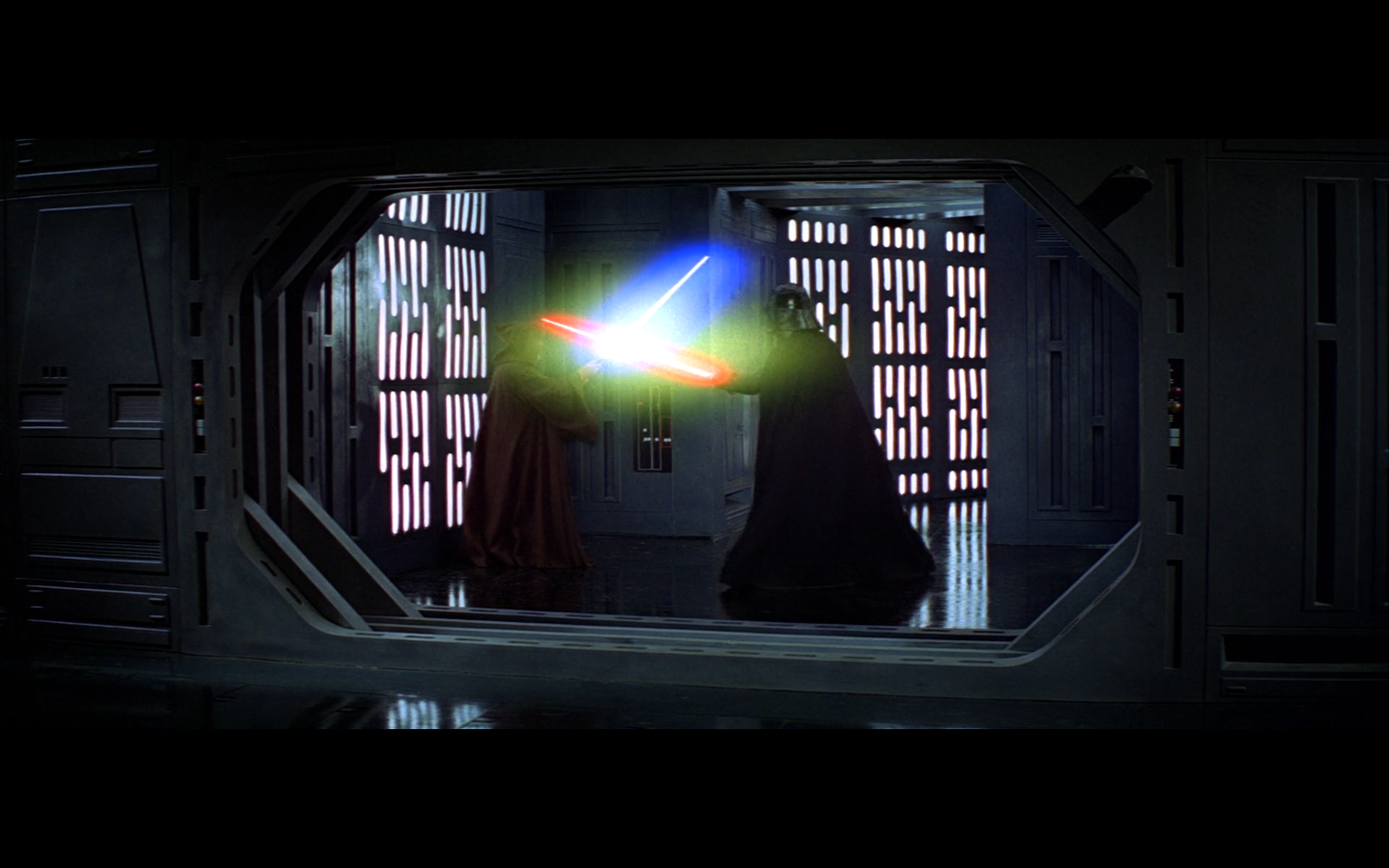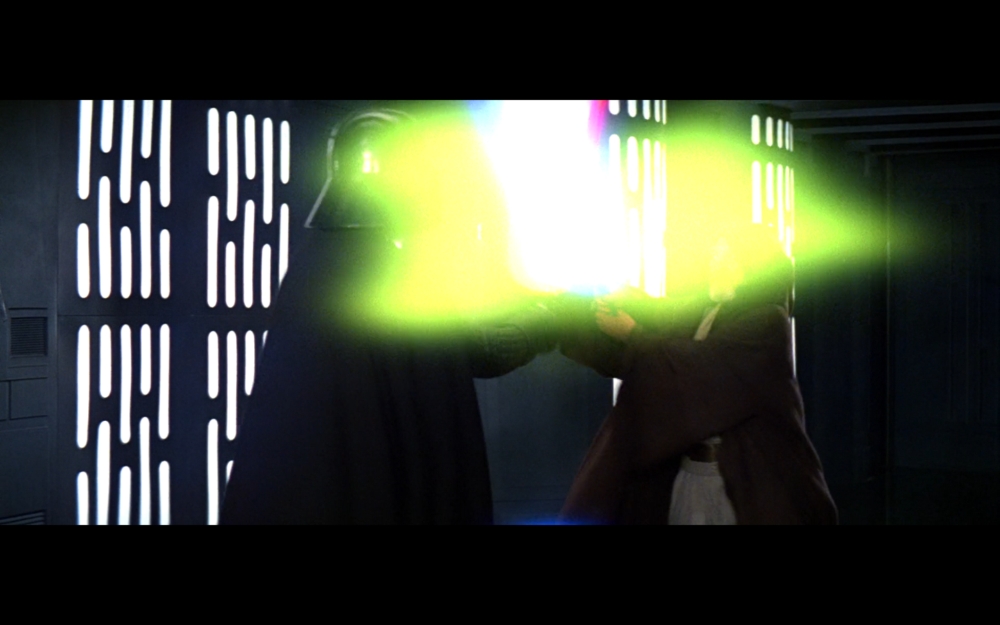 On your first points — yes, none of this makes sense to me, either. How Qui-Gon doesn’t disappear, nor does Vader. The other thing is, he cuts right through the cloak, but it remains intact. This is just one of those things where you’re like, “Eh, it’s a pretty old movie. They’re going for a gimmick of sorts and weren’t really thinking long game.” But yeah, it’s totally inconsistent.