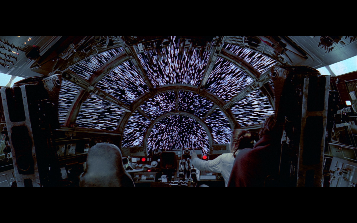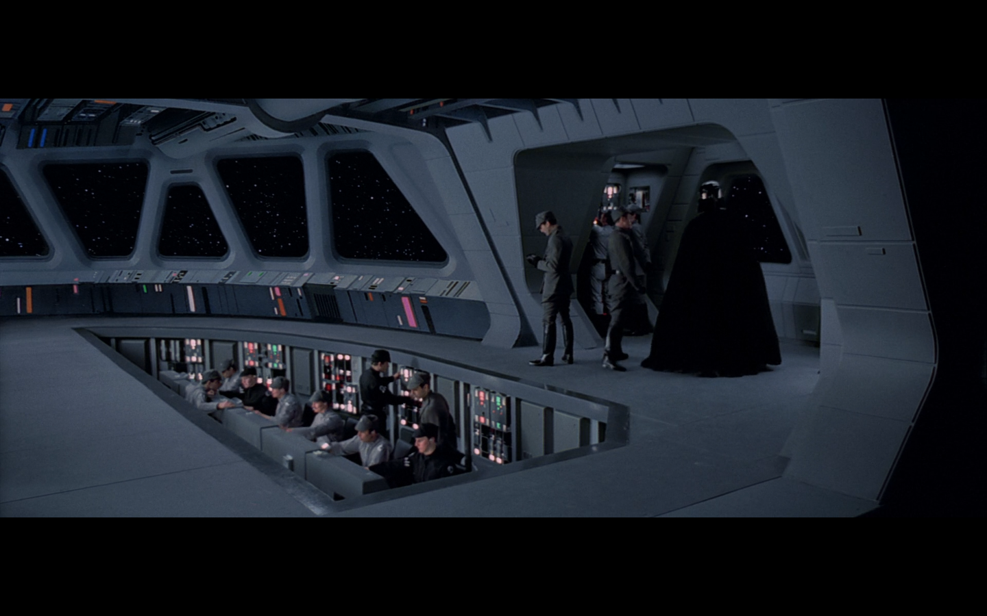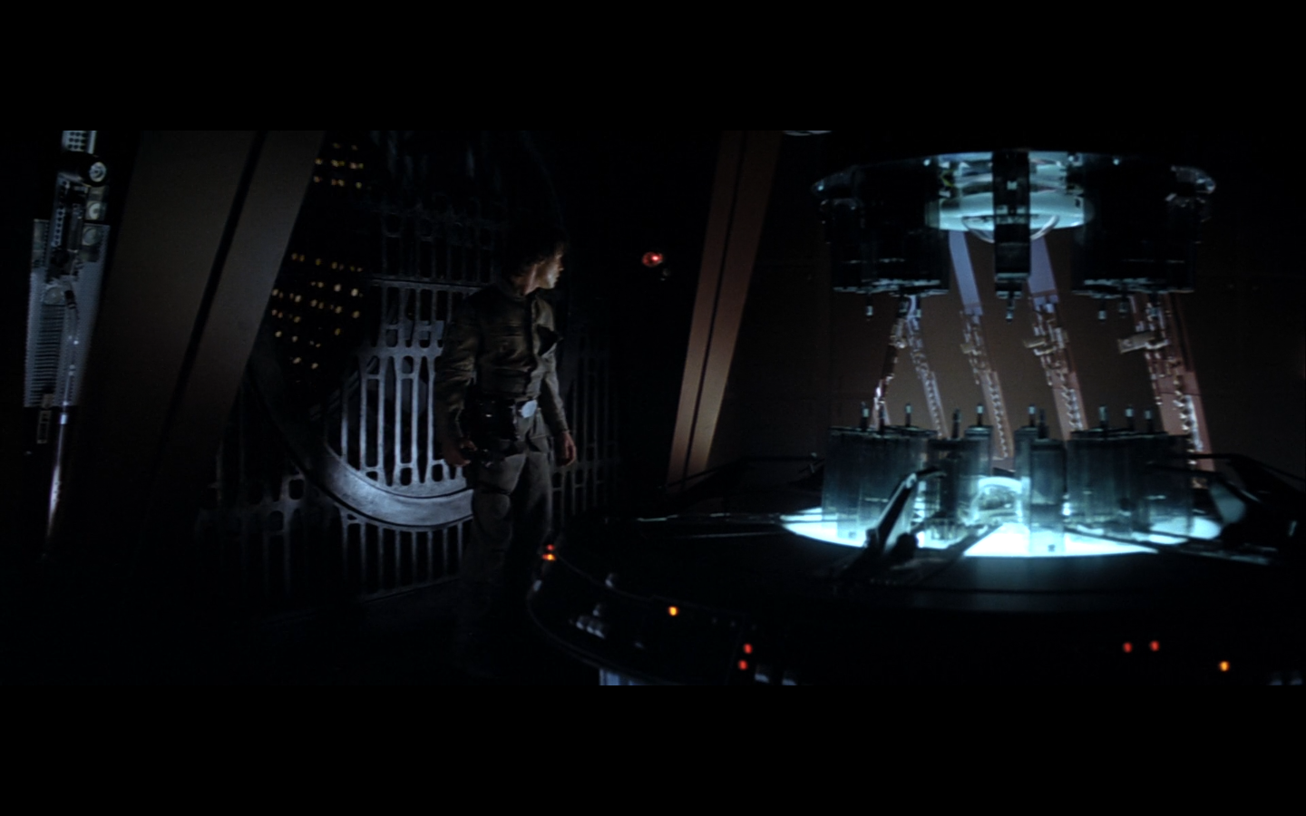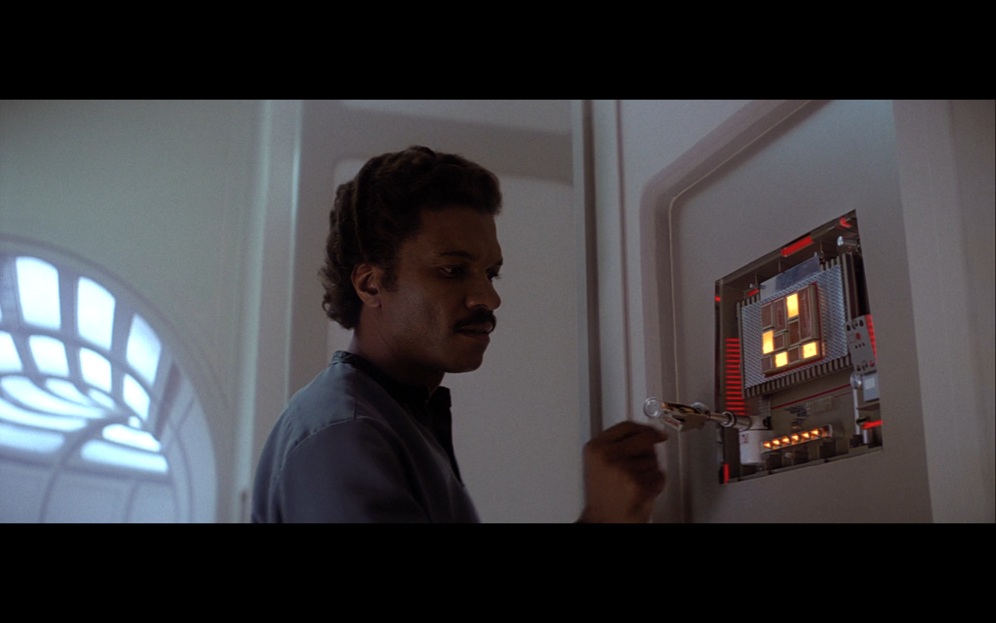 This is what I was talking about in the first article of the franchise, when Leia’s programming R2 which what appears to be a floppy disk. Some of it is surely that they don’t have the time or the technology to adequately make what they could imagine. But a big part of it is that in imagining the future, we simply take what we’ve got and imagine something a little better. Like early 20th-century portrayals of the distant future always have 747-sized biplanes and shit like that. It’s hard to say what the next step will be in any given development — think about Matrix Reloaded, when they’re coming into Zion, and they show the control room. It’s all white and there are huge holo-monitors and people are pressing buttons in midair and swishing them around and stuff. That looked futuristic then, but now they do that shit on CNN. You have to figure it’d be like…neural implants where you control the screen functions by blinking or looking in certain places. Although that’s now happening with the Google Glass, so…I guess the conclusion is that you can’t really predict a full paradigm shift in technology that far out, so it’s hardly worth trying. We’re left with buttons.