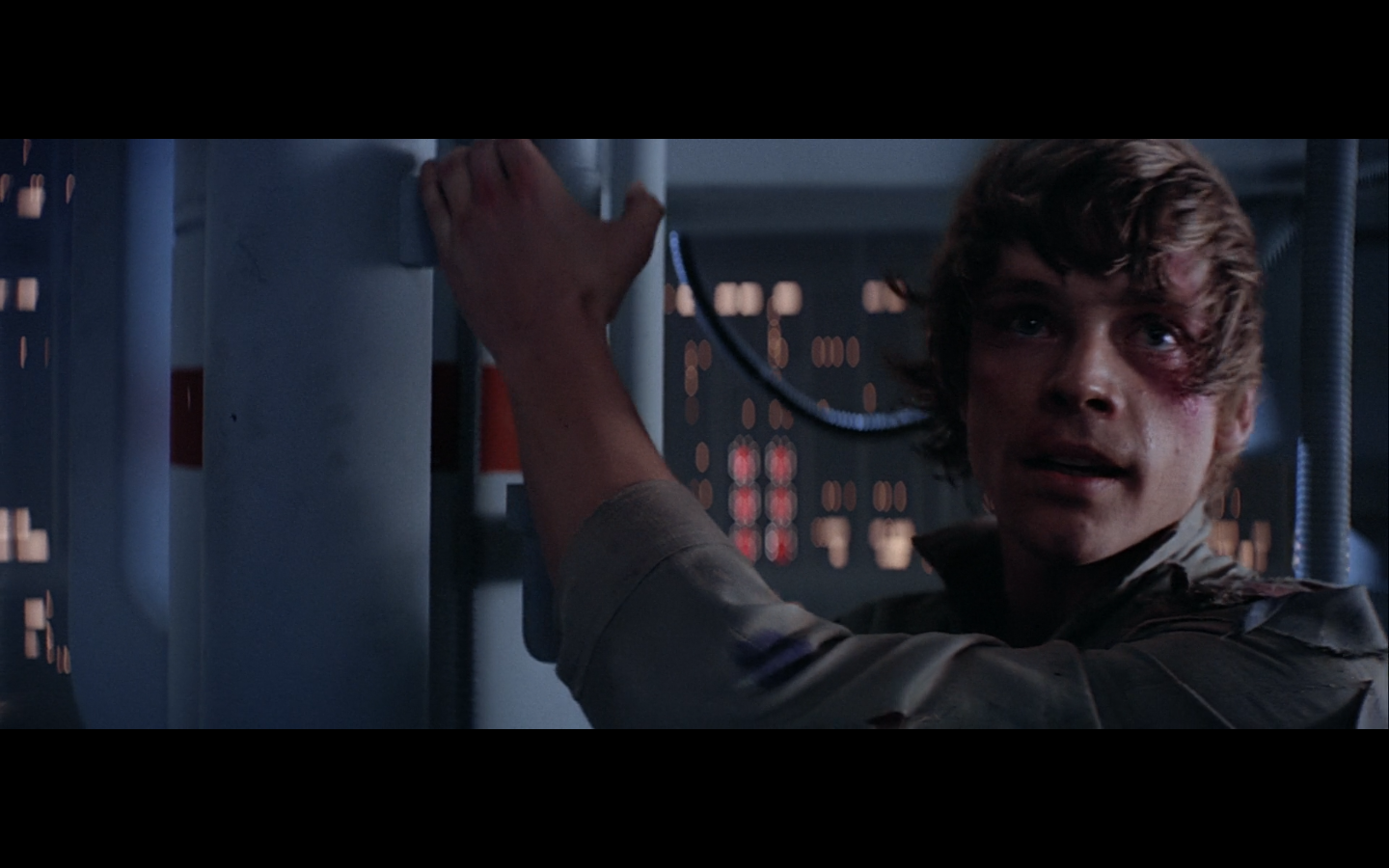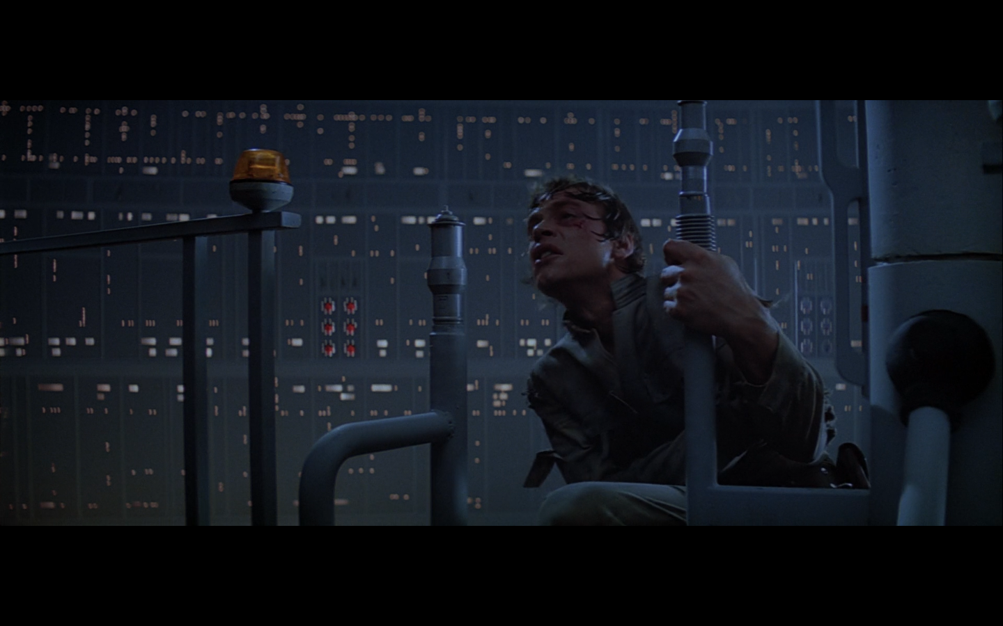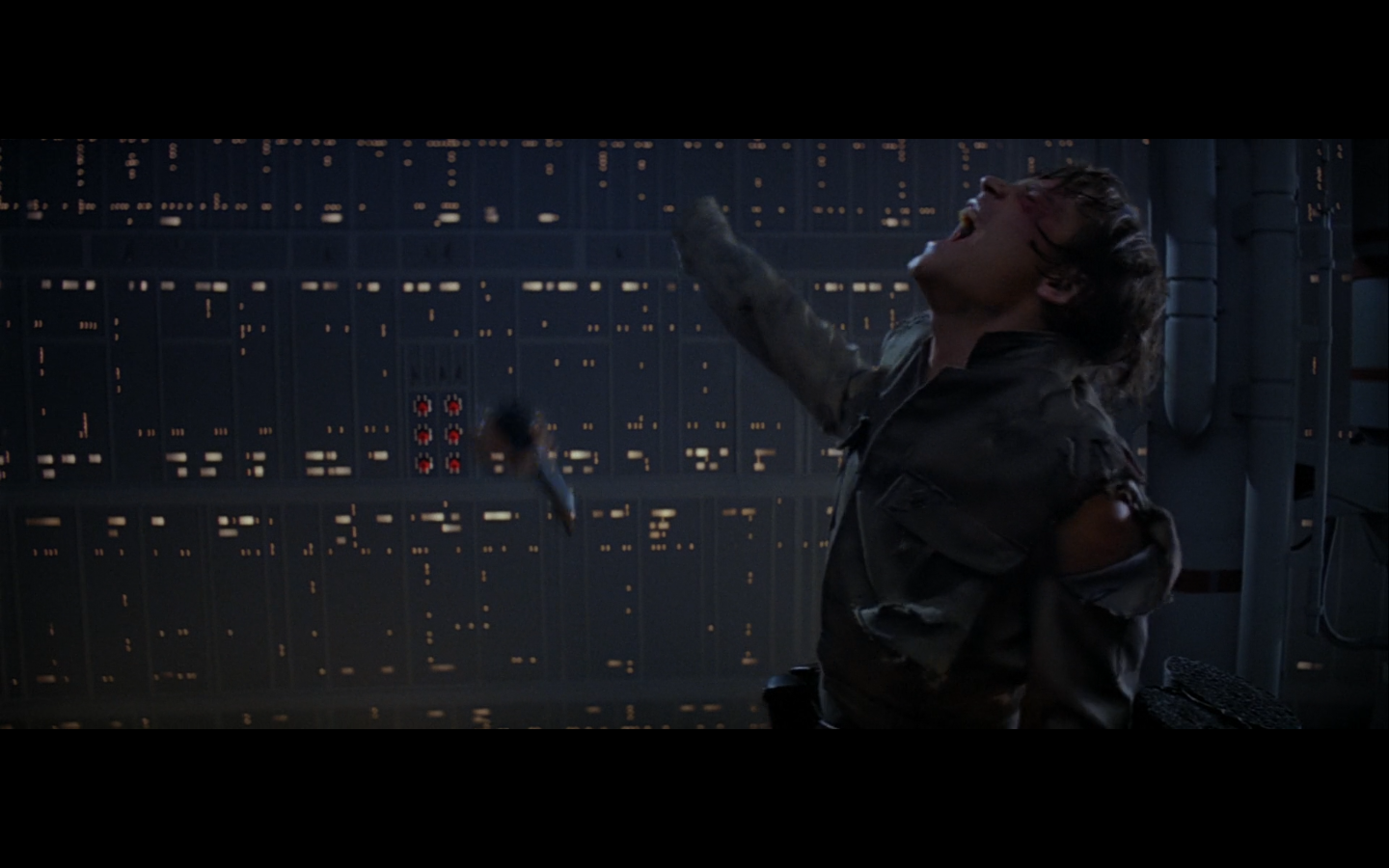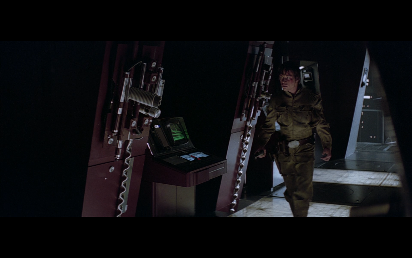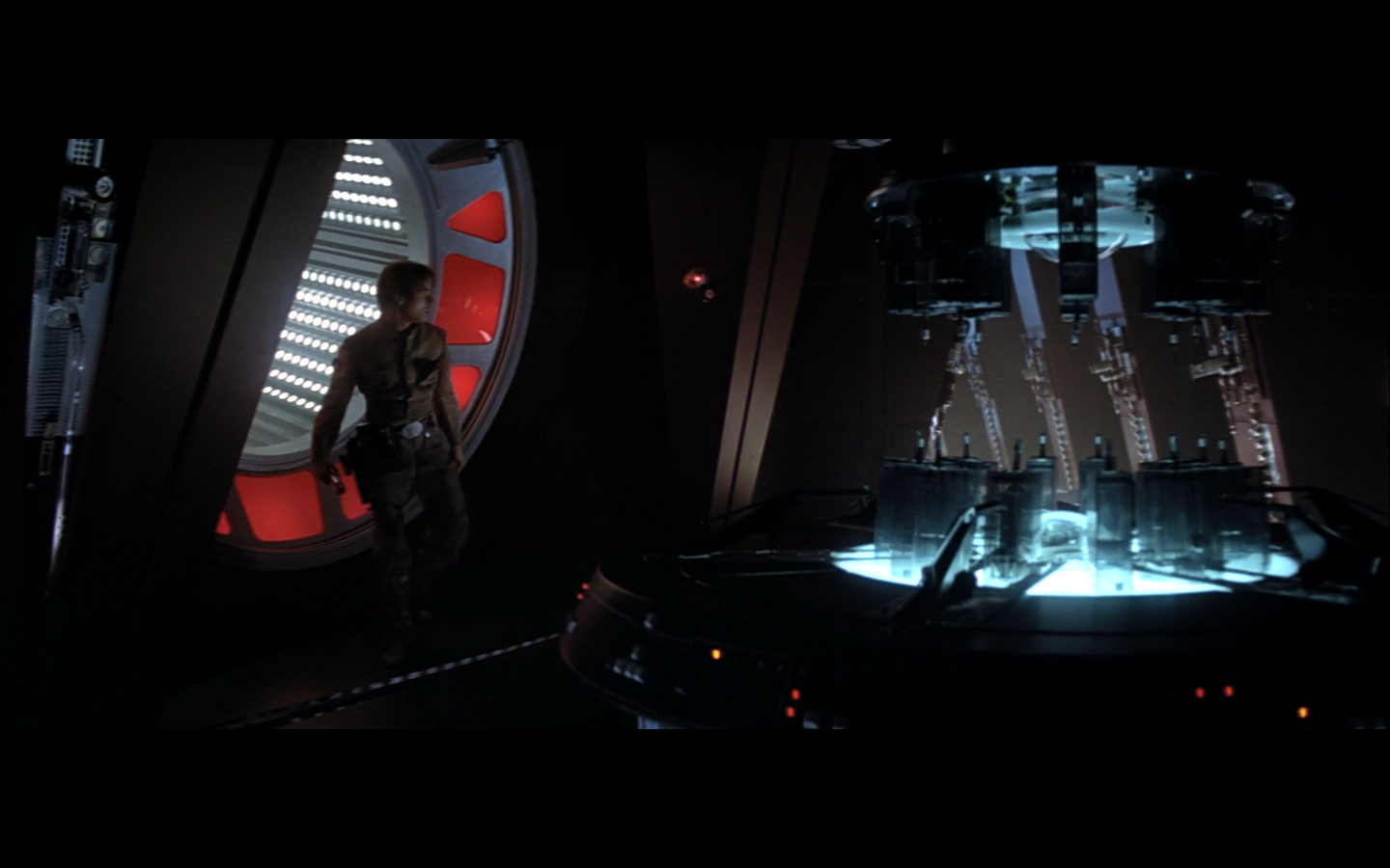 This is what I was talking about in the first article of the franchise, when Leia’s programming R2 which what appears to be a floppy disk. Some of it is surely that they don’t have the time or the technology to adequately make what they could imagine. But a big part of it is that in imagining the future, we simply take what we’ve got and imagine something a little better. Like early 20th-century portrayals of the distant future always have 747-sized biplanes and shit like that. It’s hard to say what the next step will be in any given development — think about Matrix Reloaded, when they’re coming into Zion, and they show the control room. It’s all white and there are huge holo-monitors and people are pressing buttons in midair and swishing them around and stuff. That looked futuristic then, but now they do that shit on CNN. You have to figure it’d be like…neural implants where you control the screen functions by blinking or looking in certain places. Although that’s now happening with the Google Glass, so…I guess the conclusion is that you can’t really predict a full paradigm shift in technology that far out, so it’s hardly worth trying. We’re left with buttons.