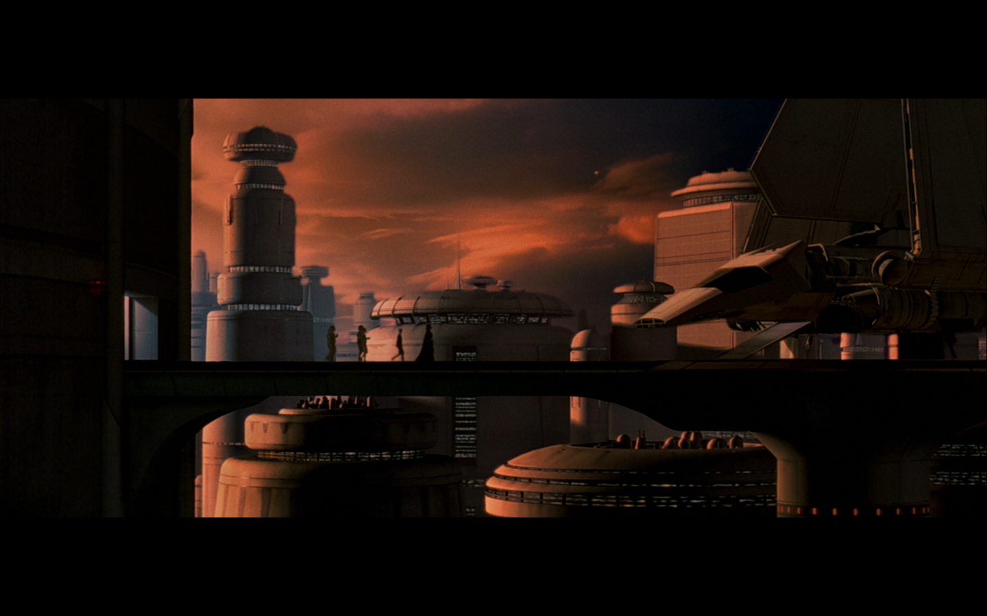 Something I’ve always noticed about Lucas’ imagined civilizations — look at how clean and homogeneous this is. It’s pretty much everywhere but Coruscant (and sort of Mos Eisley), but all the buildings look vaguely the same and there are just thoroughfares of empty space and walkways and stuff. I don’t see any neon lights. This is a huge city with probably millions of inhabitants. Look at this. How do you know where you’re going? Where are the pizza places? How are these blocks laid out? It’s a very abstract approach to city development, and in spite of how crisp and pretty the images look, it feels sort of lazy and difficult to relate to. I’ll come back to this when we get to Phantom Menace, but Theed (Naboo’s capital city) is exactly the same. It’s gorgeous, and they clearly went to great lengths to create a desirable visual aesthetic — but all the buildings are indistinguishable in terms of function. They’re having their battle in the street, and I’m wondering, “Is this a residential district? Are these shops? Could they be government buildings?” There are no people, no signs, no evidence of any activity whatsoever. They did a great job building models of cities, but finished without thinking to populate them with real people.