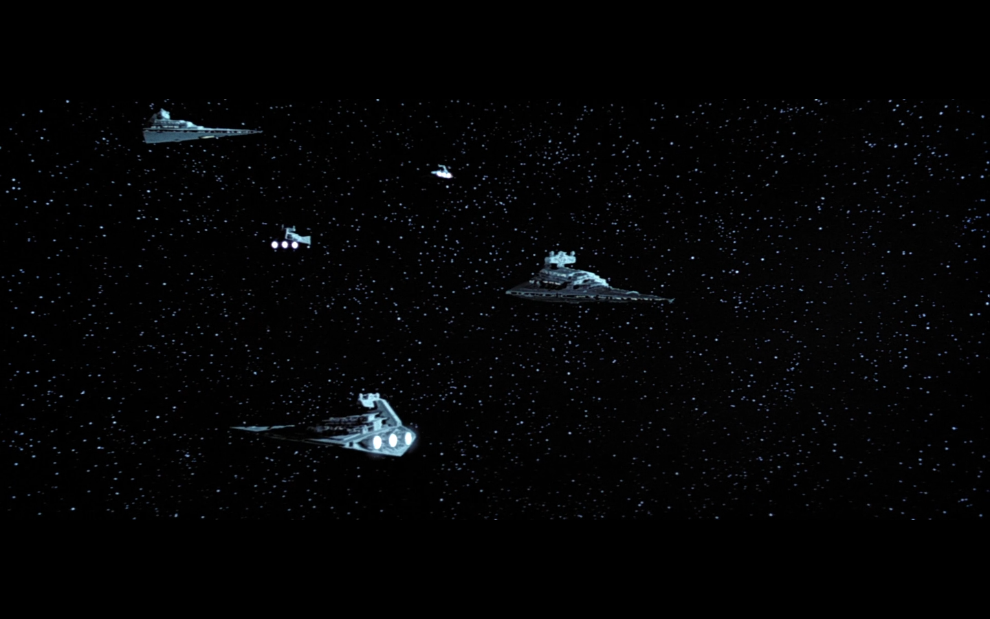I’m not sure one really appreciates how abstract this shot is during the film. These ships are in no real formation and aren’t even pointing in the same direction. There’s no order to their placement whatsoever. When you consider that there’s no tasks that would require them to just float around randomly like that, this shot makes no sense and exists purely for looking awesome. I though this is what the pattern would look like if Andy Warhol had painted a Star Wars painting.