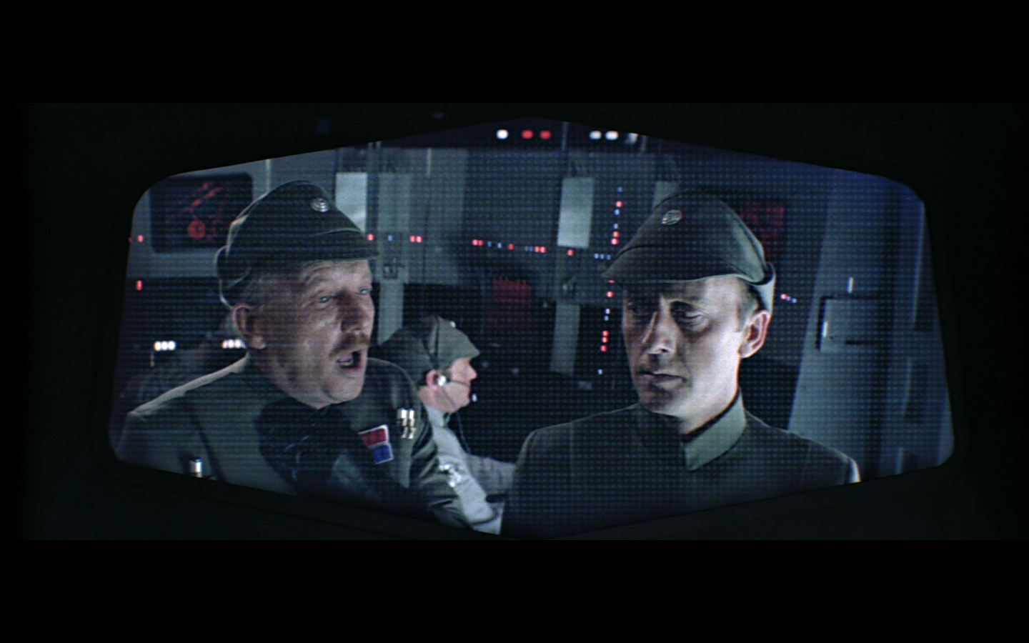 I insisted on this one for the look. That look is amazing. This guy is actually one of my favorite minor characters, because he knows how to play the game, more or less. He knows he’s dealing with Vader, so you just tell him shit straight and never outwardly show how terrified you are of being choked at any moment. He just does his job and keeps all the conversations short and sweet. He’s like Anthony Hopkins in Remains of the Day. “Crush the Rebels? Very well, sir. Will that be all for now?” Very subdued. But this shot is the best because a dude is being choked through a video call right next to him and he’s left to watch. What face do you make? THAT face.