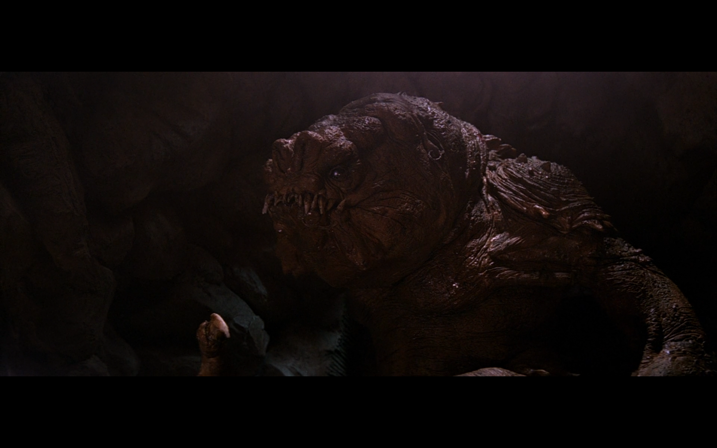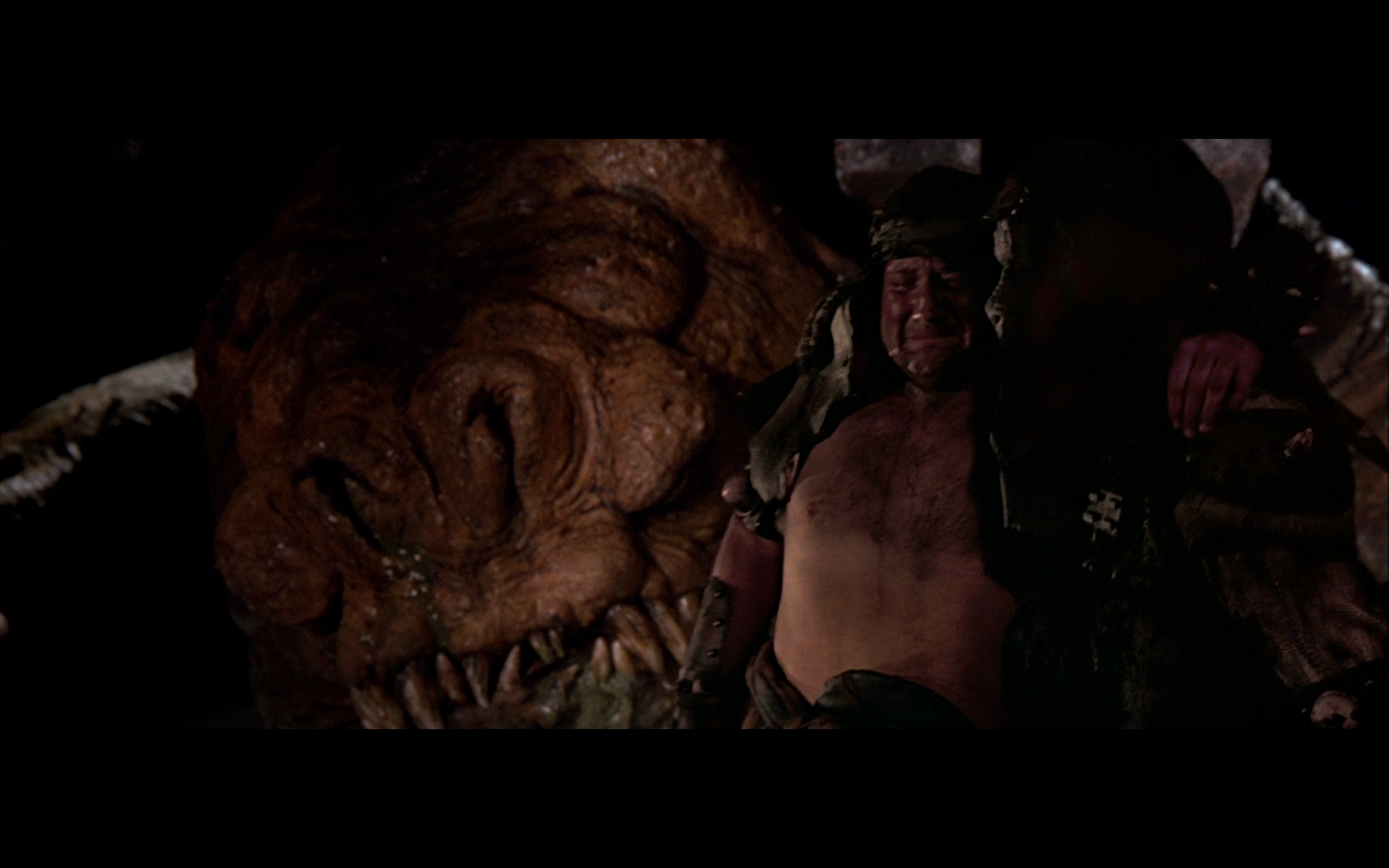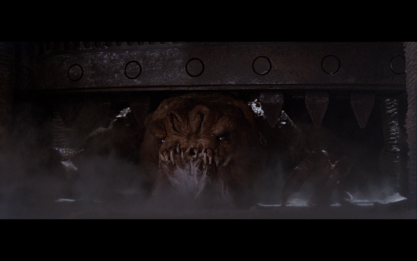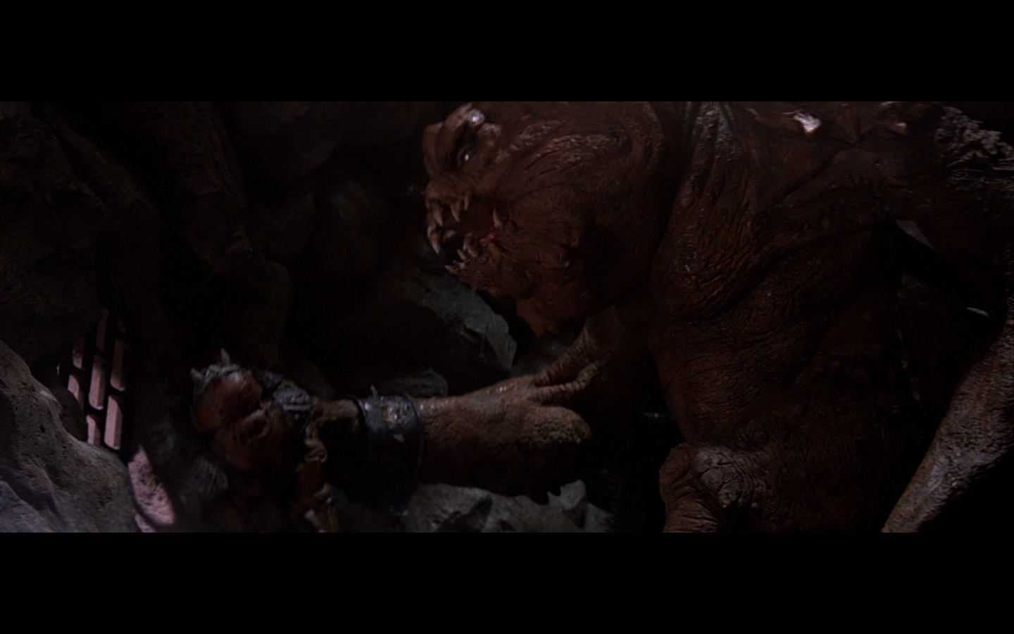 This weird, tribal man who runs in to see if the rancor is actually dead looks so sad. Like the rancor was the source of all their fun and how life will never be the same now that it’s gone. It’s sort of like Belushi in Animal House when they drop the bottles of booze.