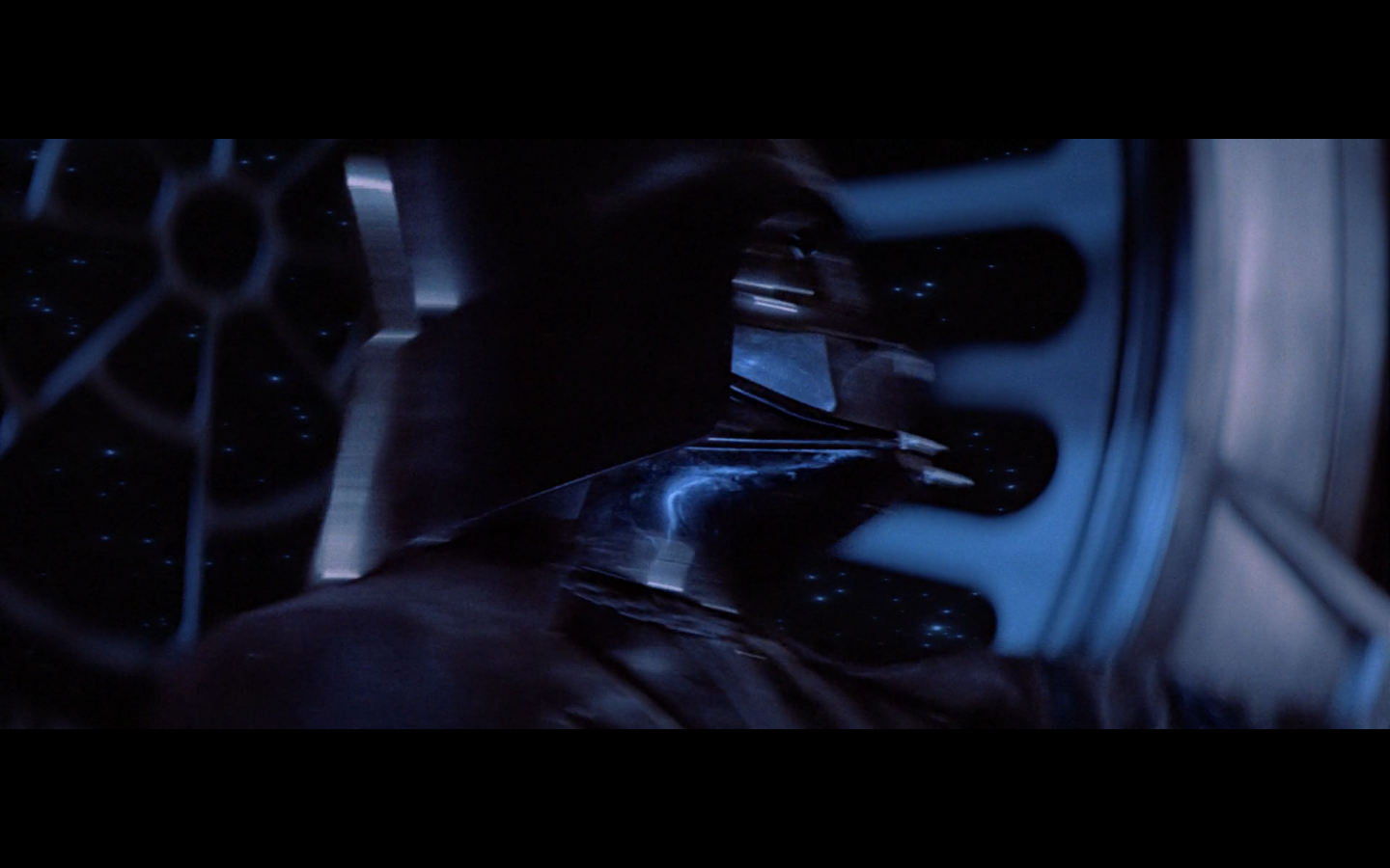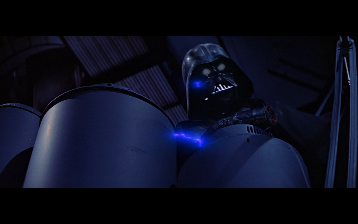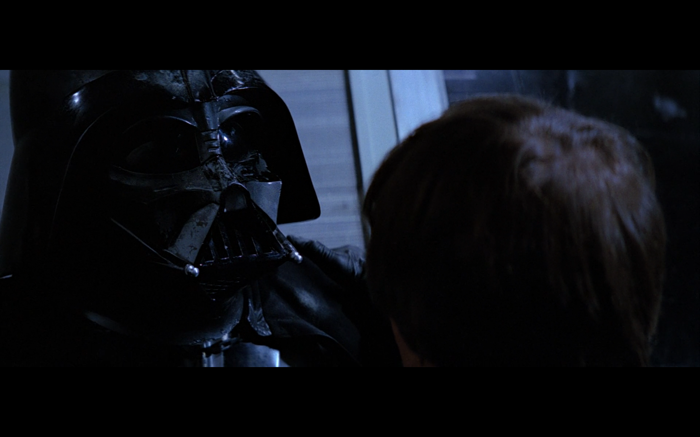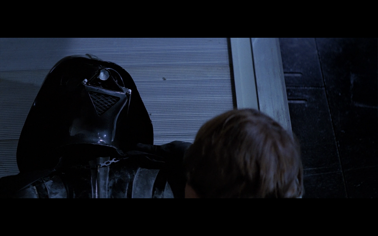 Okay, you can’t not like this scene. Vader’s searching for Luke in the dark, which gives him time to say shit that makes Luke feel conflicted. We get a visual representation of the two sides at battle in him with the shot of his face half covered in shadow.
