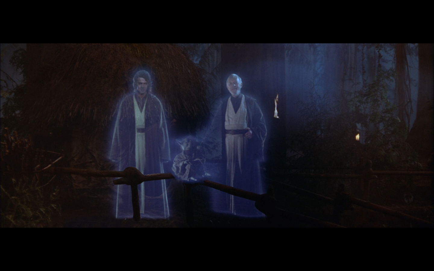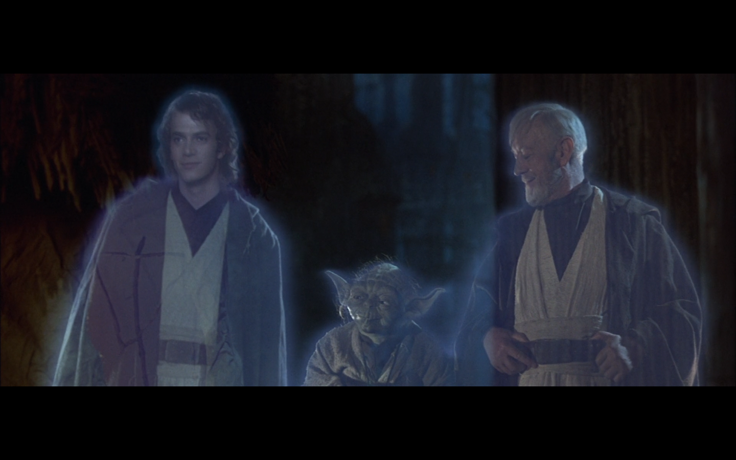 What I don’t get is how he can show up later as part of the Force. Shouldn’t he be horribly burned or something? (From either one. This one or the original one.) The other ones just disappeared. How can he (and Qui-Gon, for that matter) be part of the Force if their bodies didn’t fade away like Obi-Wan’s and Yoda’s?