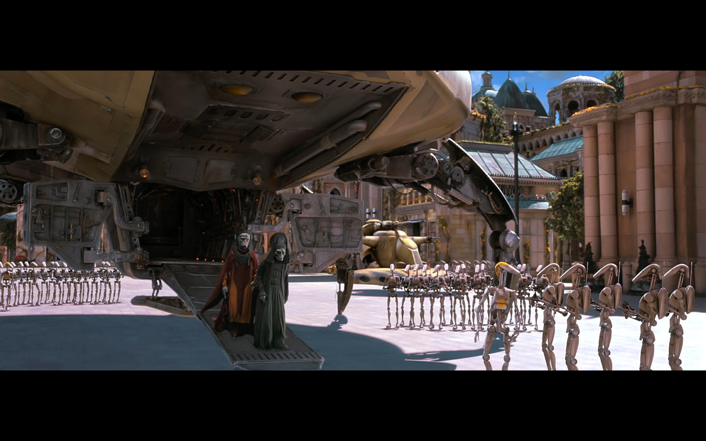 He says it’s a ‘victory.’ Is it victory when you literally just waltzed up to the palace and didn’t fire a shot? Gunray’s walking out of his ship like they’re about to go hit the links. I wouldn’t call it ‘victory’ so much as – something was there for the taking and you took it. Yet again, I want to point out that this was a 20 second scene that just established that they’ve taken the capital with no action involved.