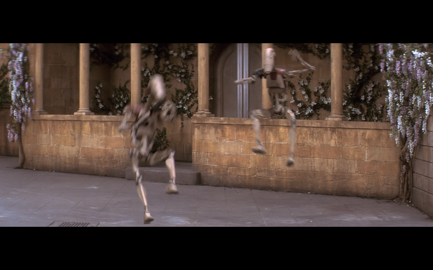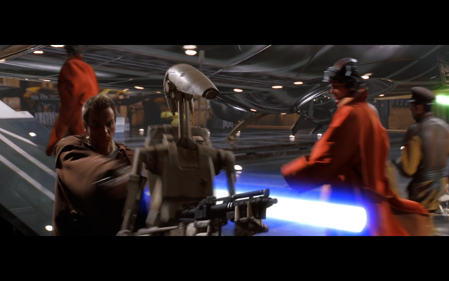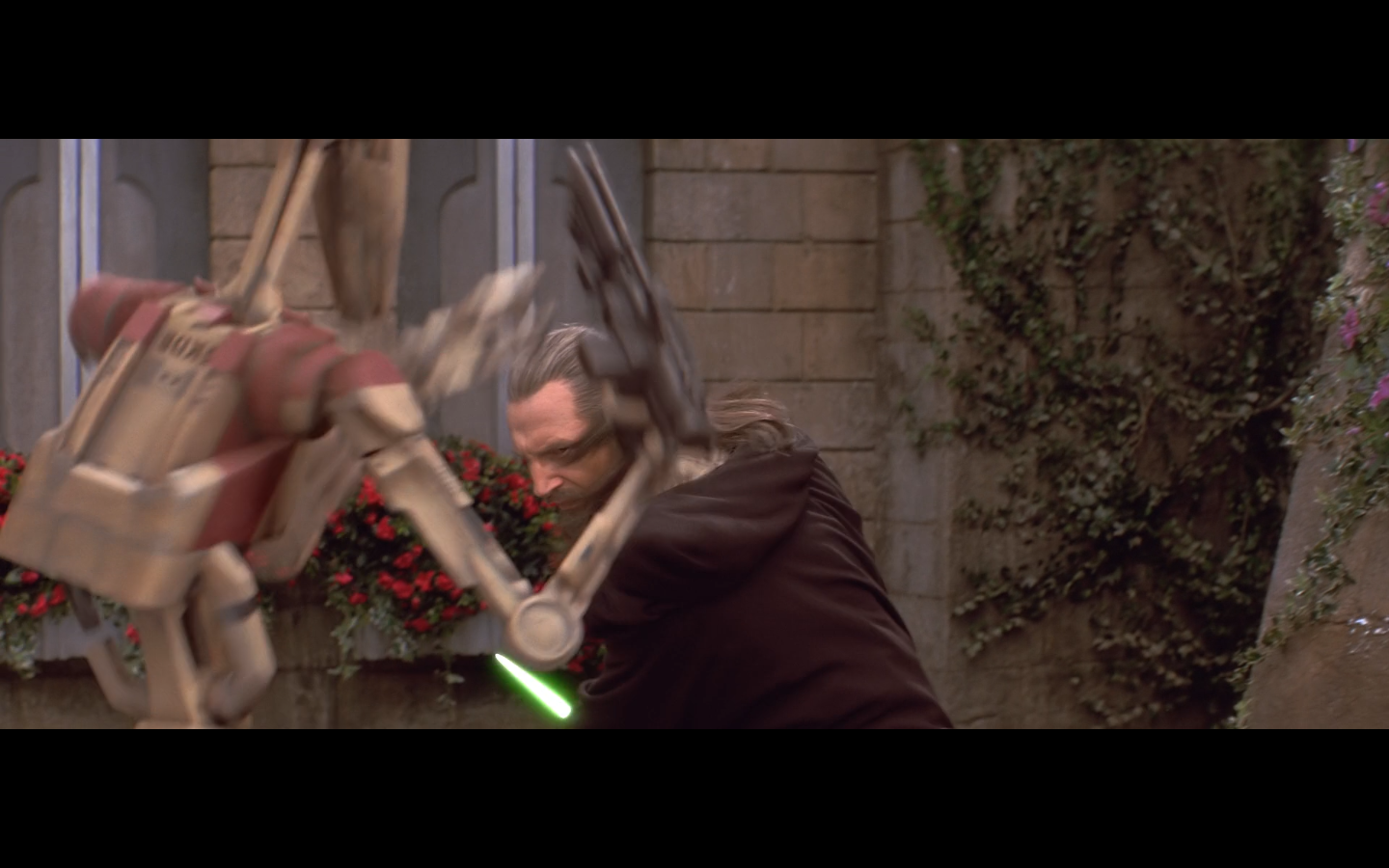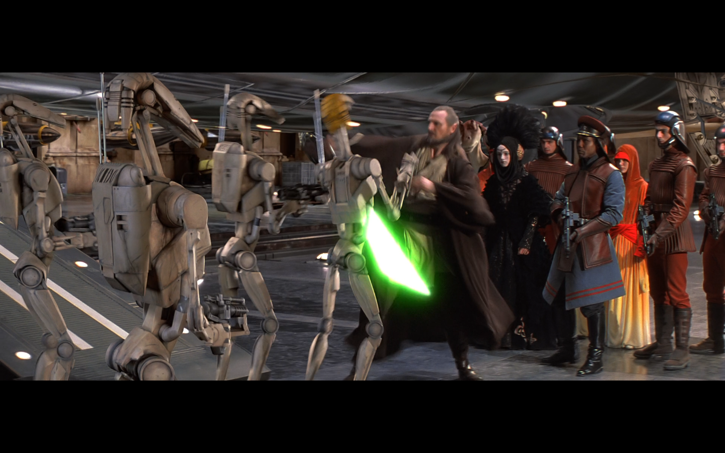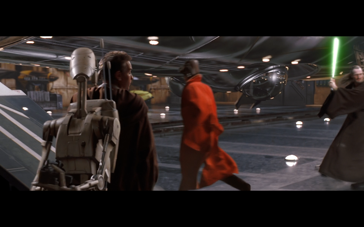 Here’s a question – we can see it in this shot – Qui-Gon is literally starting to spin around only no one is in front of him. Why would he do that? Wouldn’t you only spin for fluid motion when surrounded by people and in close quarters? He’s literally spinning just to spin. This reeks of ‘choreographed.’ A real killer wouldn’t do that.