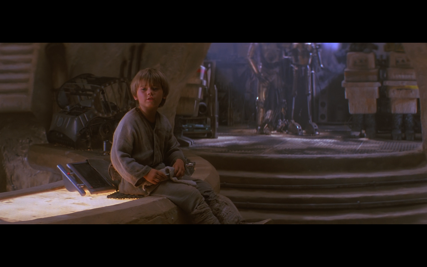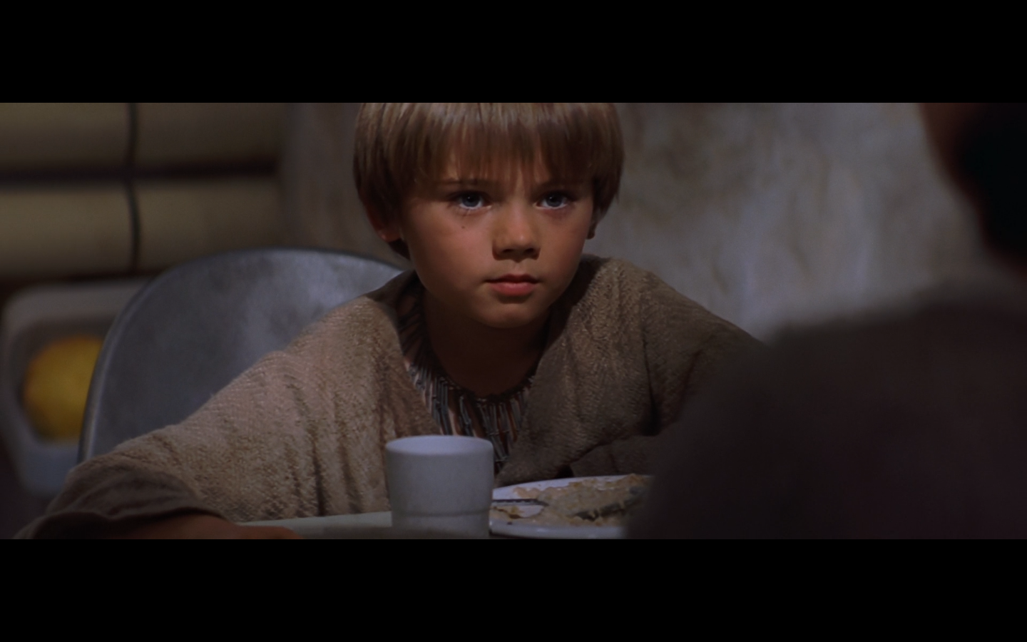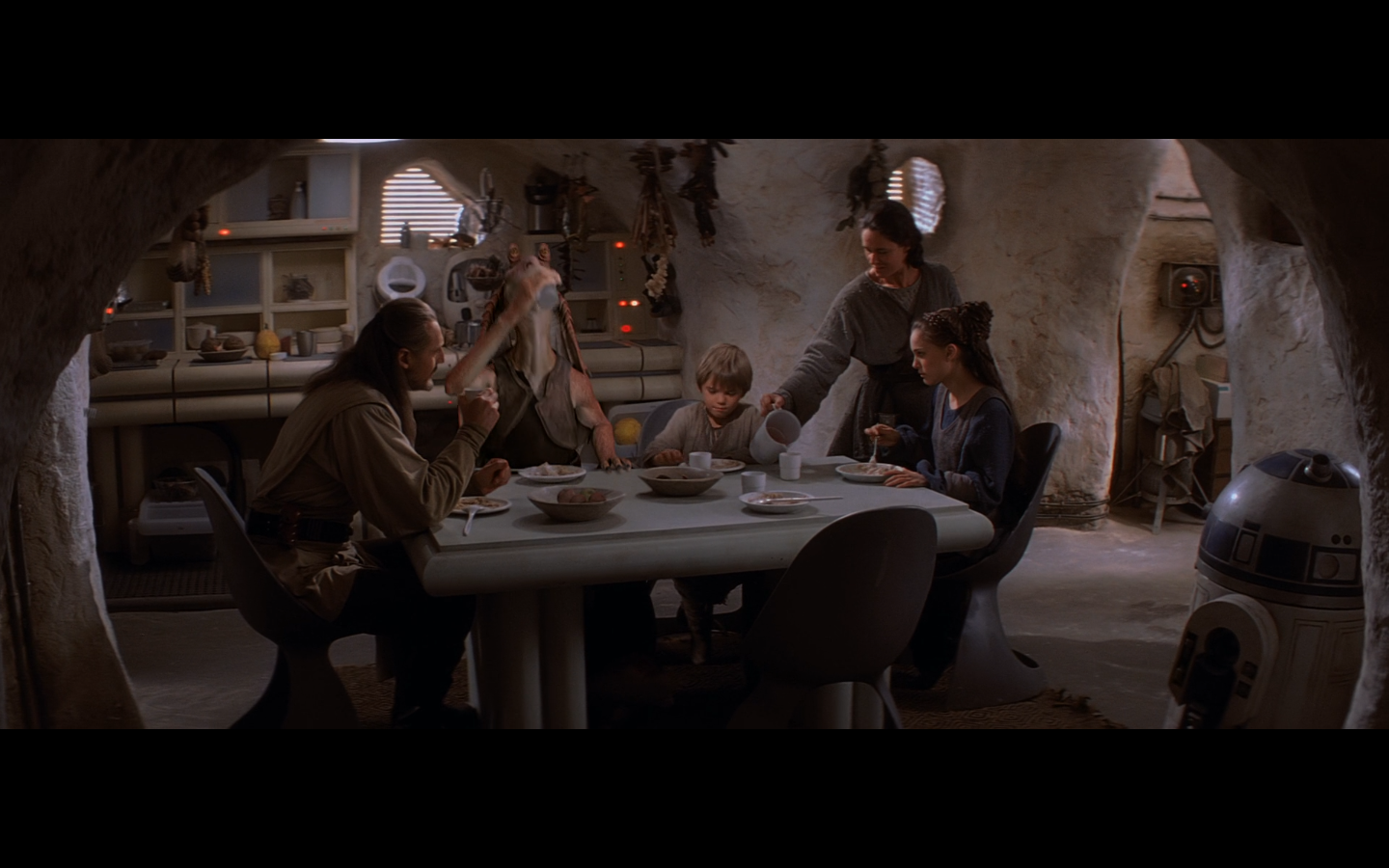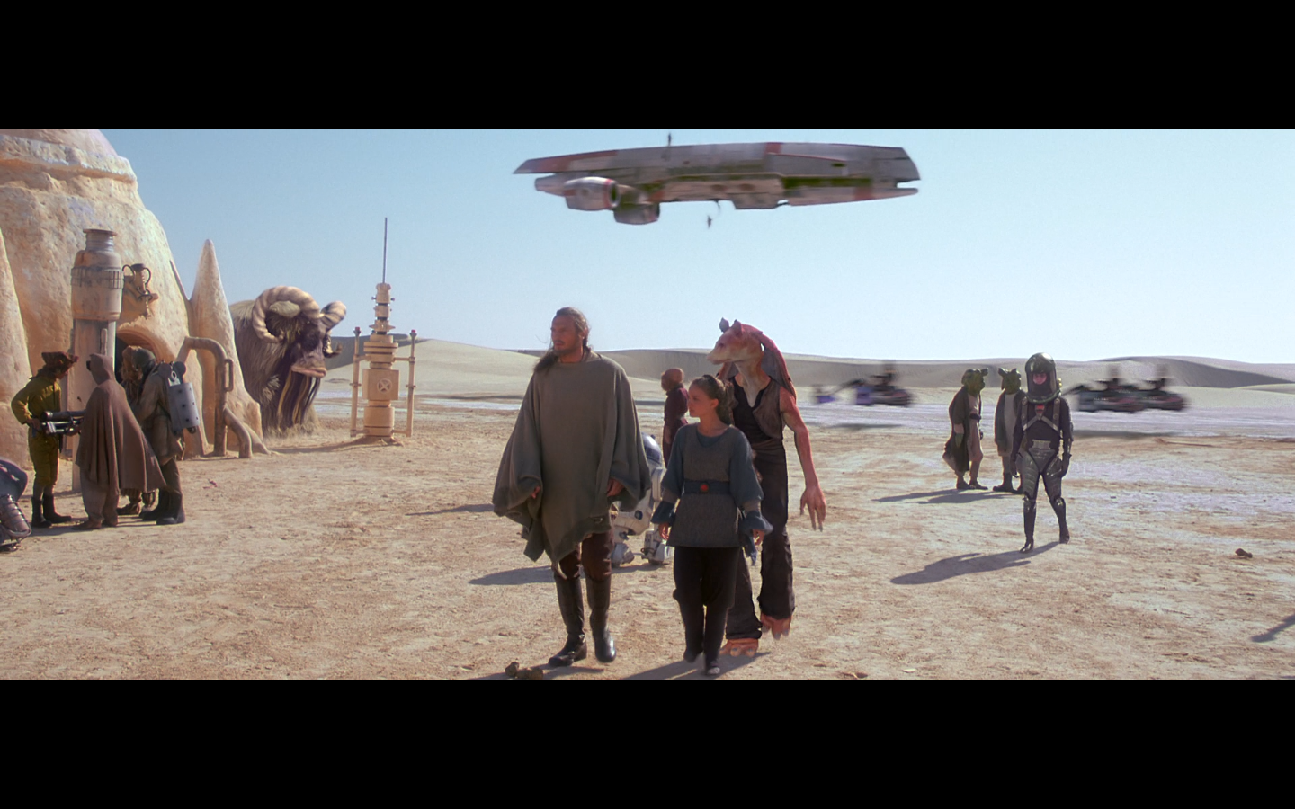 What’s also funny here is how Anakin’s mother (whose name I haven’t even bothered to learn, because one, they haven’t said it once in the movie and because she will actually be dead soon, and I’m running with it by just not showing her in close up at all. Because her character is actually pointless for this entire trilogy and if she weren’t here, you wouldn’t even notice. Though isn’t her name like, Smee or something, like the dude in Peter Pan? I feel like her name is something dumb like that.) has this moment of, “I don’t like it when you pod race,” because Lucas grew up in the 50s, and you have to have the mother say that. It’s like when all those 50s guys were drag racing in the movies. You have to have the parents not like it. But what’s funny is that she’s like, “I nearly die whenever Watto makes you do it,” and then you realize, “Oh, right… they’re slaves, and this guy is making him do it.” Which is hilarious and fucked up at the same time.  And also funny that he loves it. And fortunate, too.