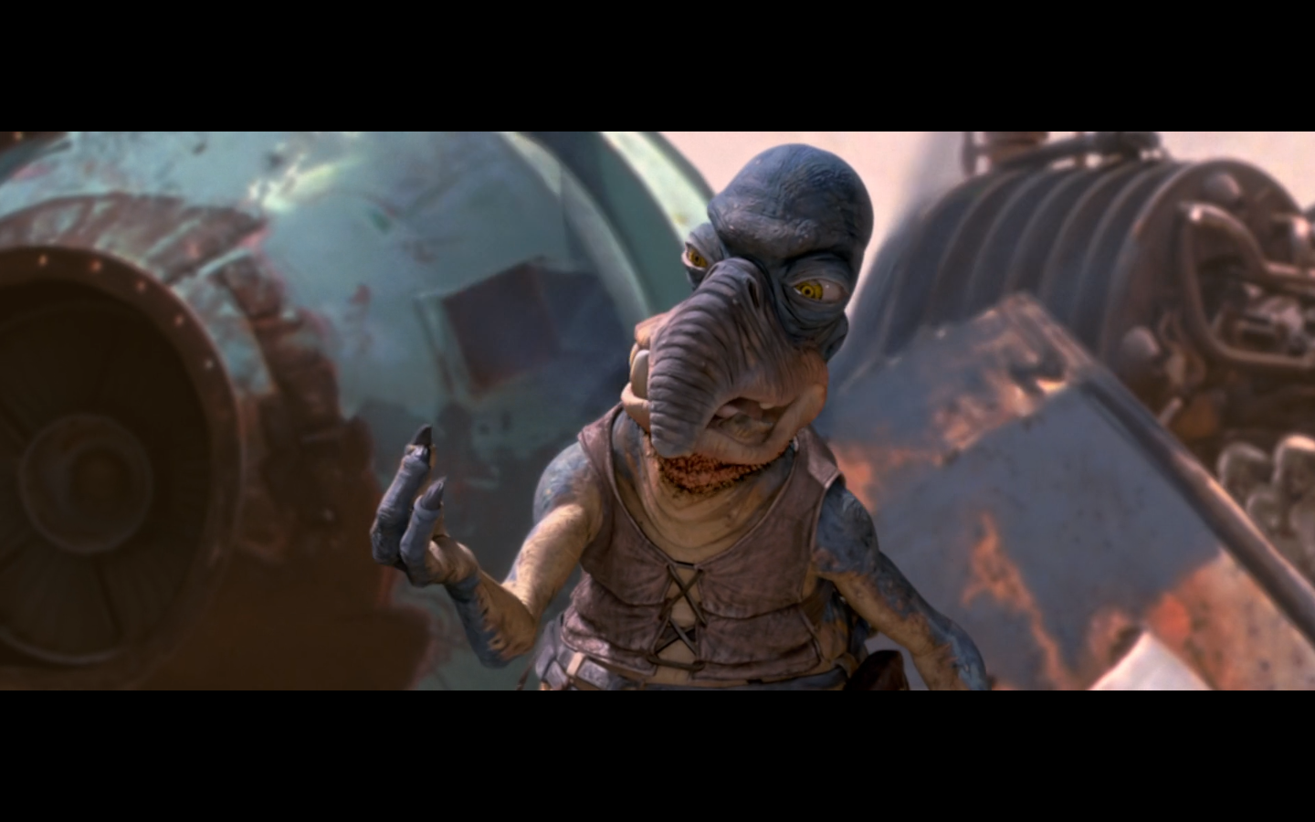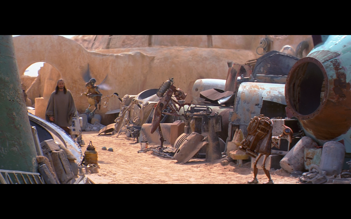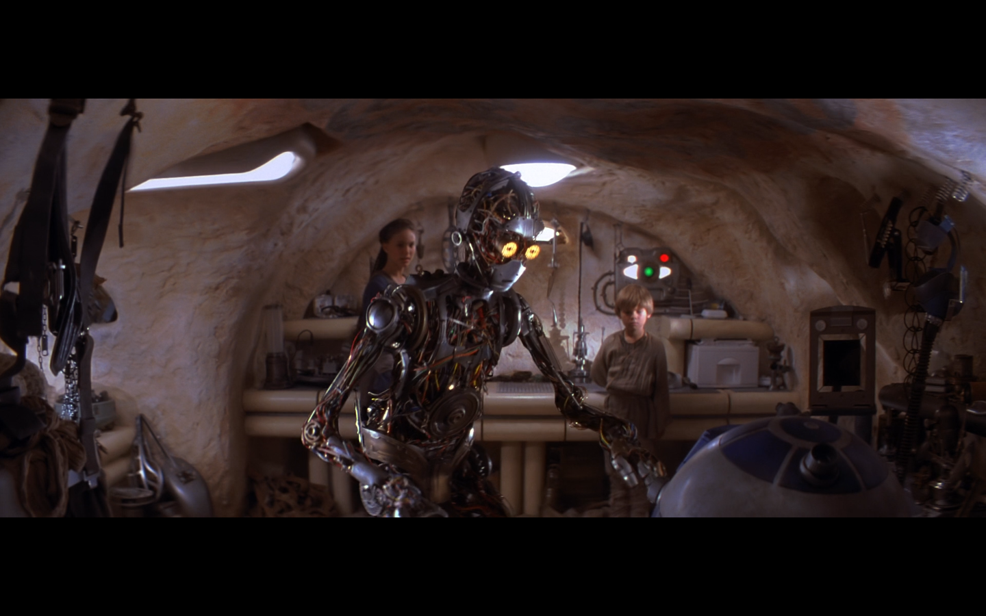 What’s also funny here is how Anakin’s mother (whose name I haven’t even bothered to learn, because one, they haven’t said it once in the movie and because she will actually be dead soon, and I’m running with it by just not showing her in close up at all. Because her character is actually pointless for this entire trilogy and if she weren’t here, you wouldn’t even notice. Though isn’t her name like, Smee or something, like the dude in Peter Pan? I feel like her name is something dumb like that.) has this moment of, “I don’t like it when you pod race,” because Lucas grew up in the 50s, and you have to have the mother say that. It’s like when all those 50s guys were drag racing in the movies. You have to have the parents not like it. But what’s funny is that she’s like, “I nearly die whenever Watto makes you do it,” and then you realize, “Oh, right… they’re slaves, and this guy is making him do it.” Which is hilarious and fucked up at the same time.  And also funny that he loves it. And fortunate, too.