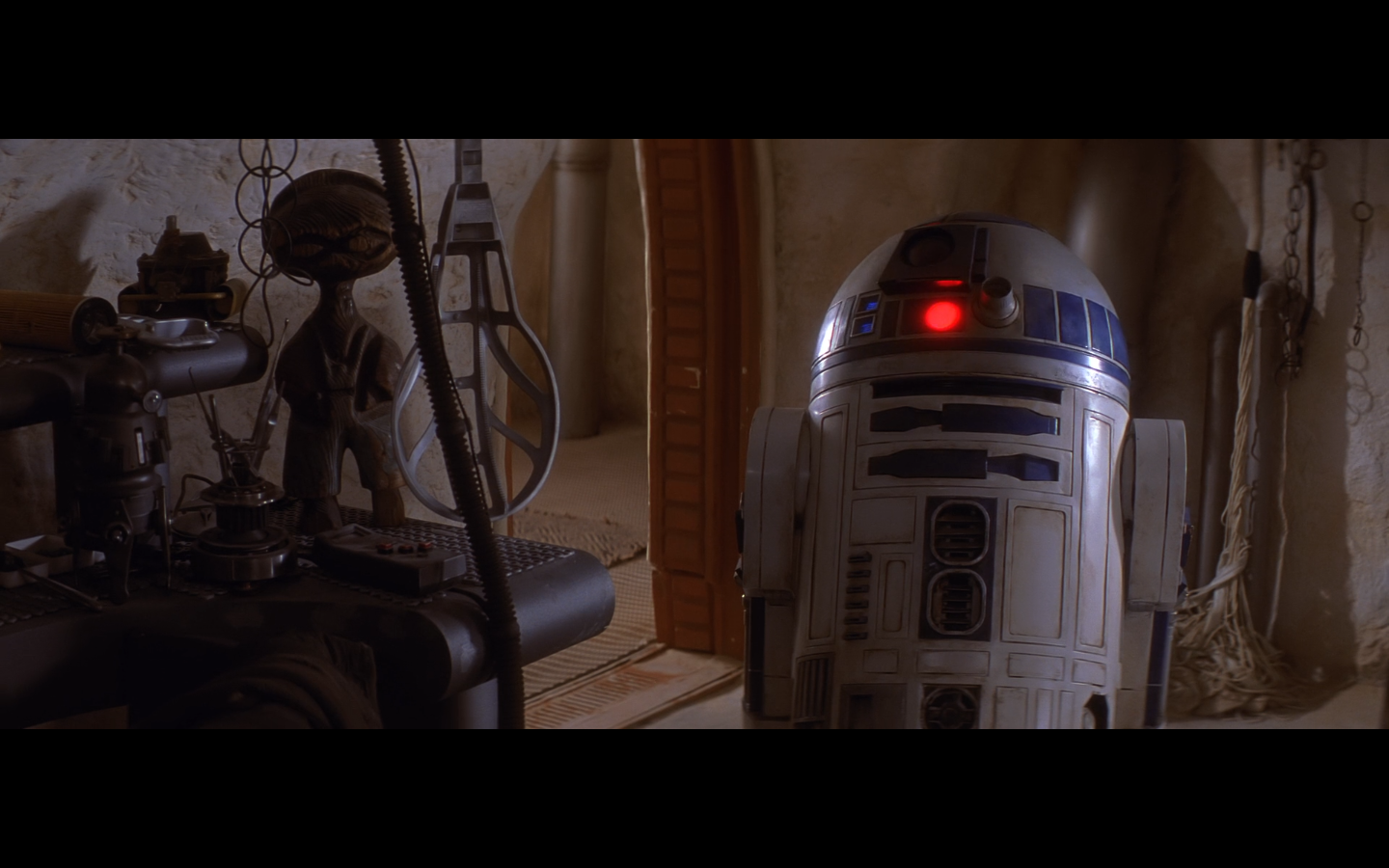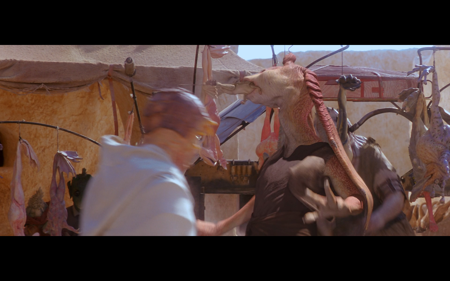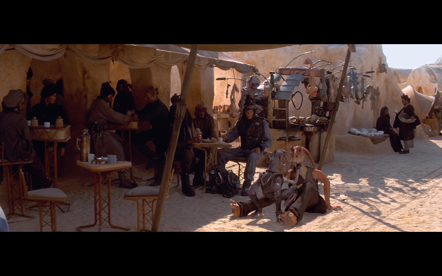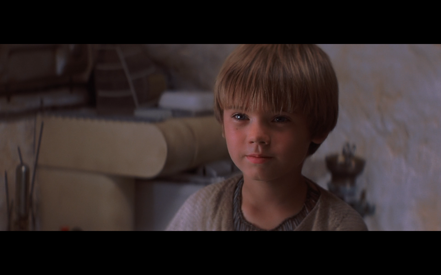 What’s also funny here is how Anakin’s mother (whose name I haven’t even bothered to learn, because one, they haven’t said it once in the movie and because she will actually be dead soon, and I’m running with it by just not showing her in close up at all. Because her character is actually pointless for this entire trilogy and if she weren’t here, you wouldn’t even notice. Though isn’t her name like, Smee or something, like the dude in Peter Pan? I feel like her name is something dumb like that.) has this moment of, “I don’t like it when you pod race,” because Lucas grew up in the 50s, and you have to have the mother say that. It’s like when all those 50s guys were drag racing in the movies. You have to have the parents not like it. But what’s funny is that she’s like, “I nearly die whenever Watto makes you do it,” and then you realize, “Oh, right… they’re slaves, and this guy is making him do it.” Which is hilarious and fucked up at the same time.  And also funny that he loves it. And fortunate, too.