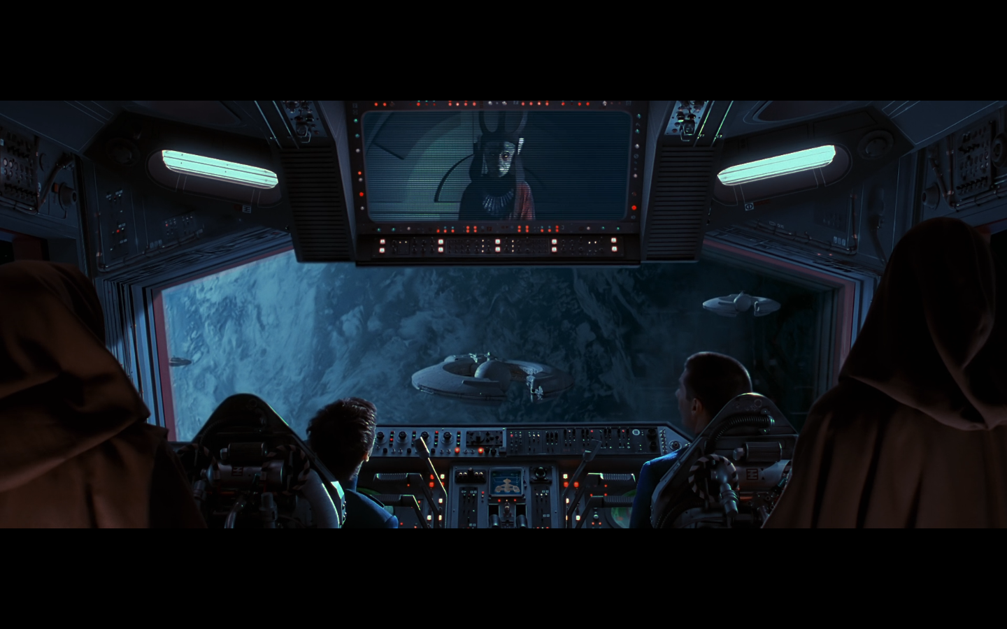 This shot has pretty much everything I like in this franchise — Windshield shots, those awesome flatscreens, that Trade Federation ship, and good old racism.